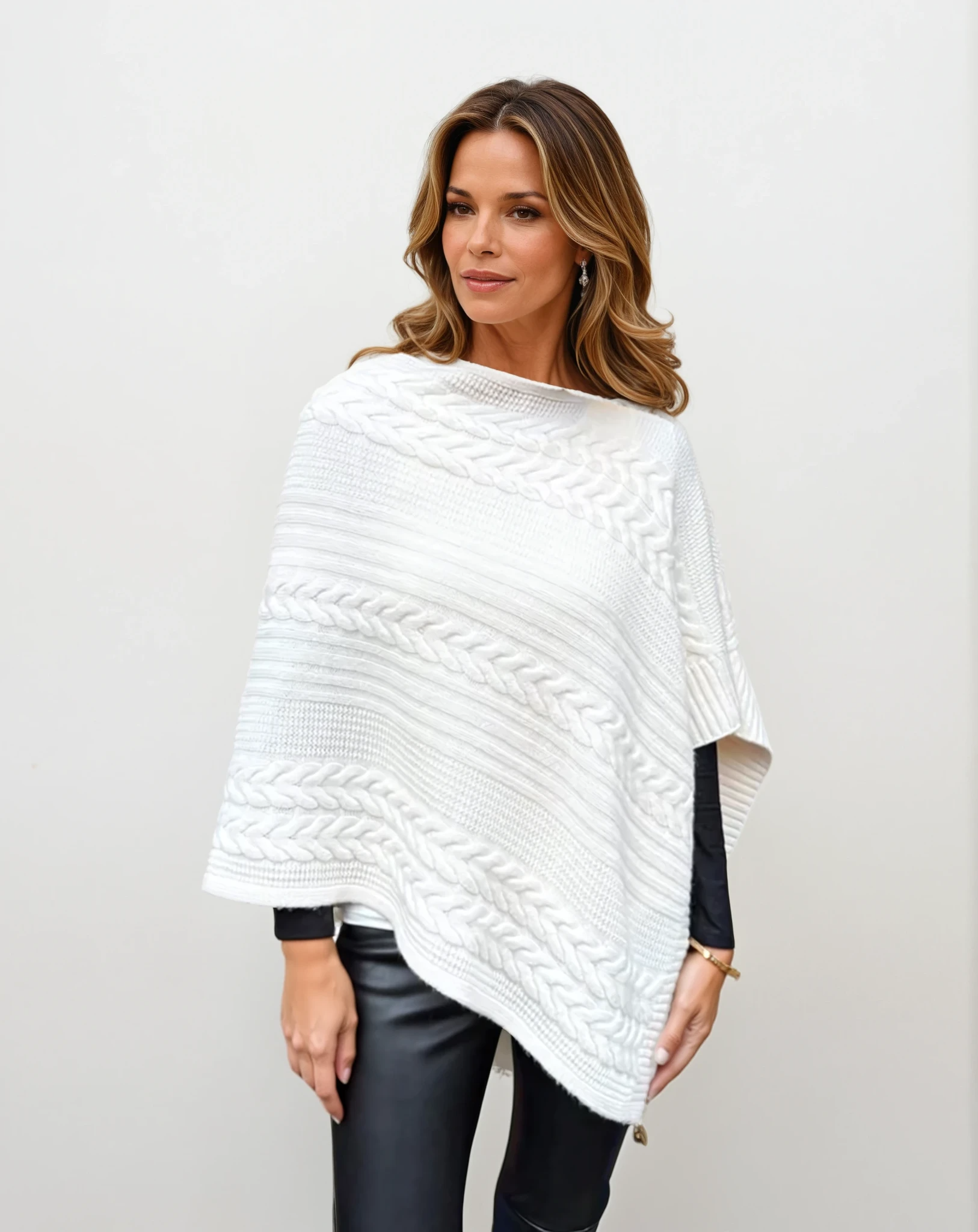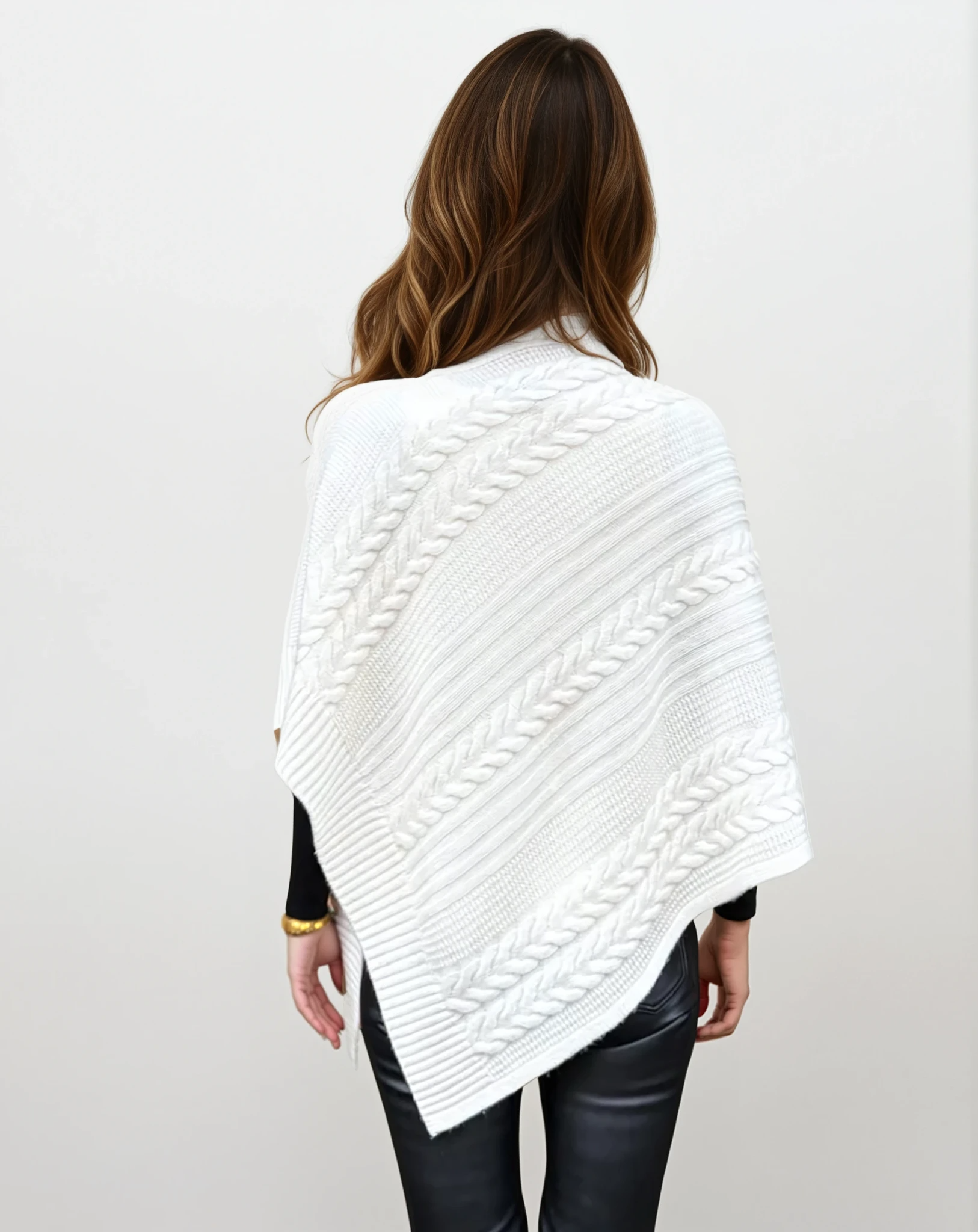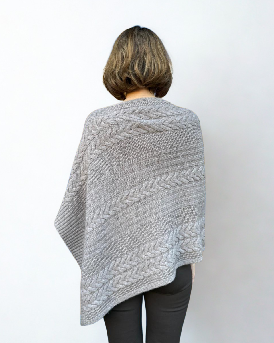 Wrap yourself in effortless sophistication with this cable-detailed poncho woven from a soft blend of wool and cashmere. Its elegant drape and intricate braid-knit border add refined texture, making it the perfect layering piece for cool days and evenings. A timeless neutral tone ensures it complements any outfit — from sleek leather pants to classic denim.