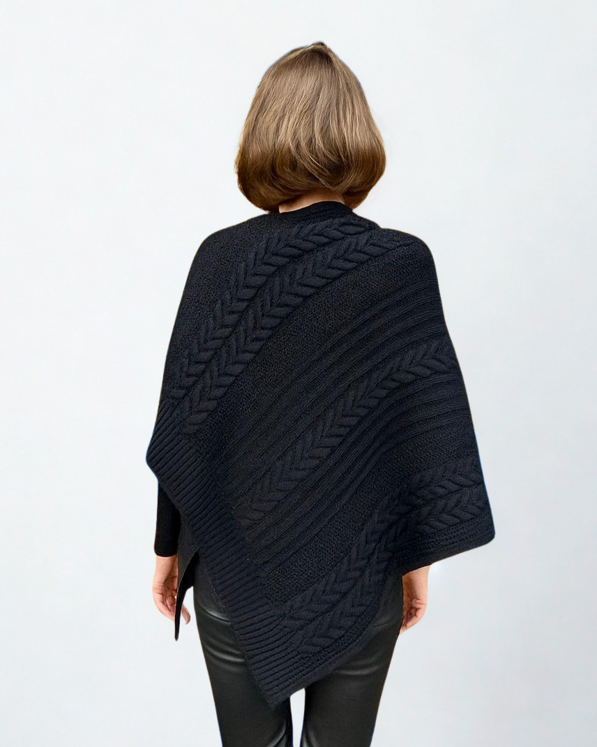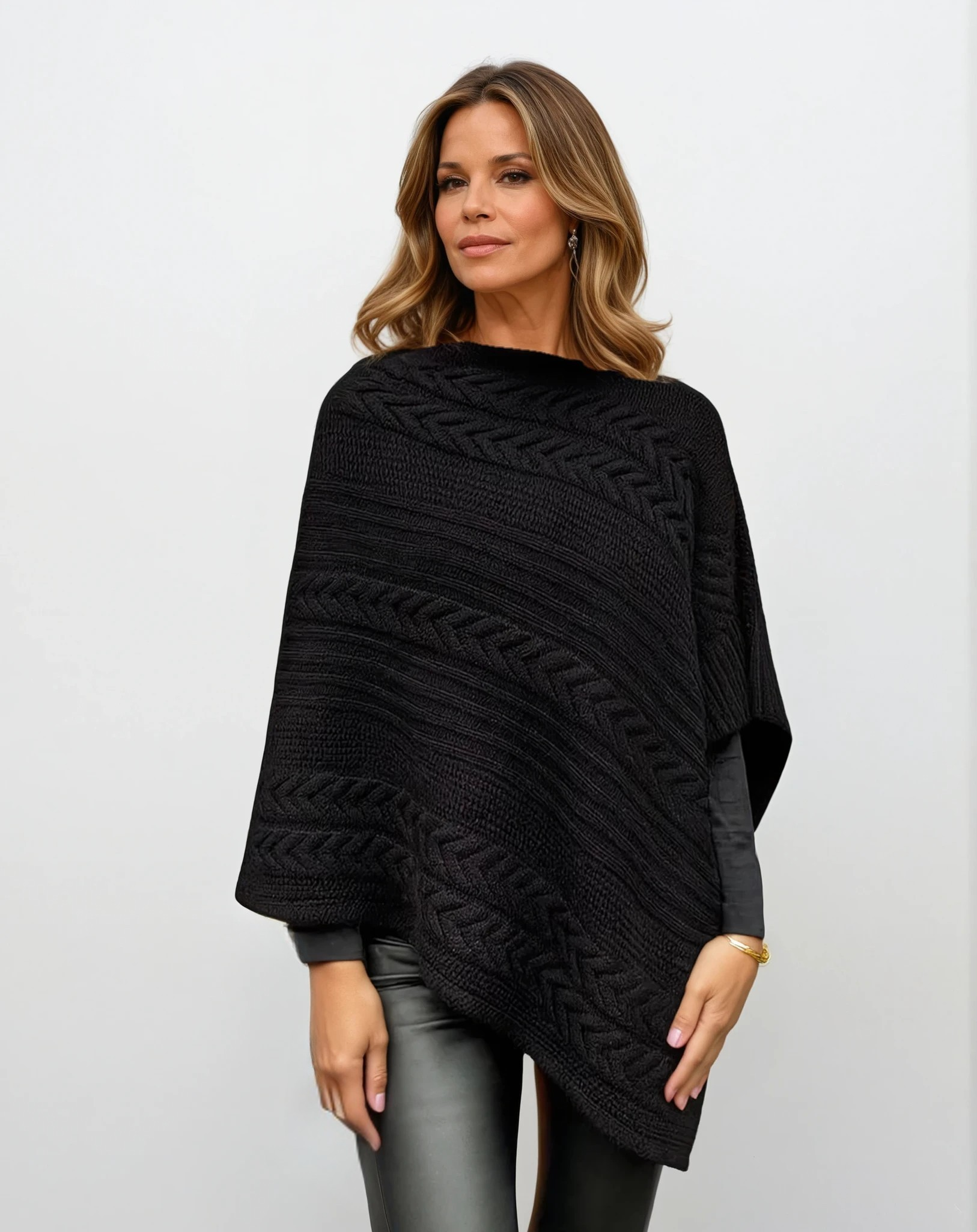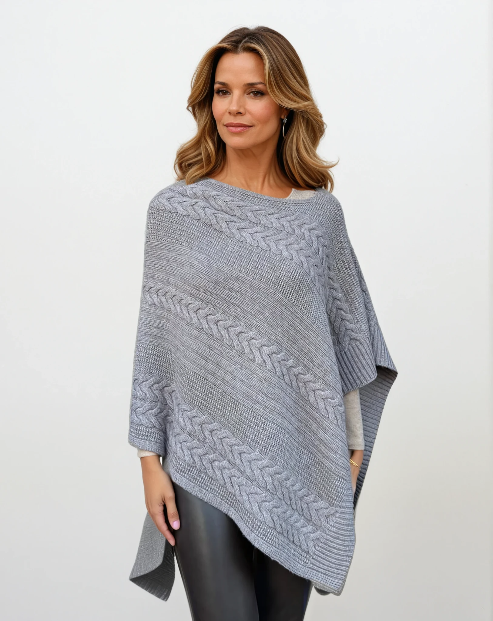 Wrap yourself in effortless sophistication with this cable-detailed poncho woven from a soft blend of wool and cashmere. Its elegant drape and intricate braid-knit border add refined texture, making it the perfect layering piece for cool days and evenings. A timeless neutral tone ensures it complements any outfit — from sleek leather pants to classic denim.
