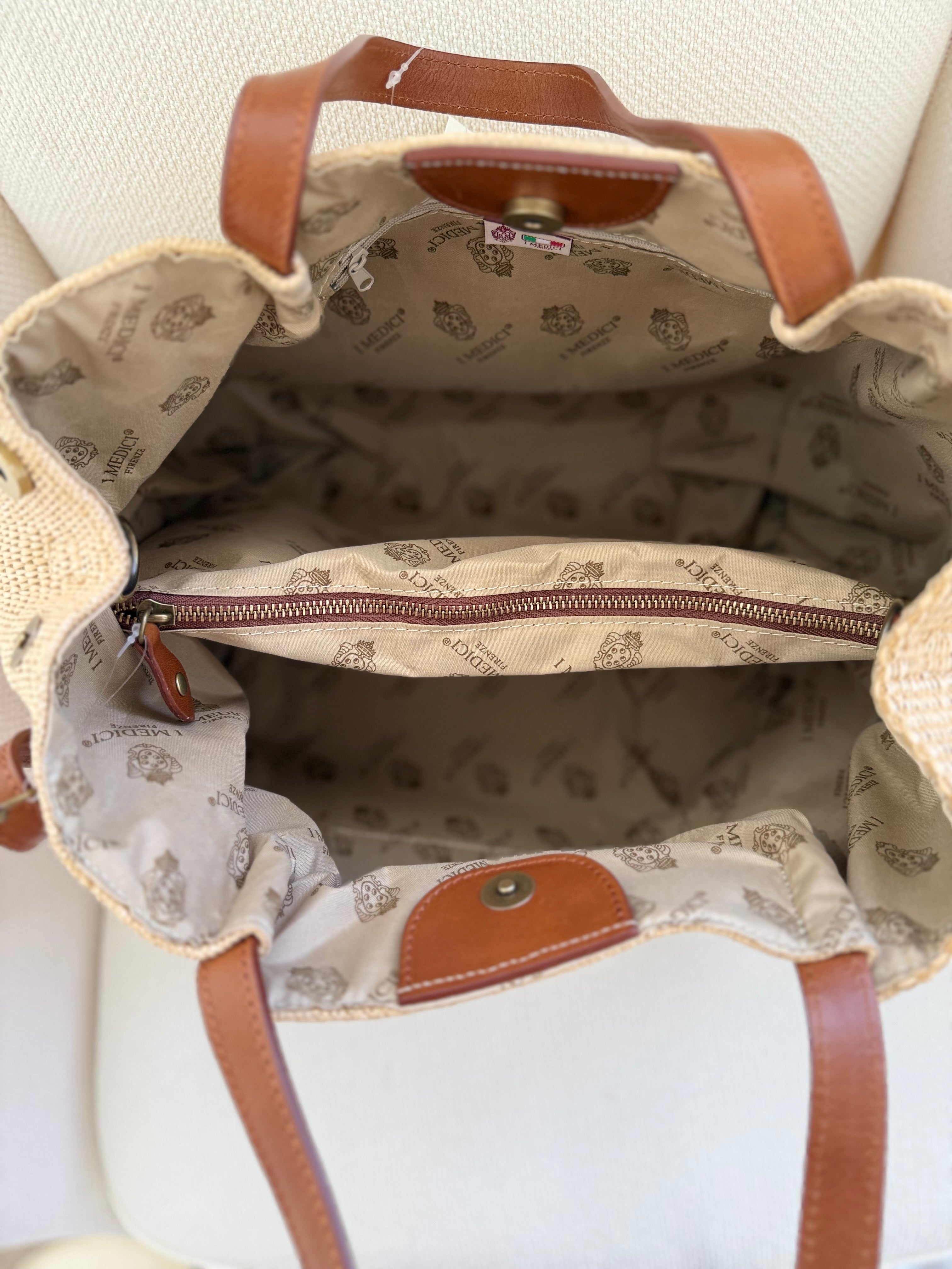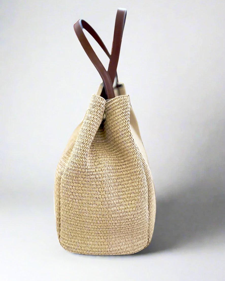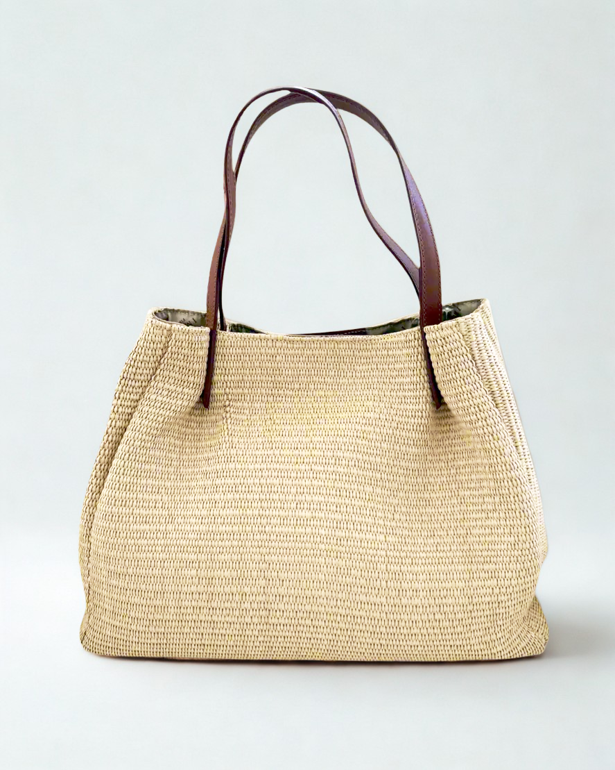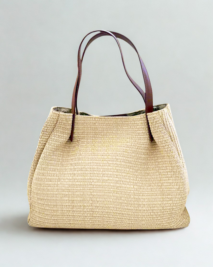 Effortlessly stylish and perfect for everyday use, this woven raffia tote blends natural texture with a spacious silhouette. Accented with slim leather shoulder straps and a soft, collapsible structure, it’s ideal for carrying your essentials in warm-weather style — whether you’re headed to the market, the beach, or the city.