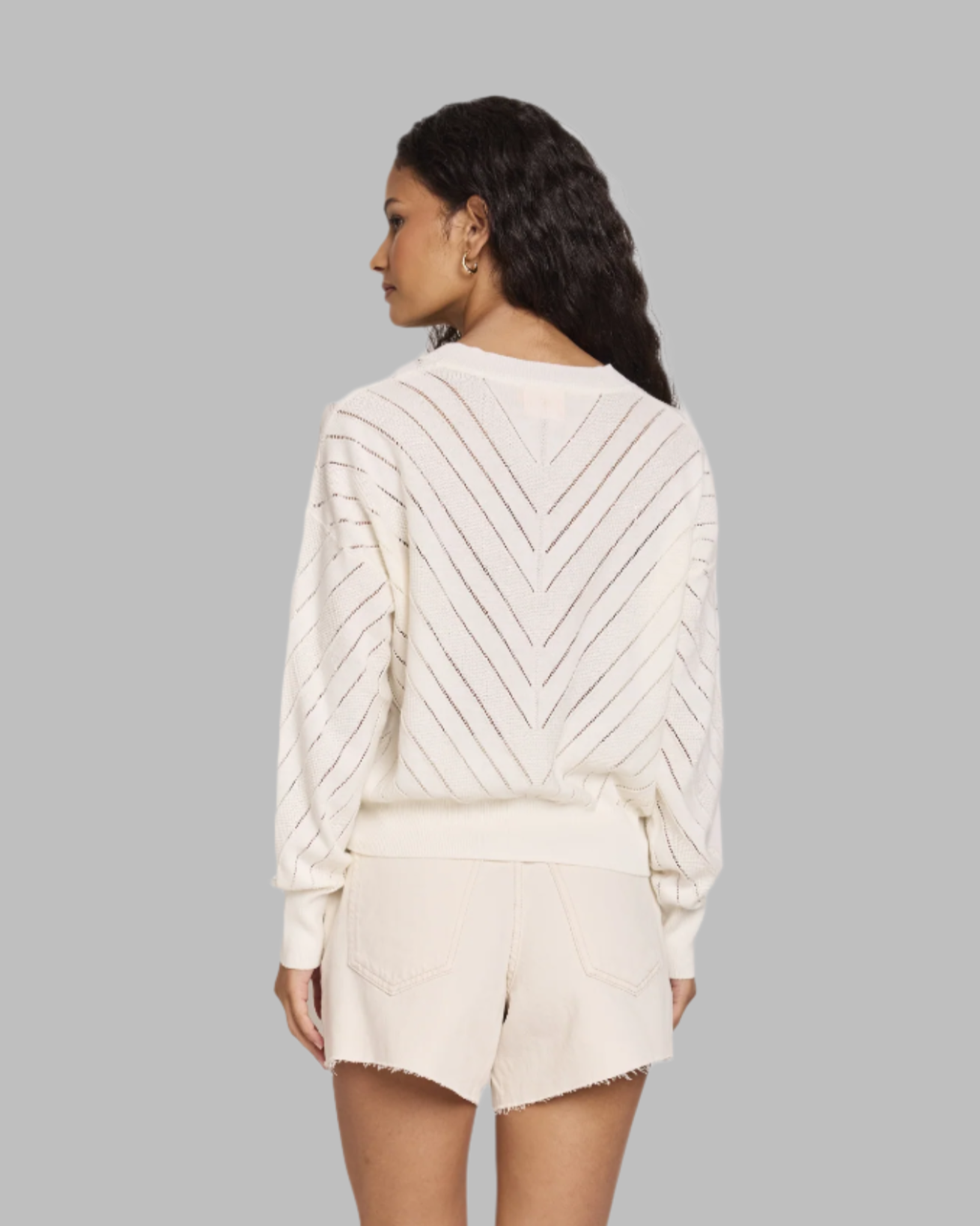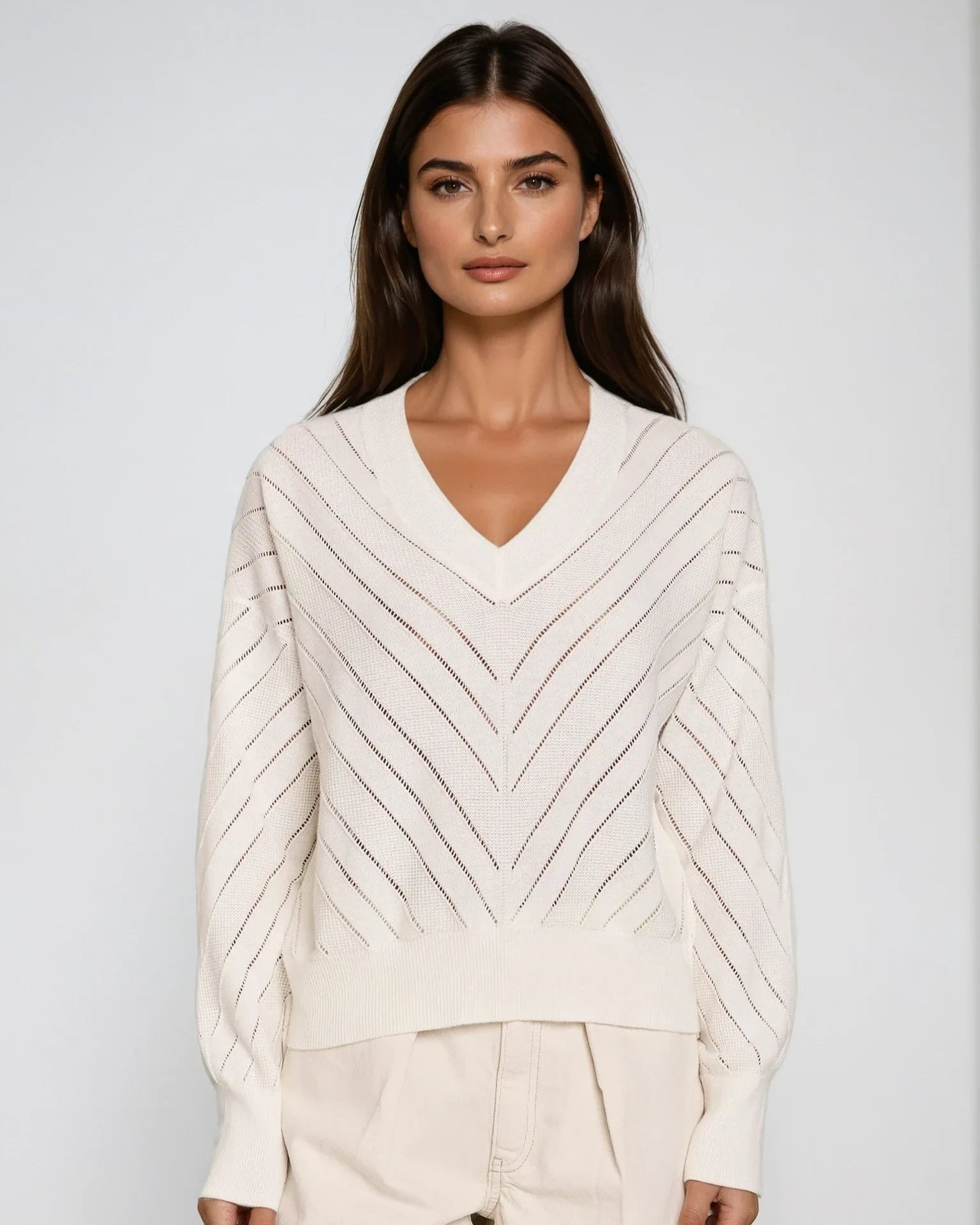A modern twist on a timeless classic. This lightweight sweater is crafted from 100% cotton and features an elegant chevron knit pattern. With a flattering V-neckline and voluminous long sleeves, it offers comfort and style in one elevated piece. Ideal for cooler days or effortless layering.