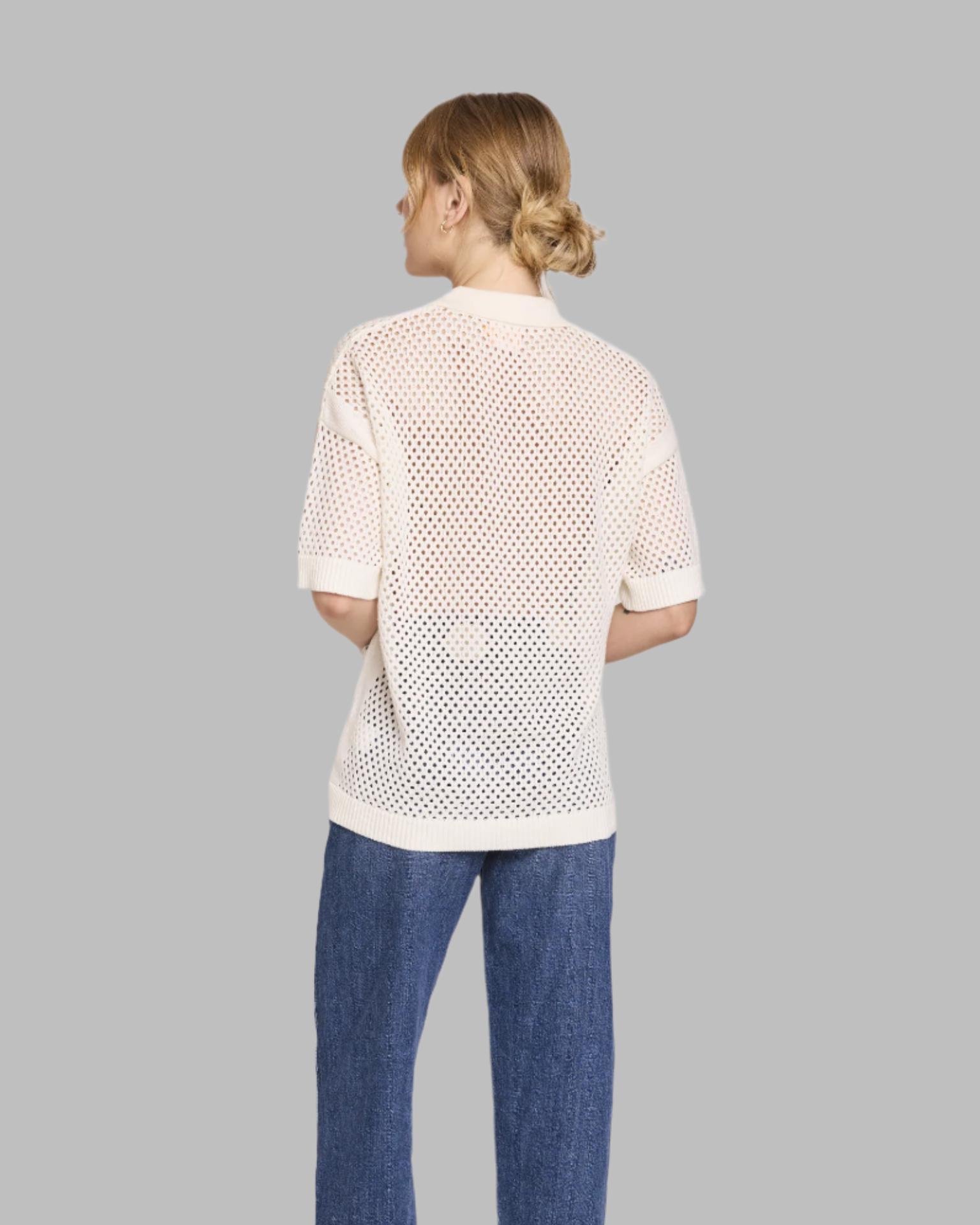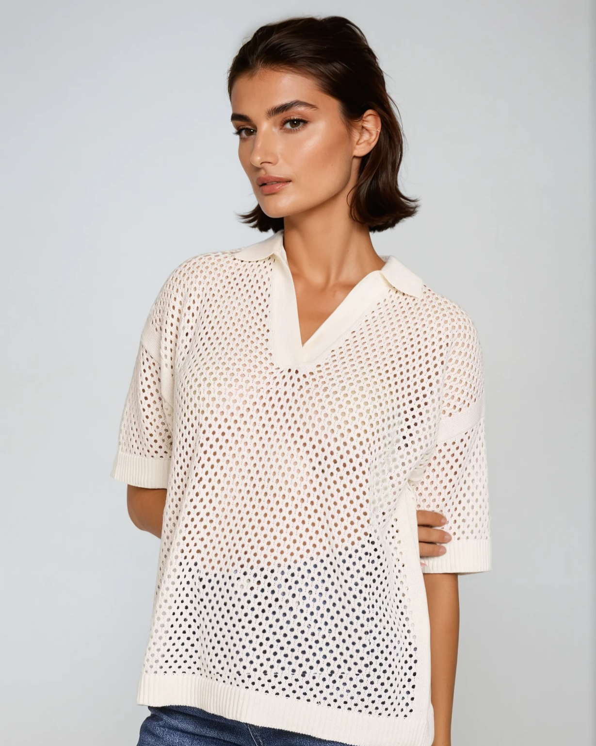 Chic open-knit polo top with a classic collar and relaxed fit, perfect for effortless layering and a sophisticated casual look.