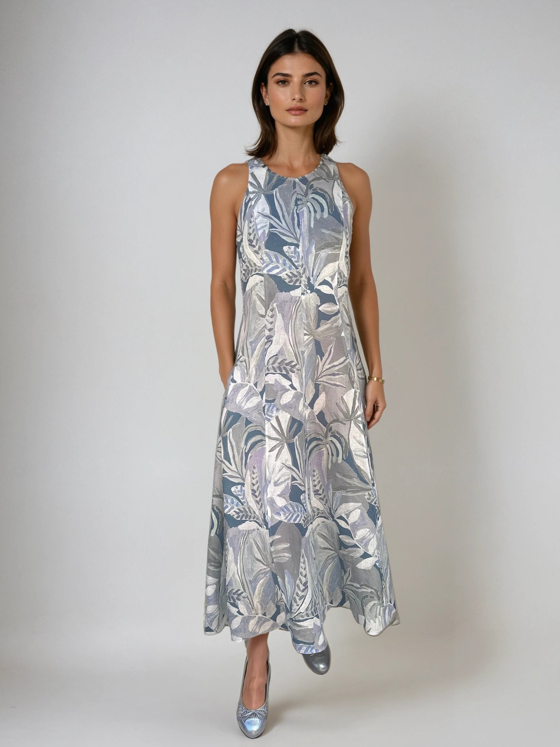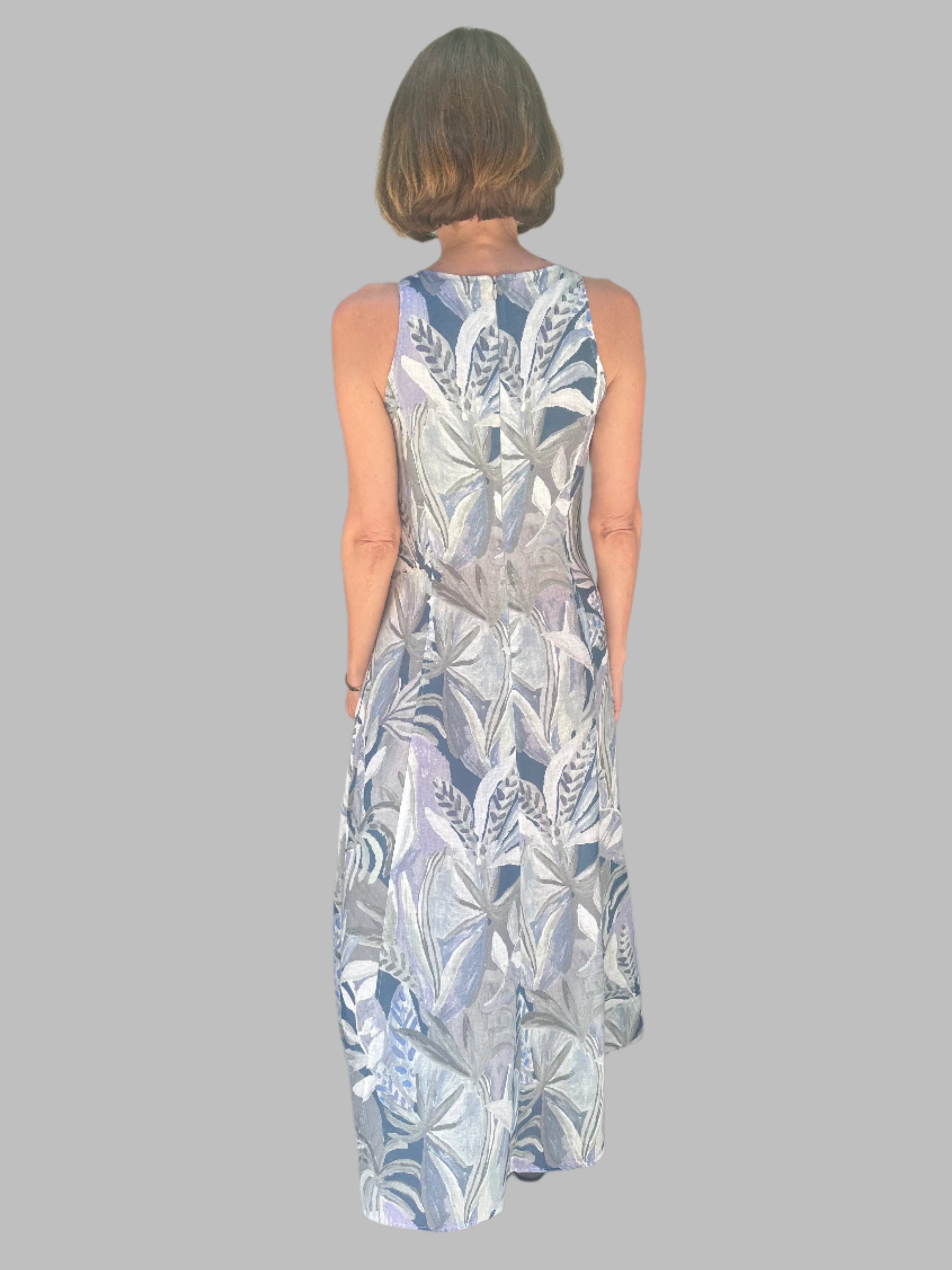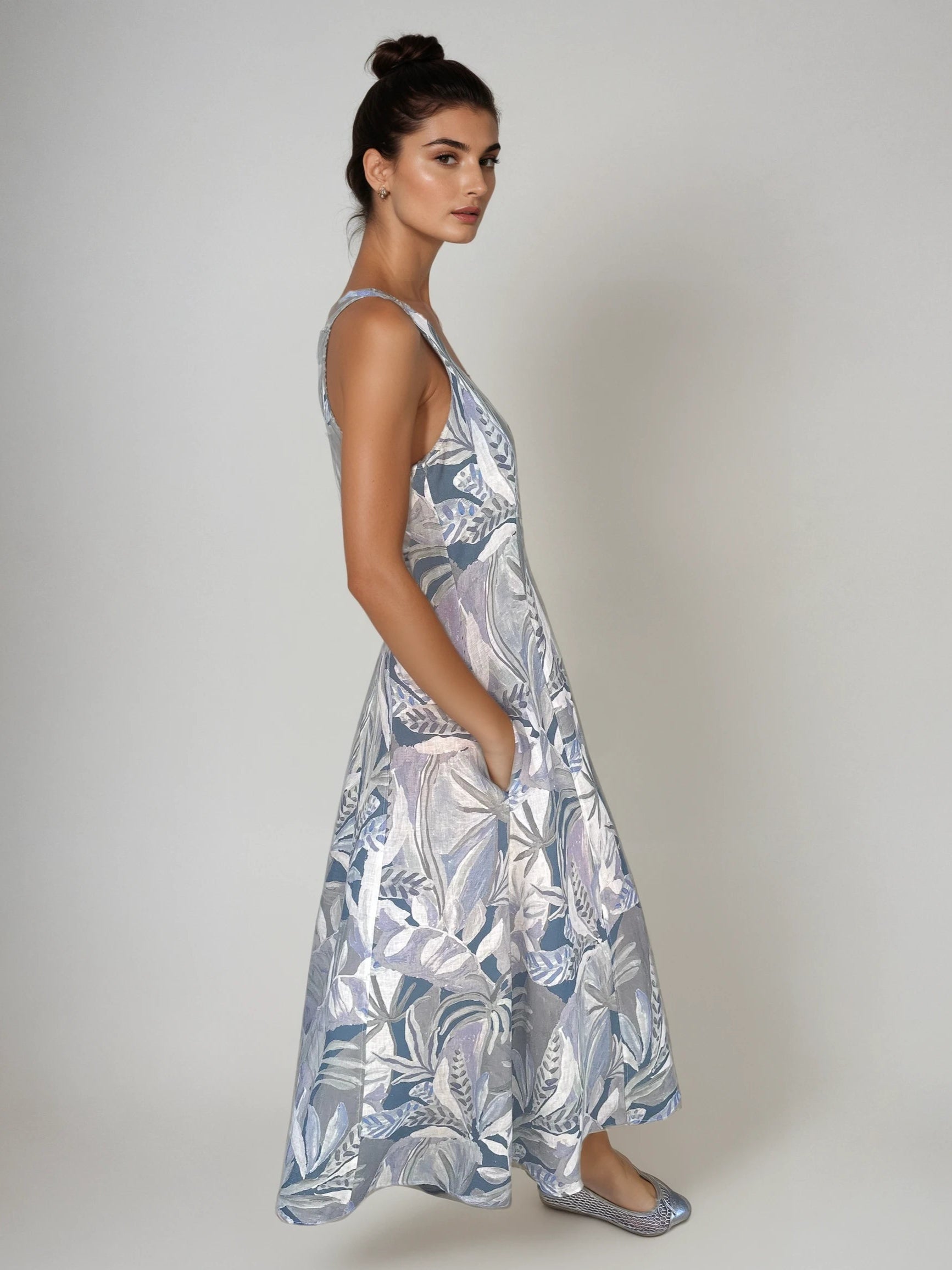 This sleeveless linen dress features a flowy A-line silhouette and a soft botanical print in muted shades of blue, grey, and white. Its lightweight, breathable fabric makes it perfect for warm weather, combining elegance with natural ease.