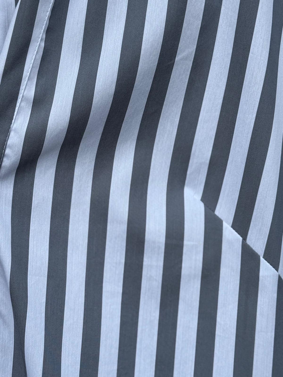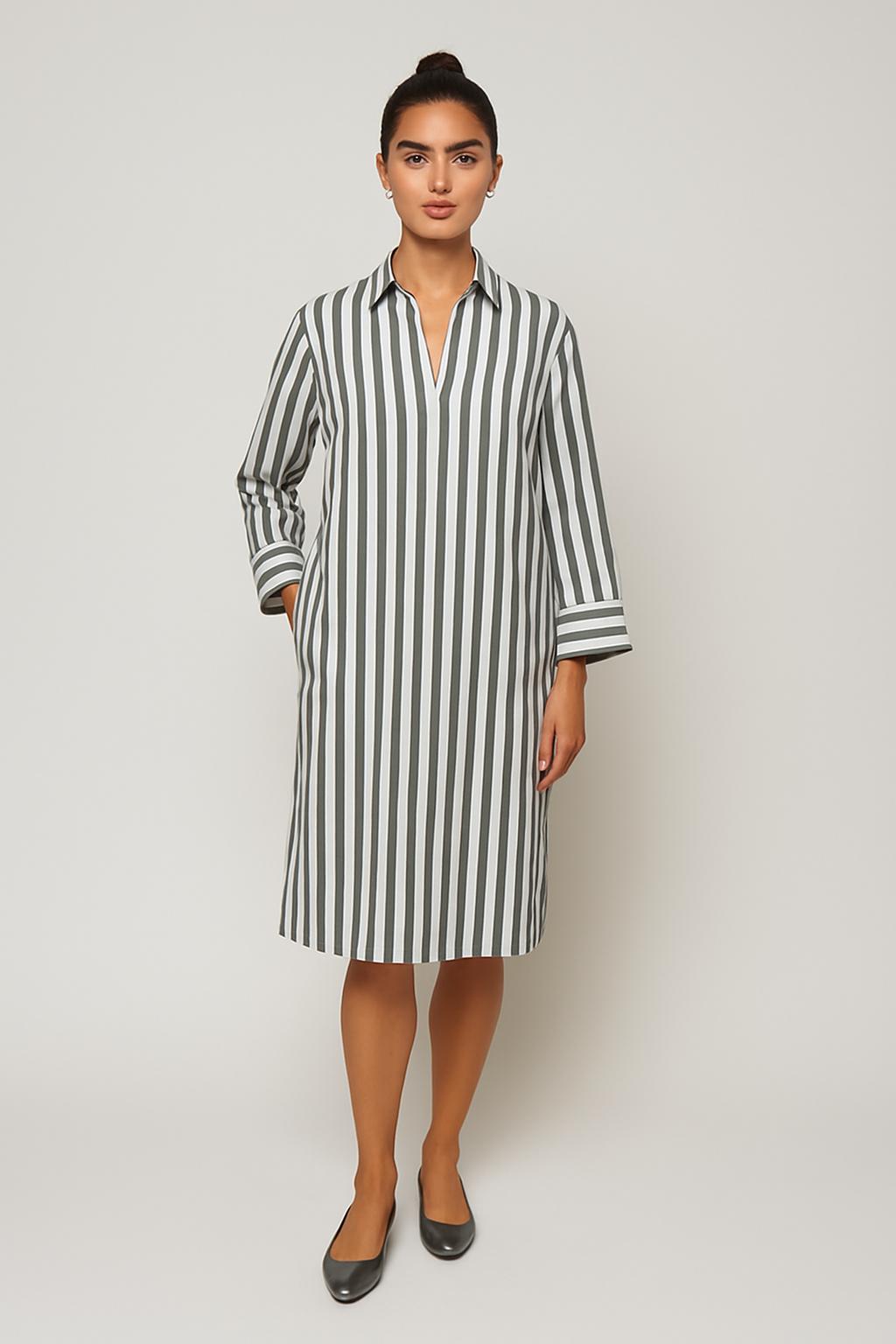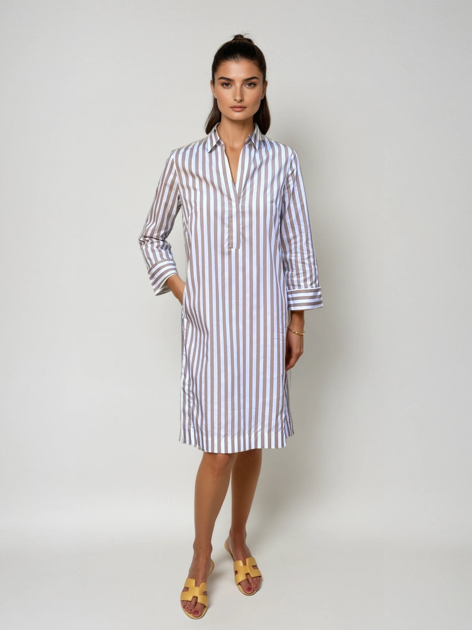 Striped shirt dress with a relaxed fit, V-notch neckline, and three-quarter sleeves. Falls above the knee for an effortlessly elegant look.