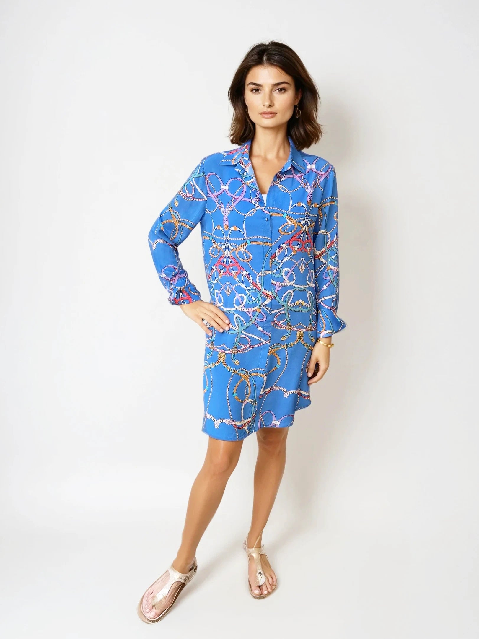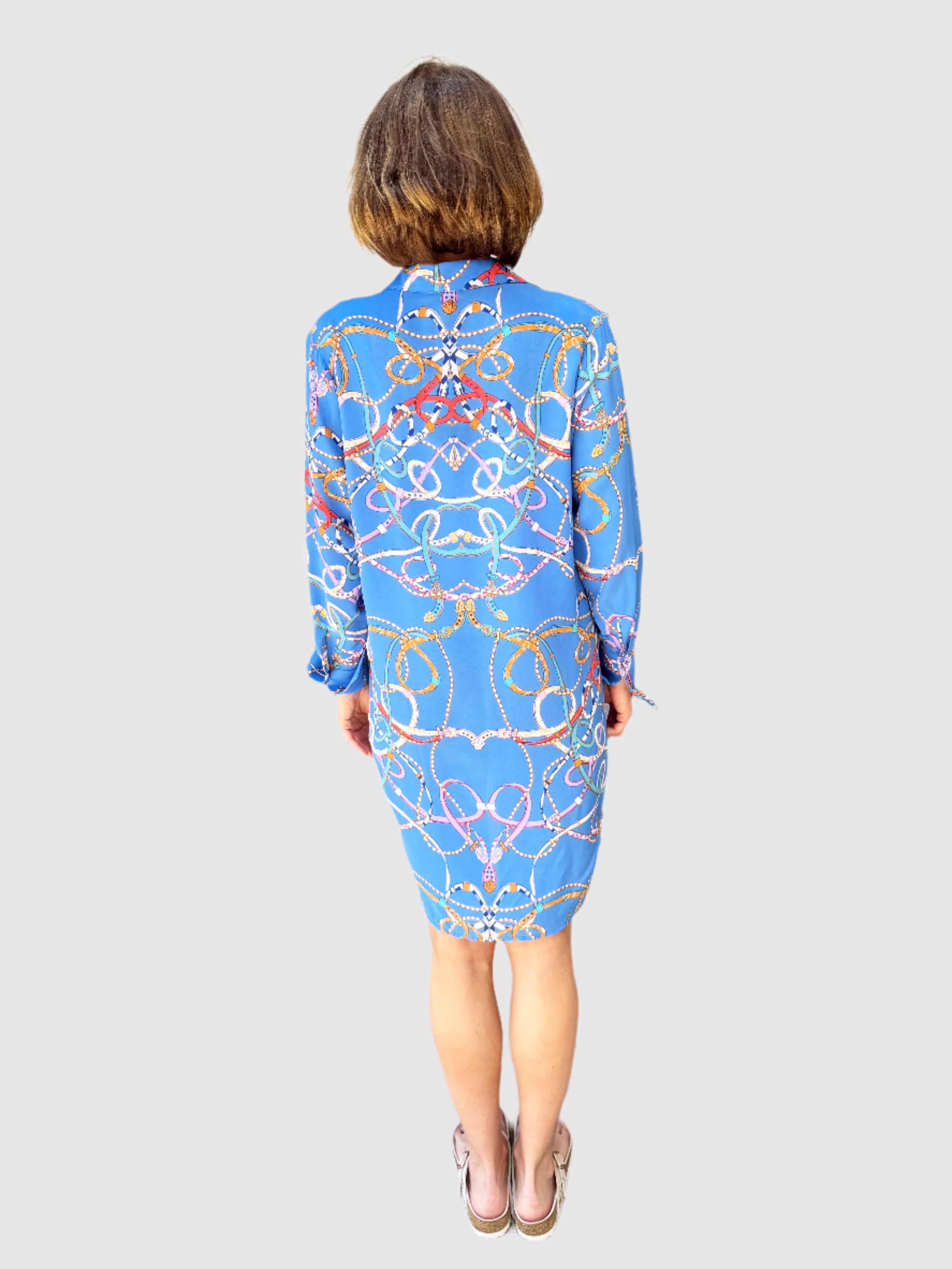 This elegant dress features a vibrant chain and geometric print, creating a stylish and sophisticated look. Its relaxed fit ensures comfort and ease of movement, making it a perfect choice for everyday wear or casual outings. The classic shirt collar and button-down front add a touch of timeless style, while cuffed sleeves complete the look. Crafted from luxurious silk, it offers a lightweight and smooth feel against the skin.