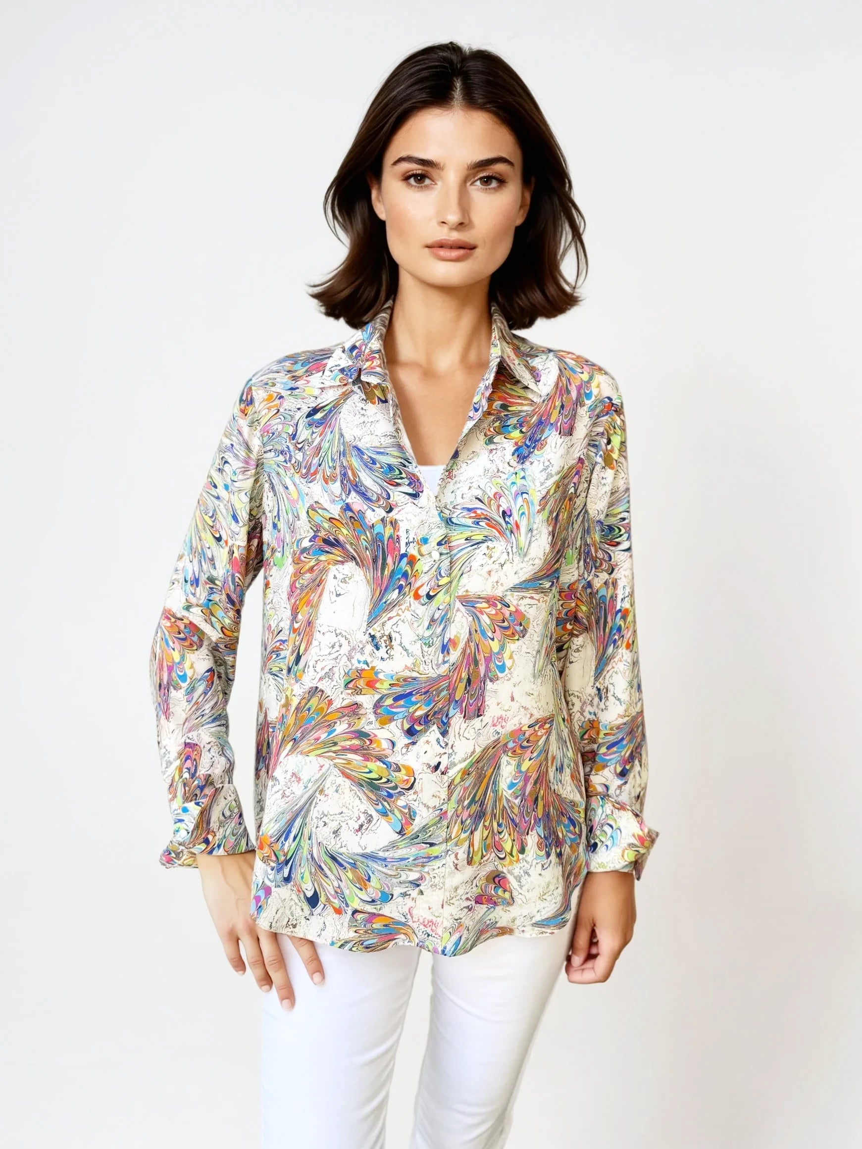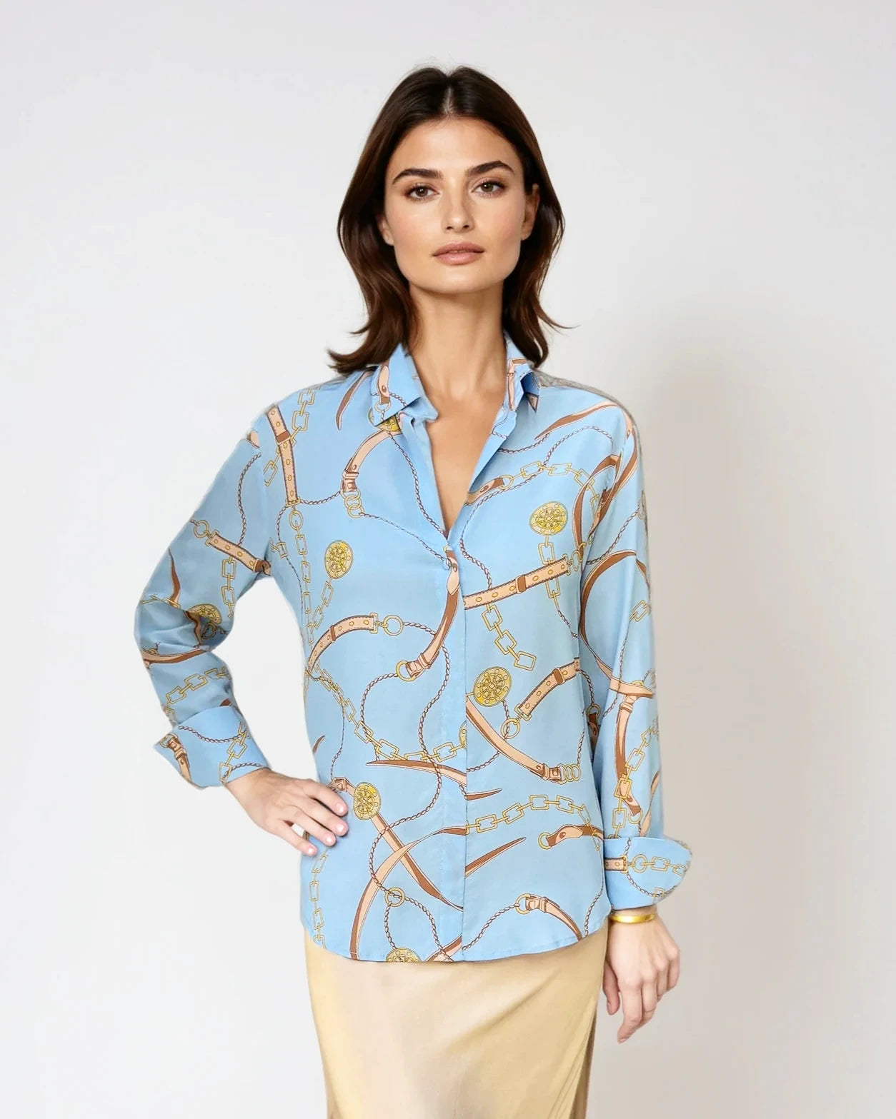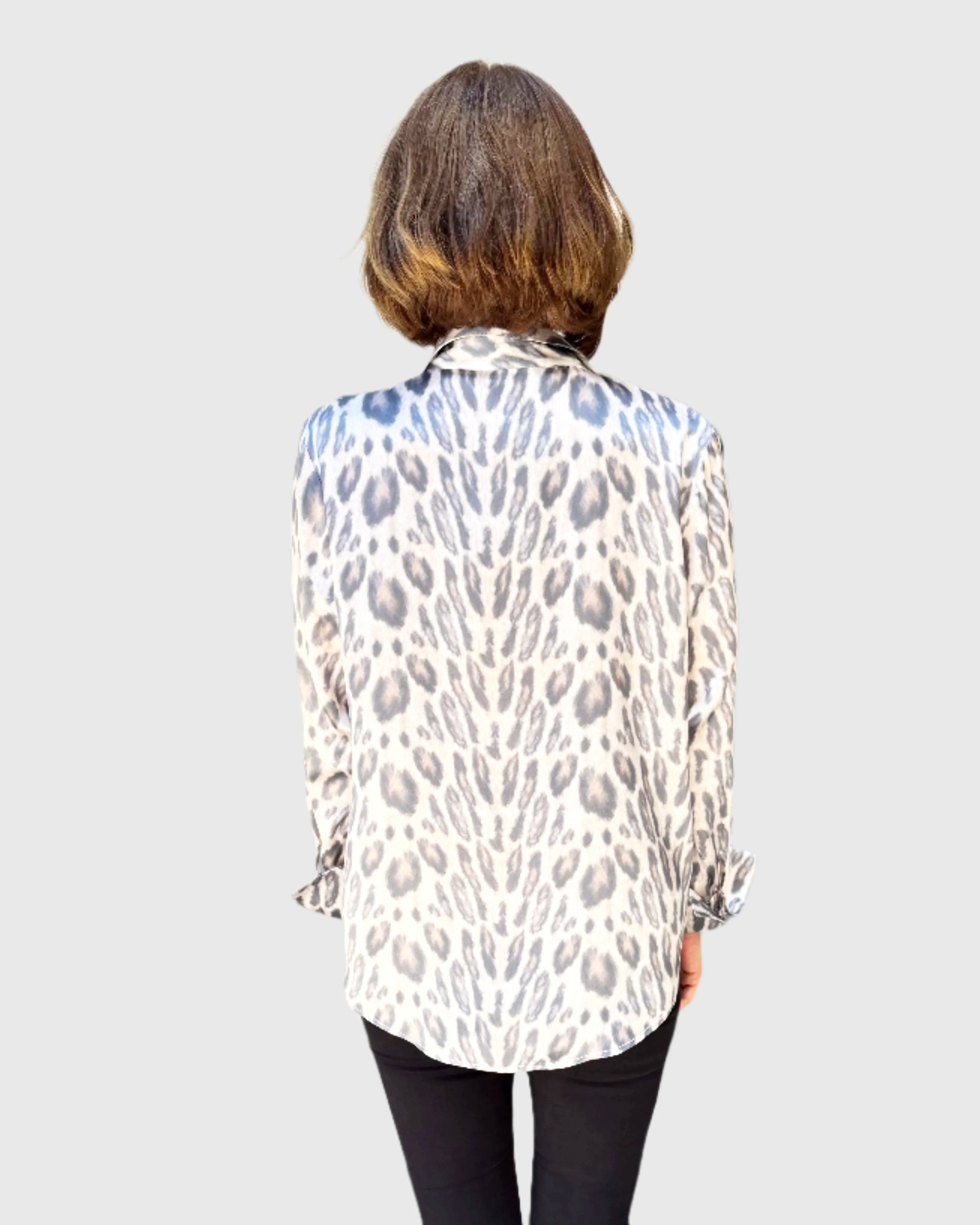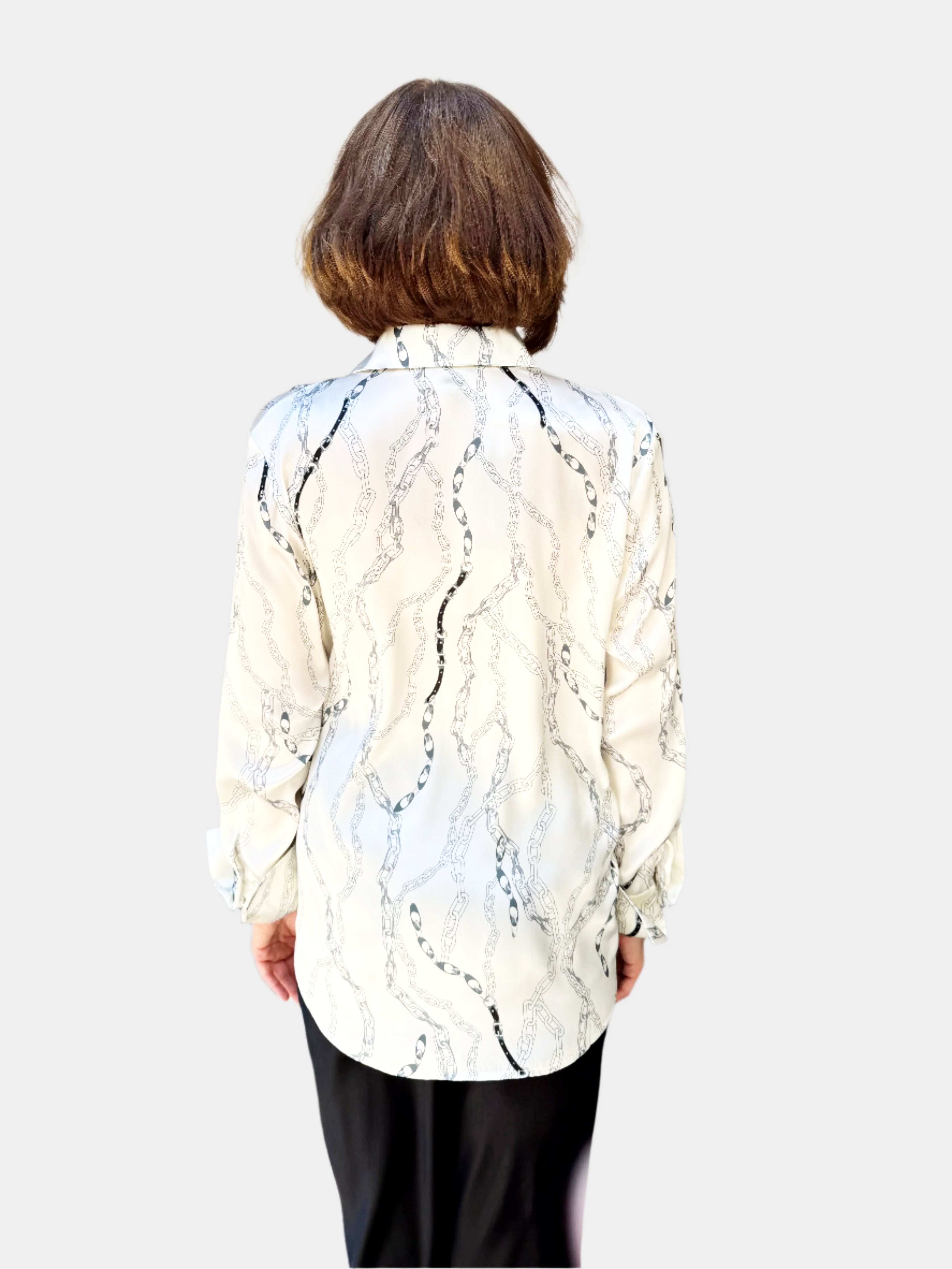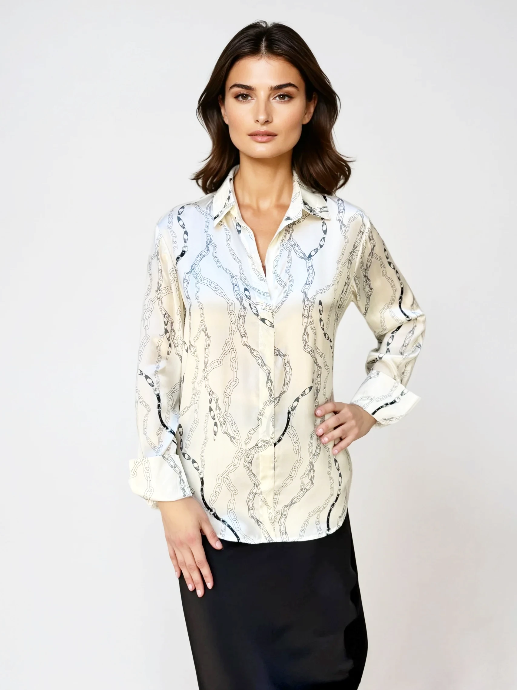 This luxurious blouse is crafted from 100% silk, providing a soft and smooth feel against the skin. Its elegant design makes it perfect for both professional and casual settings. The classic shirt collar and button-down front add a timeless touch, while long sleeves with buttoned cuffs ensure a polished appearance. Pair it with a sleek skirt or tailored pants for an effortless, sophisticated look.