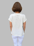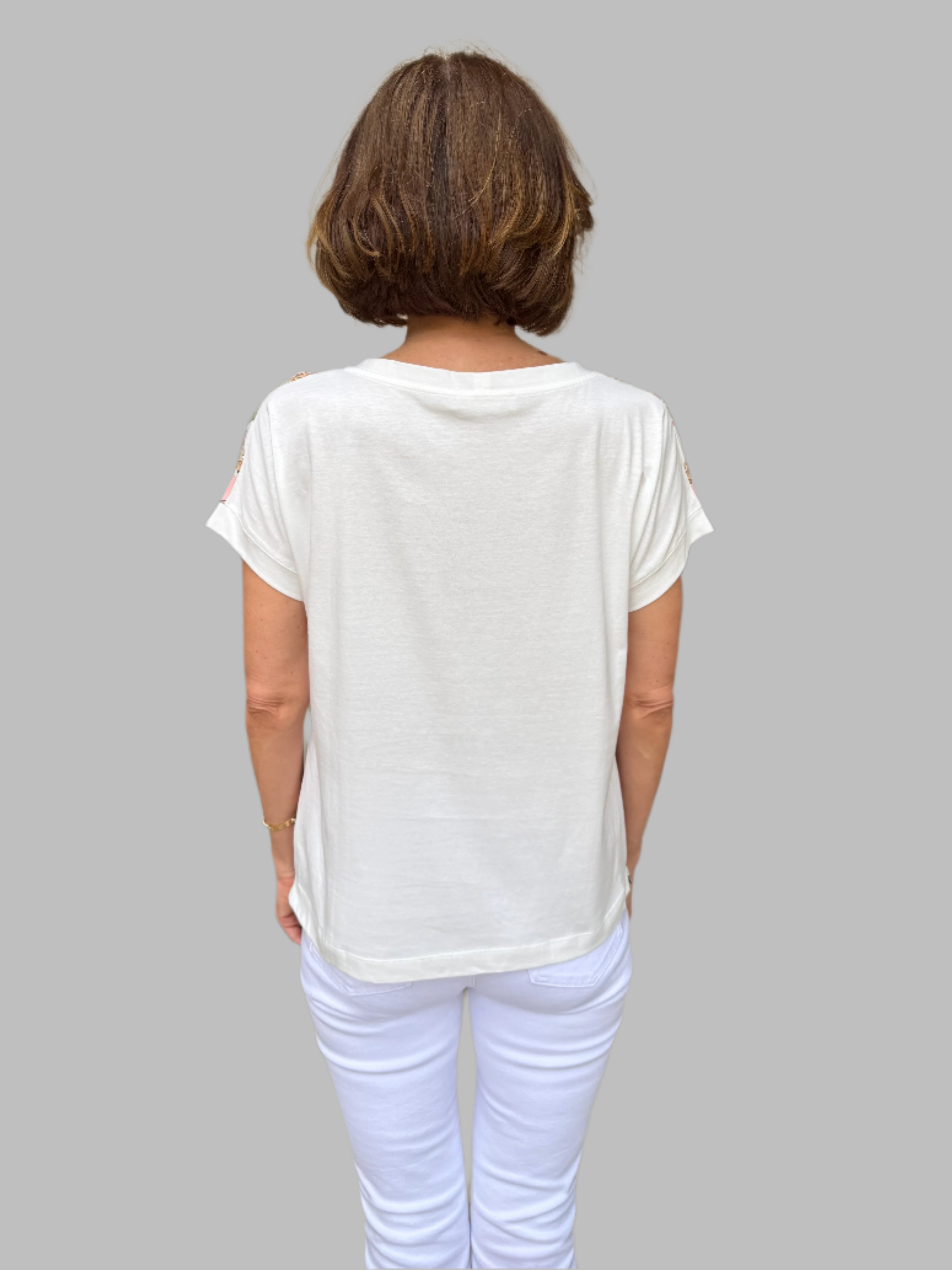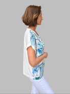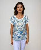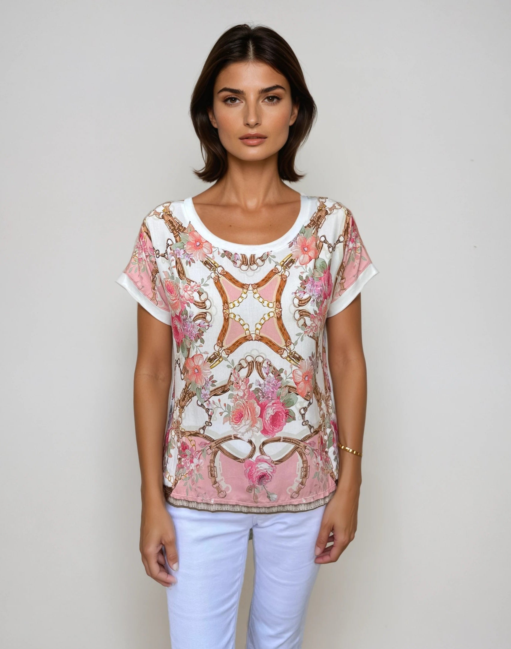 Step into elegance with this beautifully printed top, featuring intricate floral and chain motifs. The relaxed fit and soft fabric provide comfort and style, while the solid back adds a touch of simplicity. Perfect for both casual and chic looks.