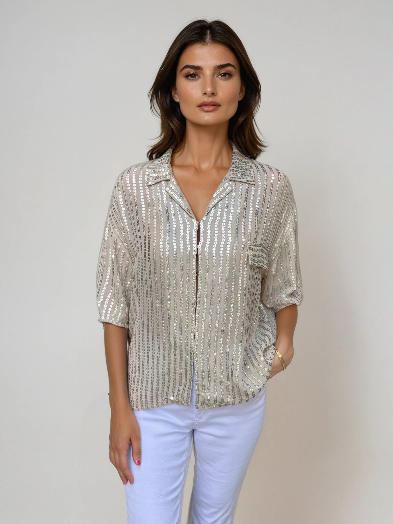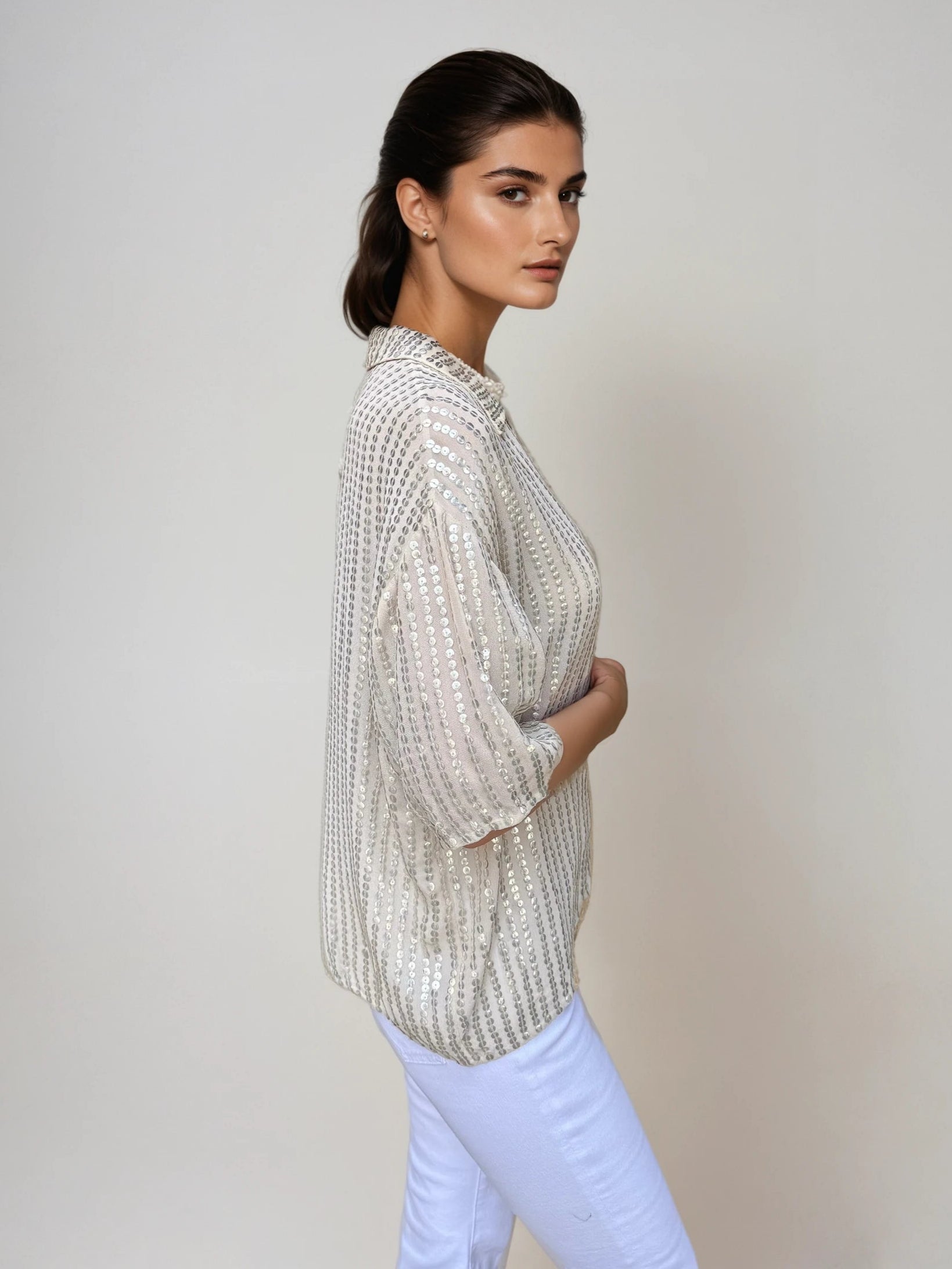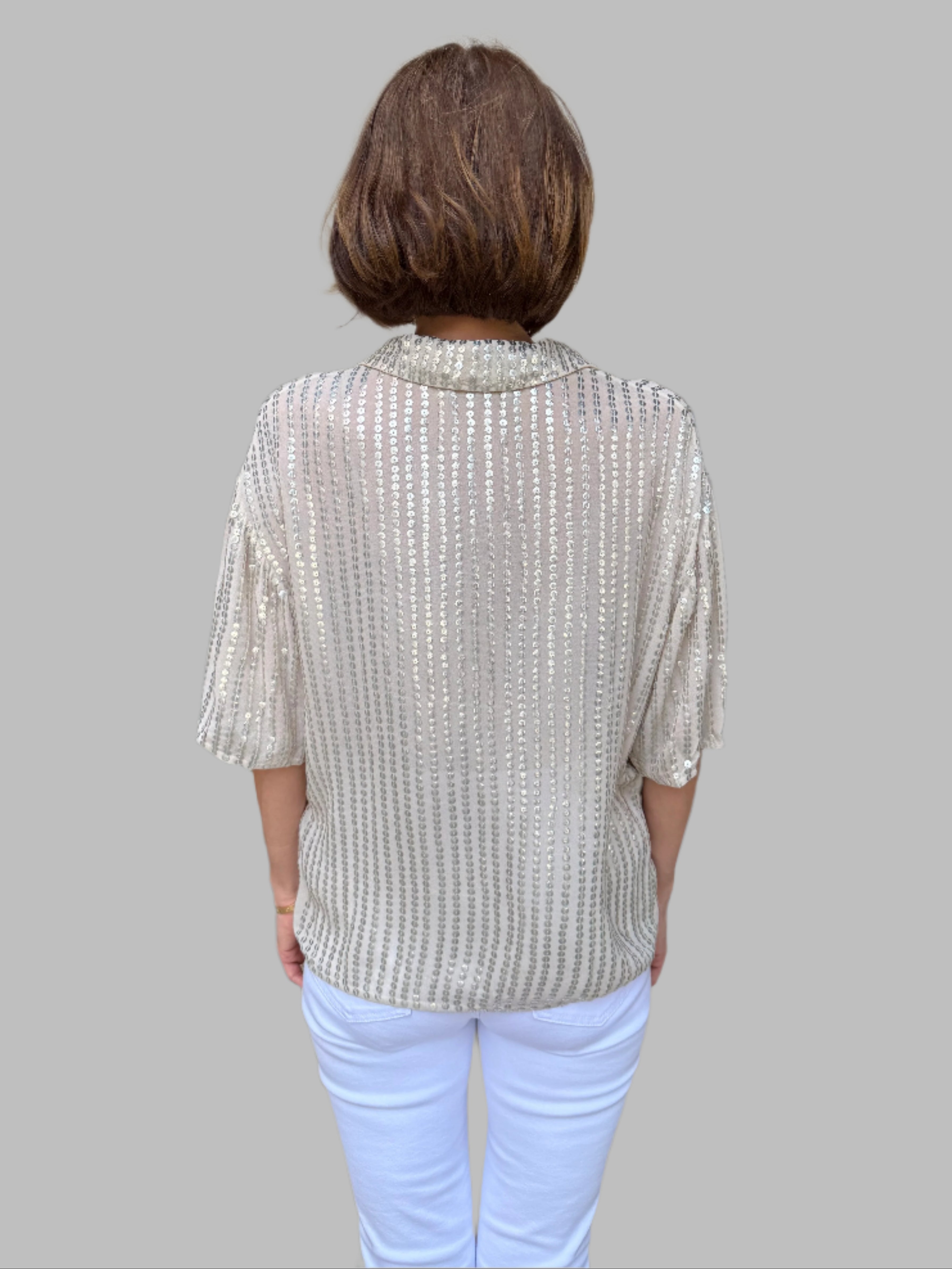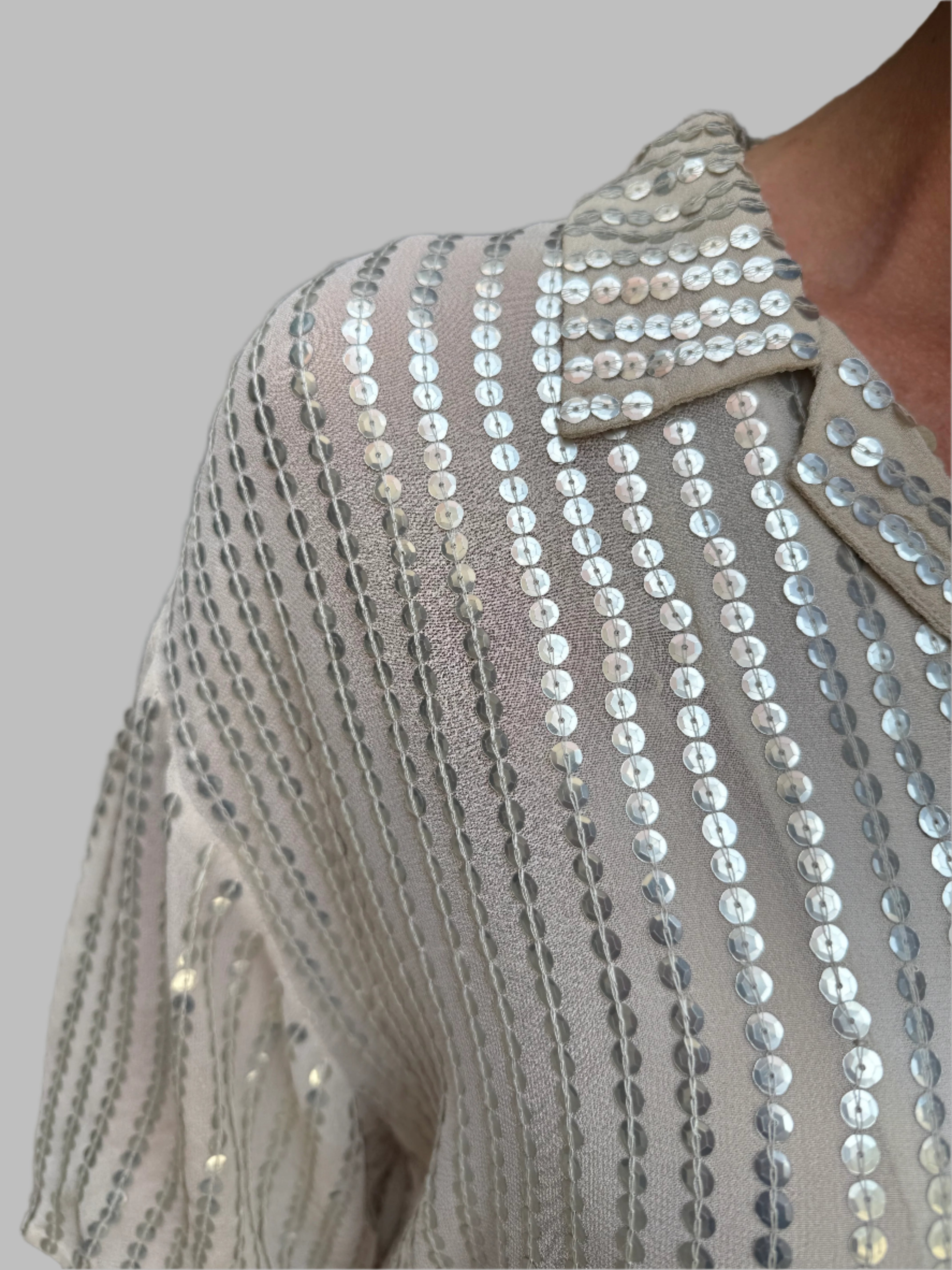 Make a statement with this shimmering sequin blouse. Crafted with delicate vertical rows of sequins, it exudes elegance and sophistication. Featuring a classic collar, hook-and-eye front, and relaxed fit, it’s perfect for both day and evening occasions. Proudly made in Italy.