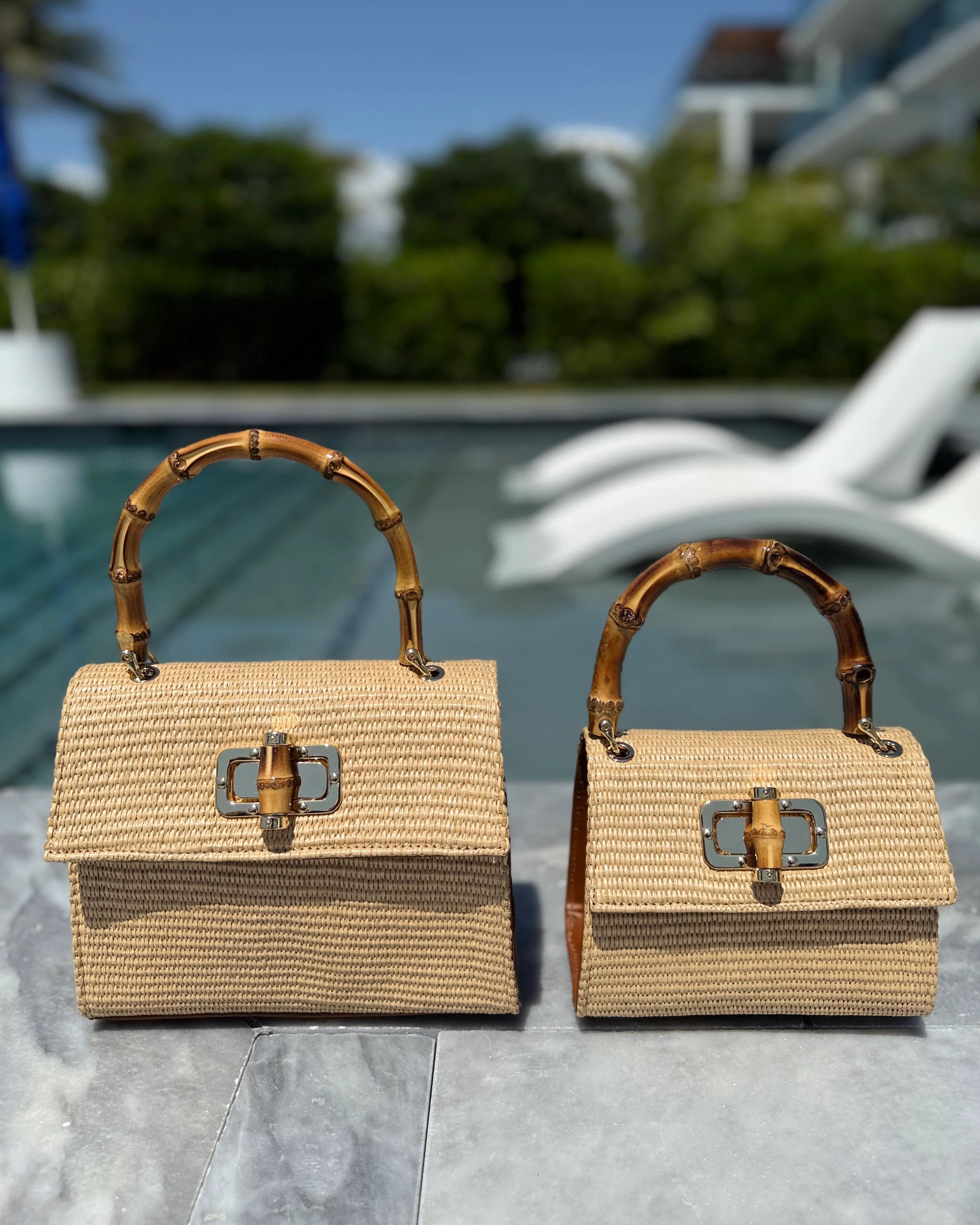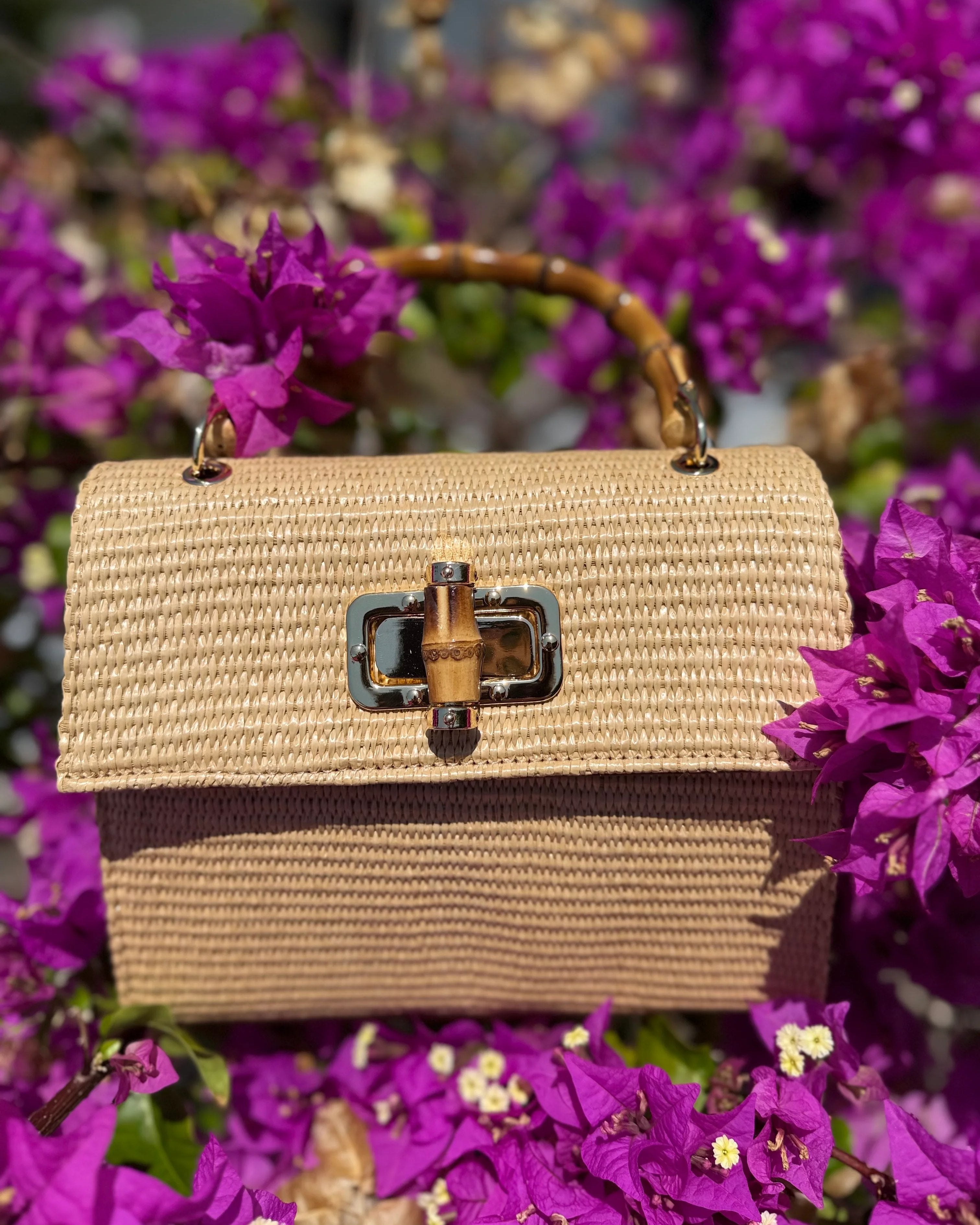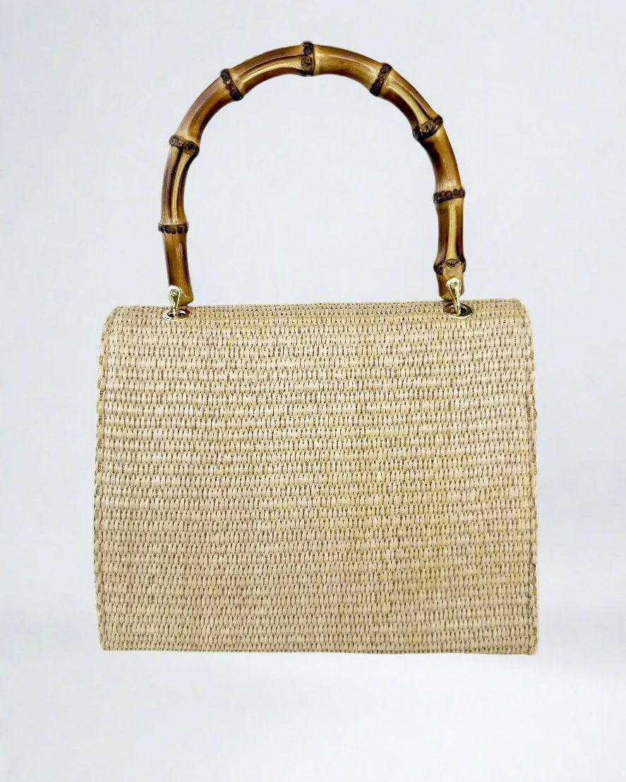 This woven raffia mini bag by Medici of Florence blends natural charm with refined Italian craftsmanship. Featuring a signature bamboo top handle and matching bamboo twist-lock closure, it’s a stylish companion for sunny days, getaways, or casual chic looks. Lightweight yet structured, it transitions seamlessly from day to evening.