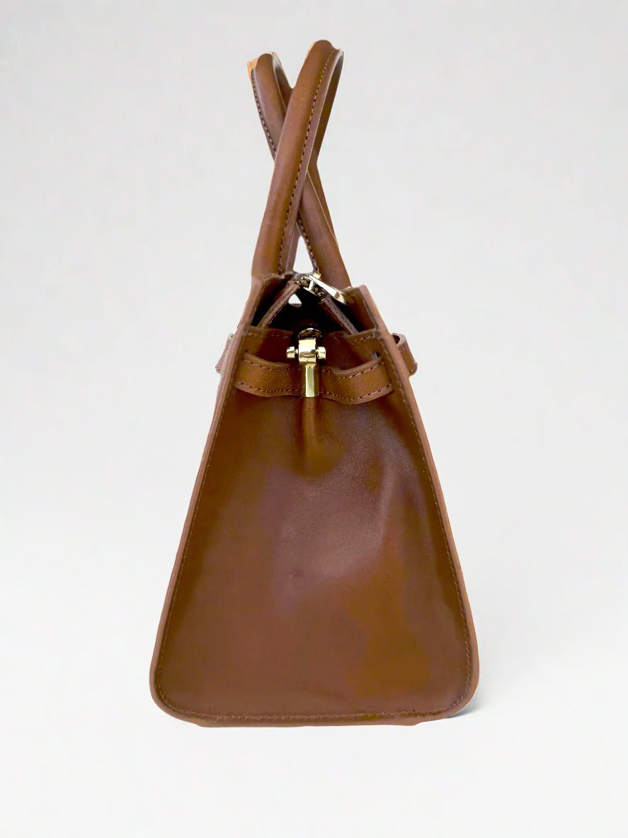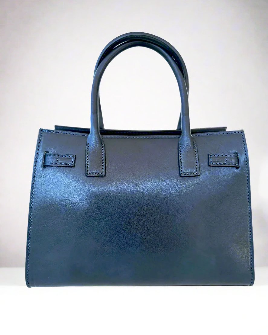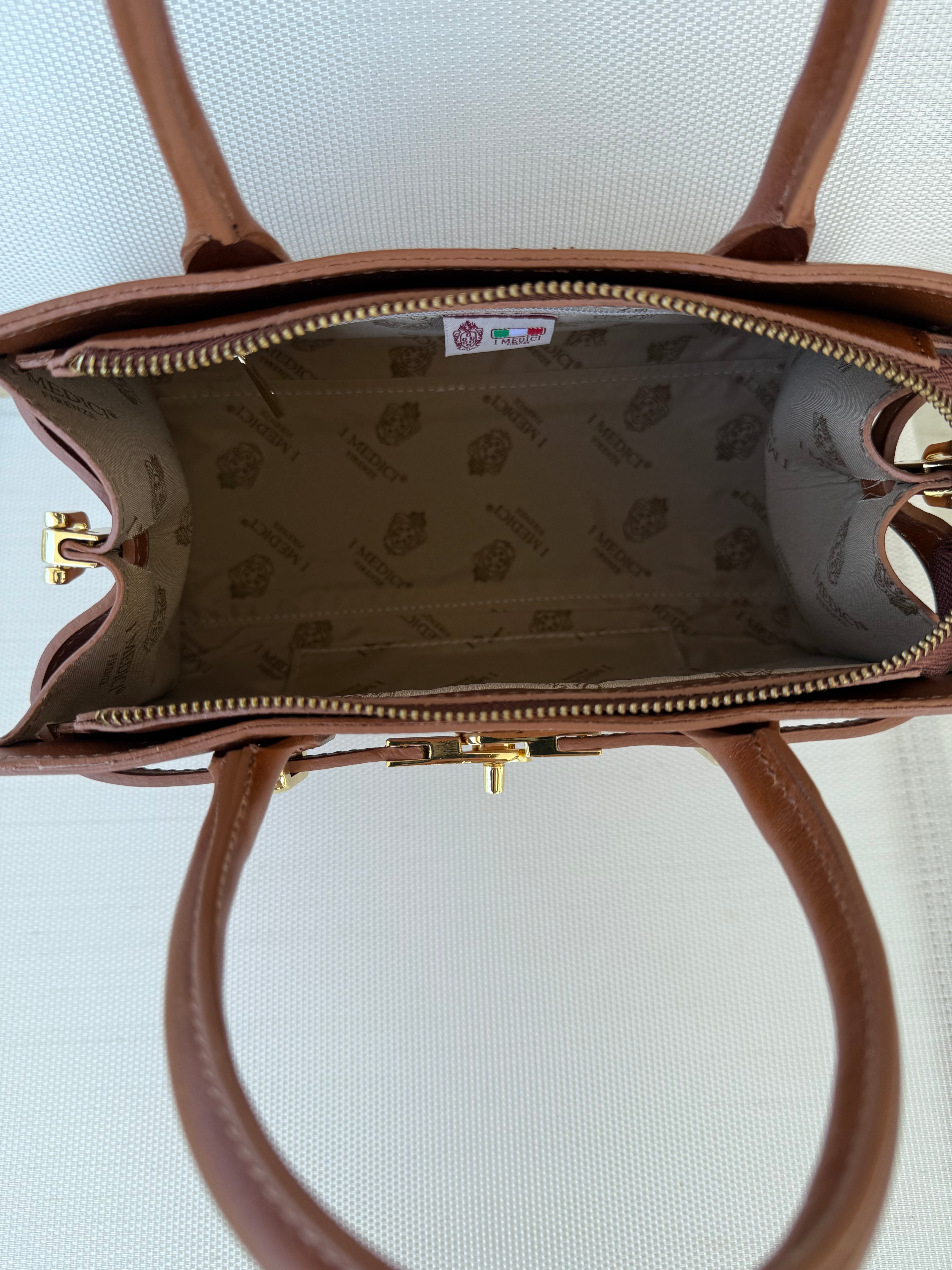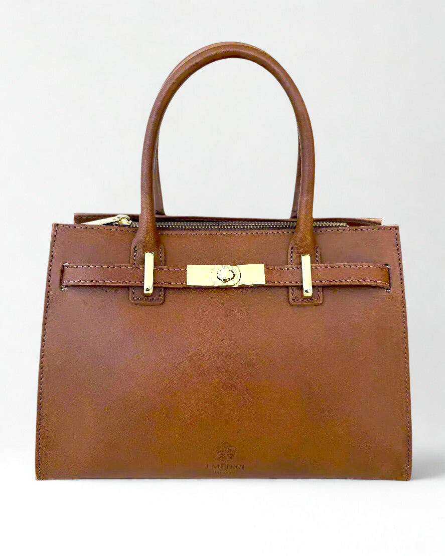 Timeless and sophisticated, this structured leather handbag by Medici of Florence is crafted in smooth Italian leather with clean lines and polished gold-tone hardware. Featuring a top zip closure and a sleek front strap detail with a gold turn-lock accent, it’s the perfect everyday bag that transitions effortlessly from work to weekend.