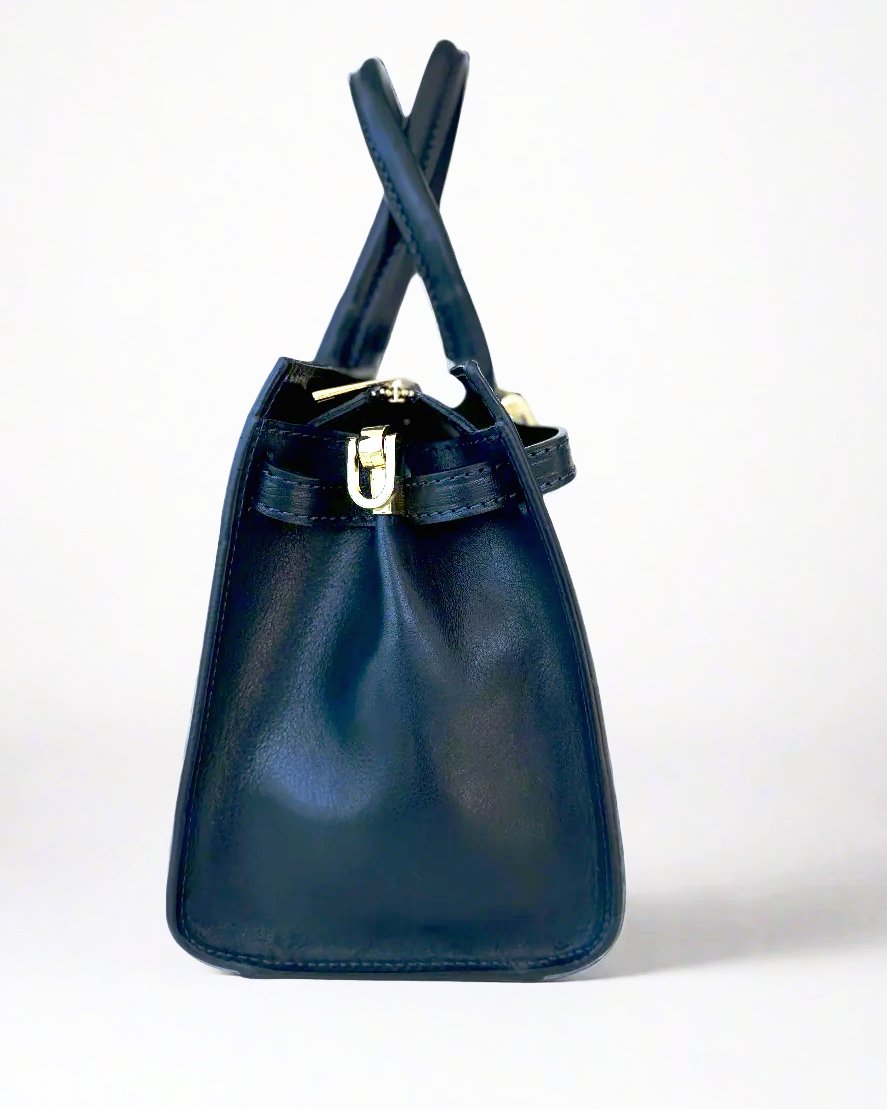 - Front strap with gold-tone turn-lock detail (non-functional)