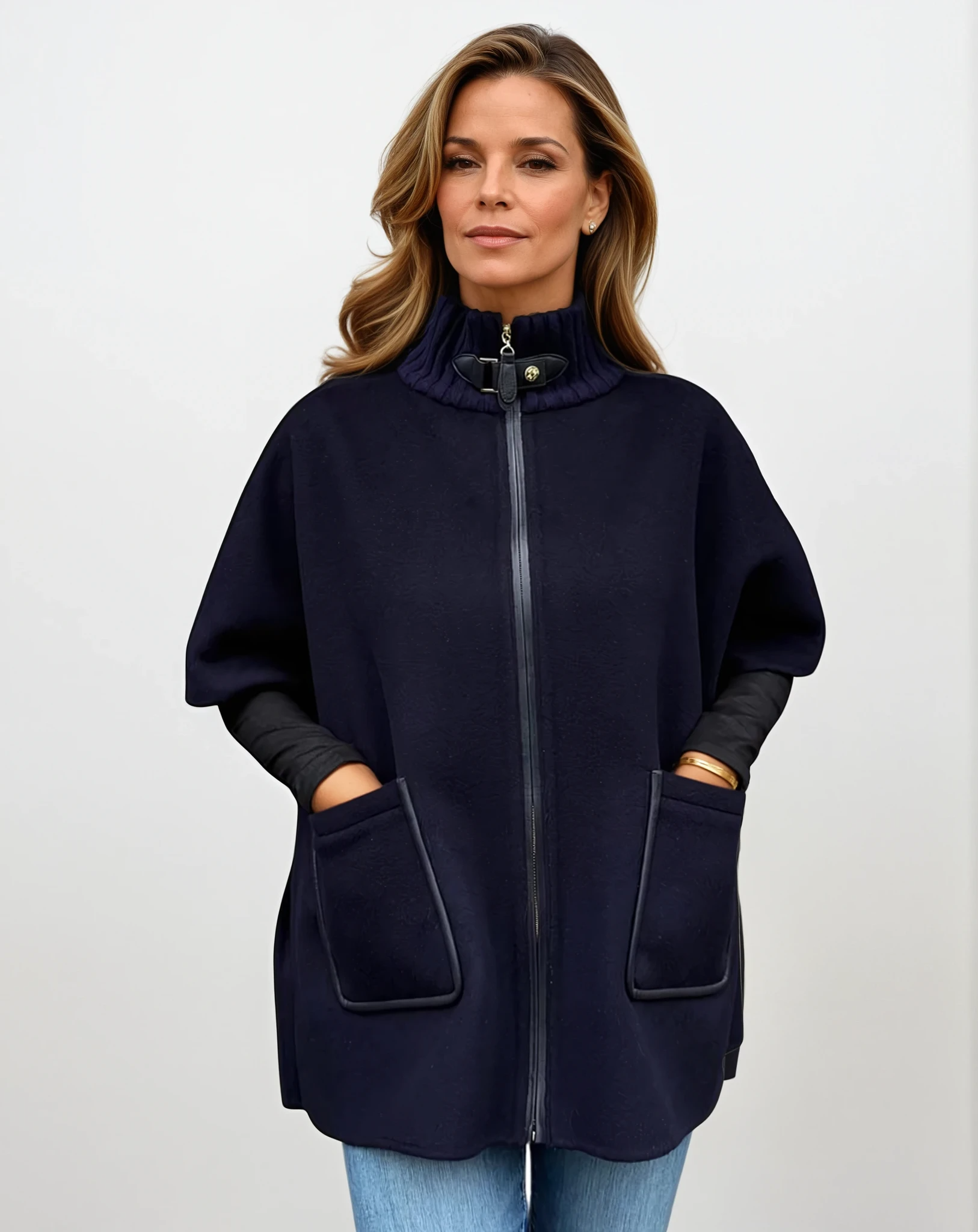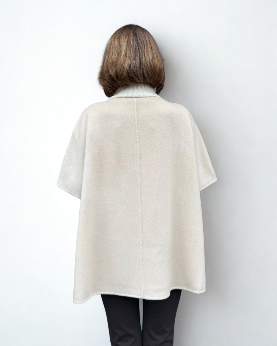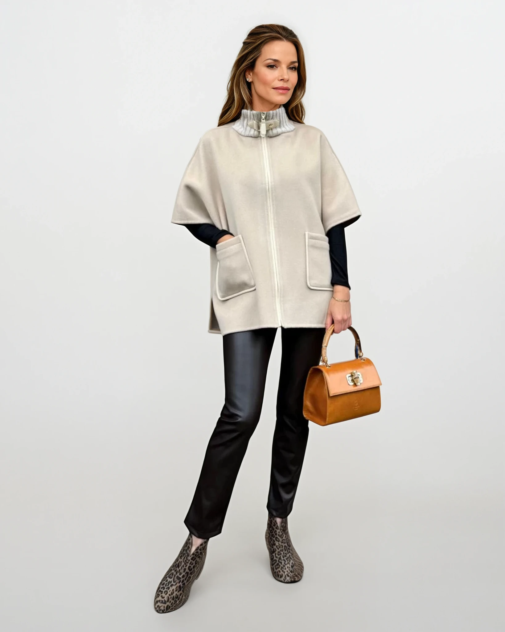 A modern take on timeless style, this cape combines effortless elegance with versatile sophistication. Its clean lines, wide sleeves, and structured silhouette make it the perfect layering piece, easily styled for both casual and polished looks. Subtle leather accents add a refined finish, making it a chic statement for any wardrobe.