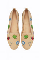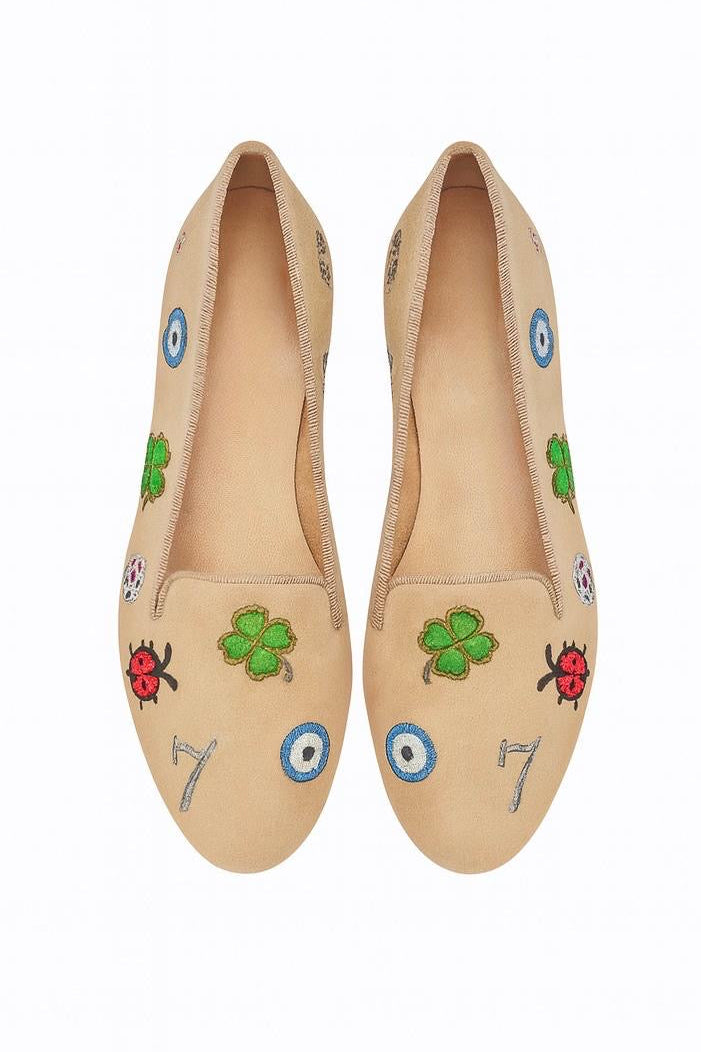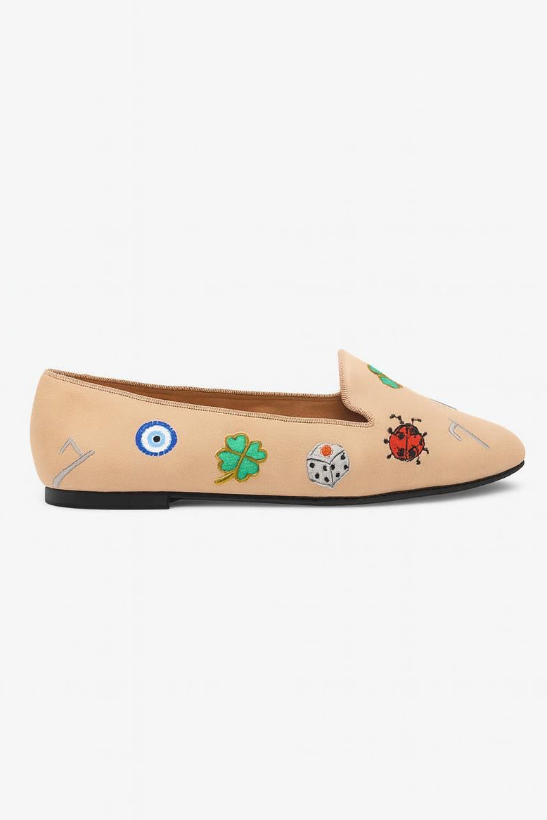 From the exclusive Nicky Hilton x French Sole Collection, this charming loafer is crafted from soft suede and adorned with hand-picked lucky symbols — embroidered four-leaf clovers, ladybugs, evil eyes, and the number seven — blending playful charm with effortless sophistication. Handcrafted in Spain with a cushioned leather footbed, this limited-edition design offers timeless style and all-day comfort from brunch to city strolls.