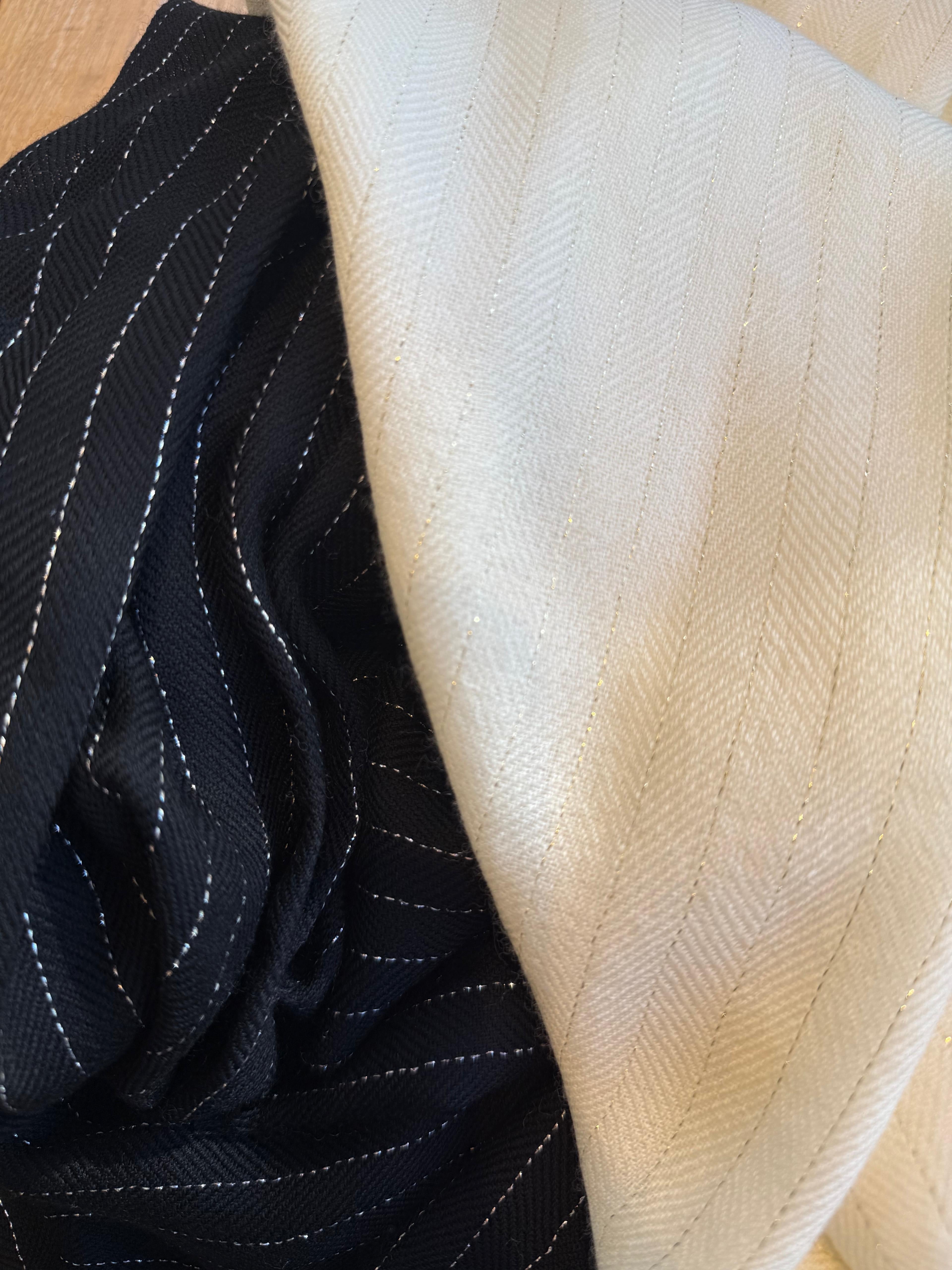 Wrap yourself in understated elegance with this finely woven wool stole, featuring a subtle metallic pinstripe for a hint of shimmer. Luxuriously soft and generously sized, it drapes beautifully over the shoulders or layers effortlessly as a scarf. Perfect for elevating everyday outfits or adding a refined touch to evening wear.