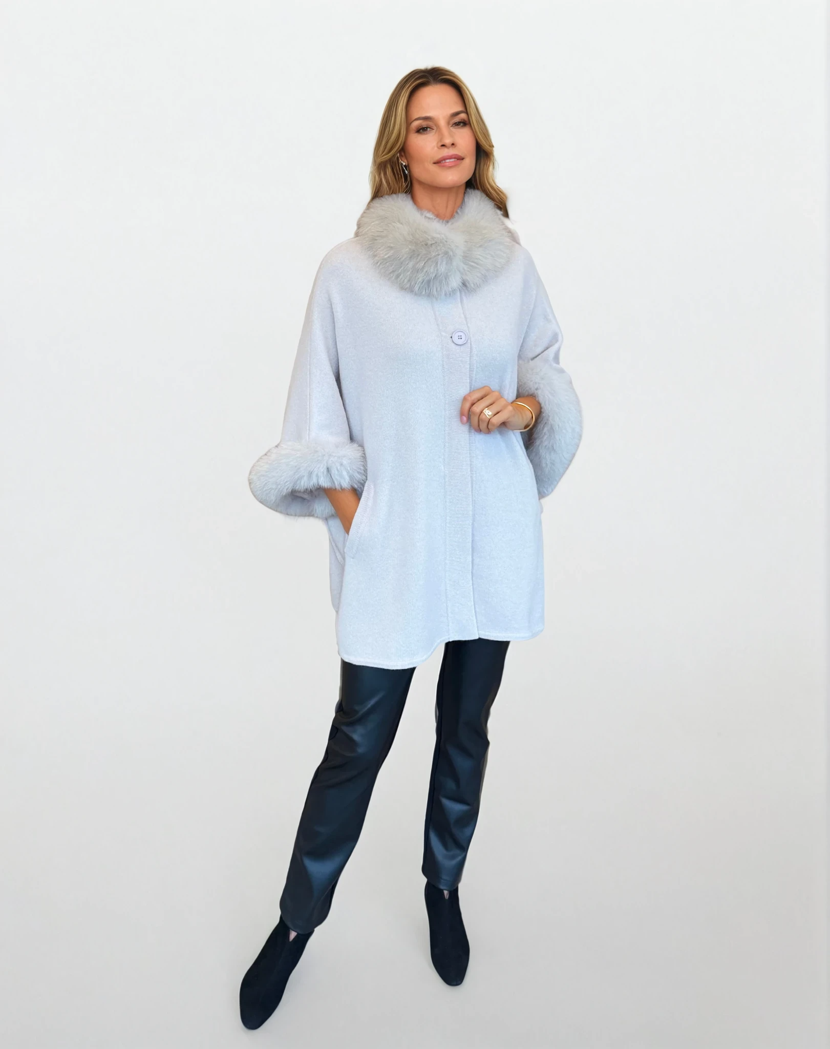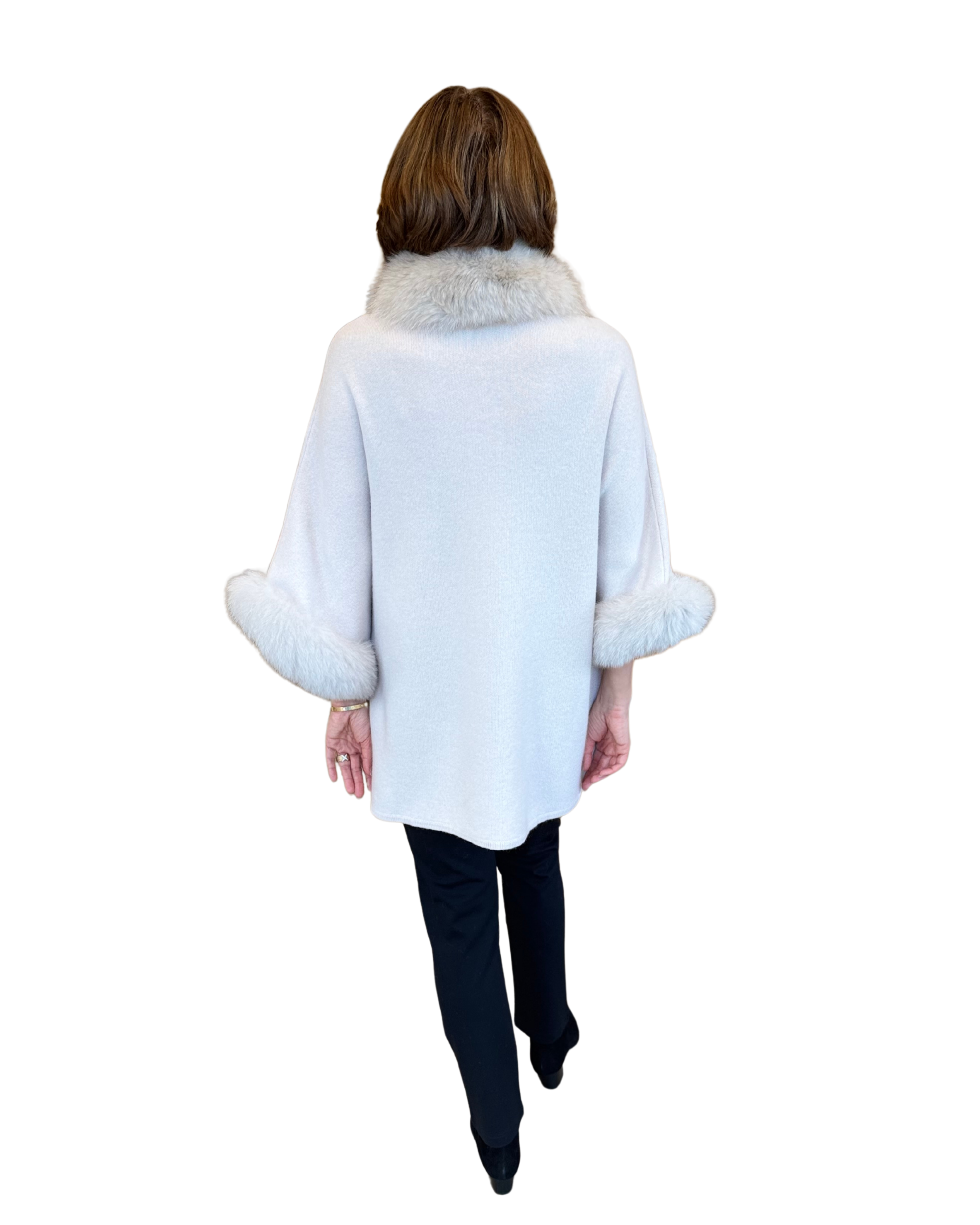 Step into timeless elegance with this luxurious cape. Crafted in a refined wool/cashmere blend and trimmed with plush fur at the collar and cuffs, this statement piece offers warmth and sophistication in one. Perfect for layering over both casual and formal outfits, it brings effortless glamour to chilly days.