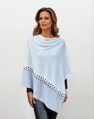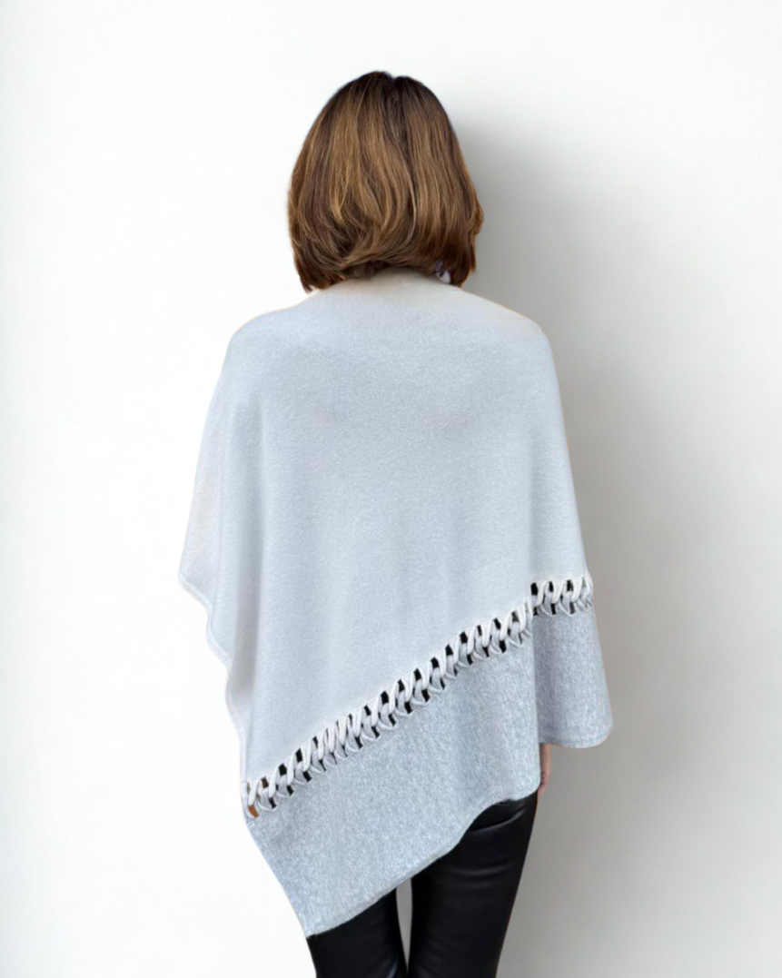 A modern interpretation of classic luxury, this cashmere poncho showcases a graceful asymmetric drape highlighted by an intricate twist-stitch border. Exceptionally soft and lightweight, it adds an elevated layer of warmth and texture without bulk. Designed to move beautifully, it complements both relaxed daytime looks and polished evening ensembles.
