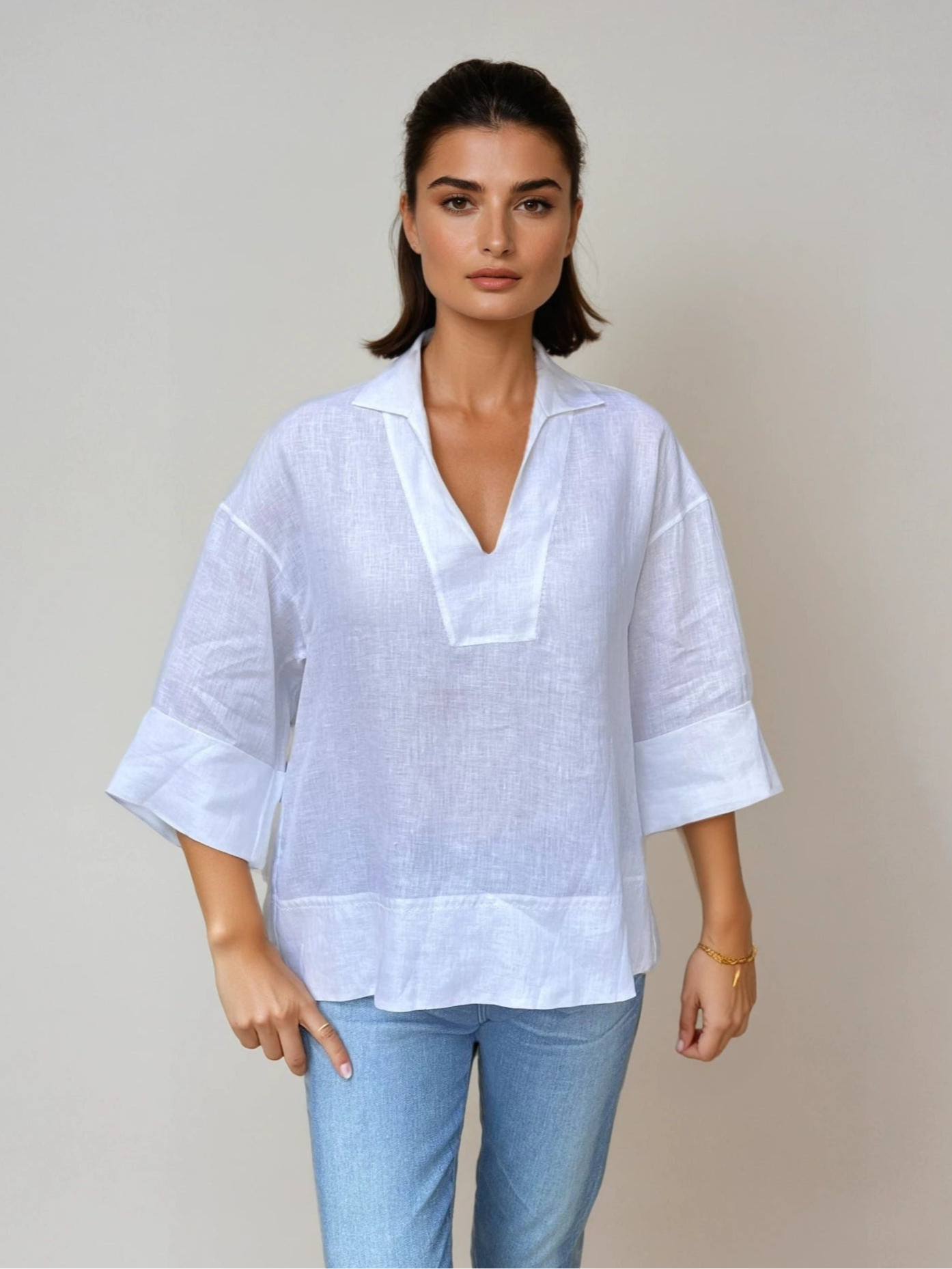This lightweight blouse offers a relaxed, elegant silhouette with a soft open V-neck and loose 3/4 sleeves — perfect for effortless summer style.