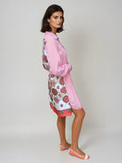Shirt dress with a button-down front and a matching waist tie. Features orange and white vertical stripes, long sleeves with cuffs, and a classic pointed collar. Timeless silhouette with a flattering waist emphasis.