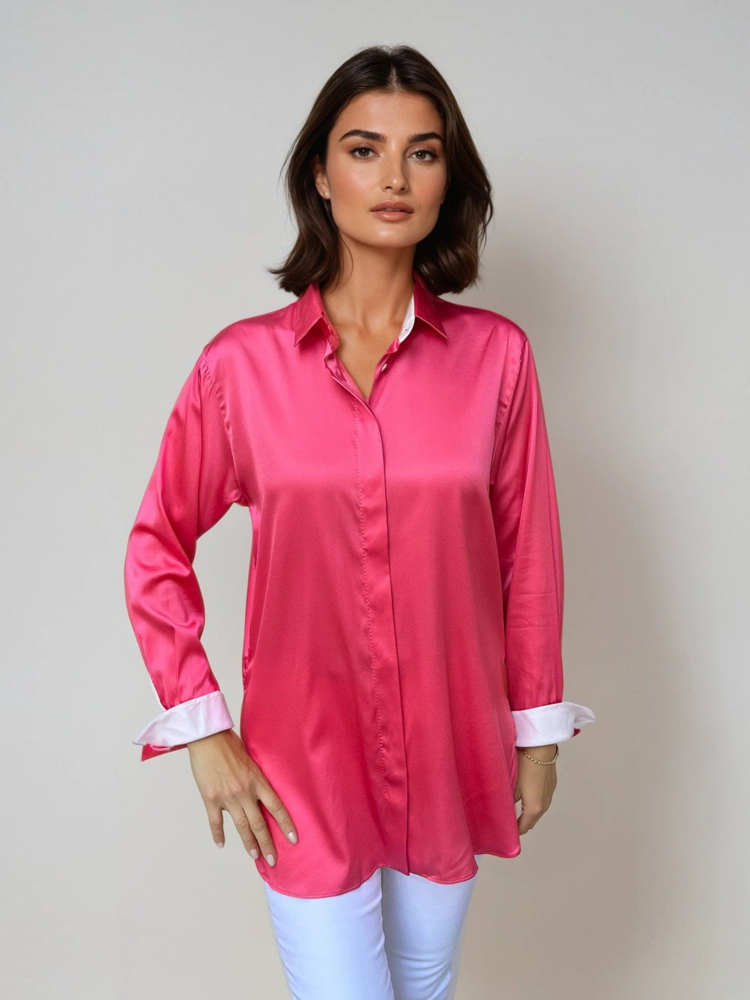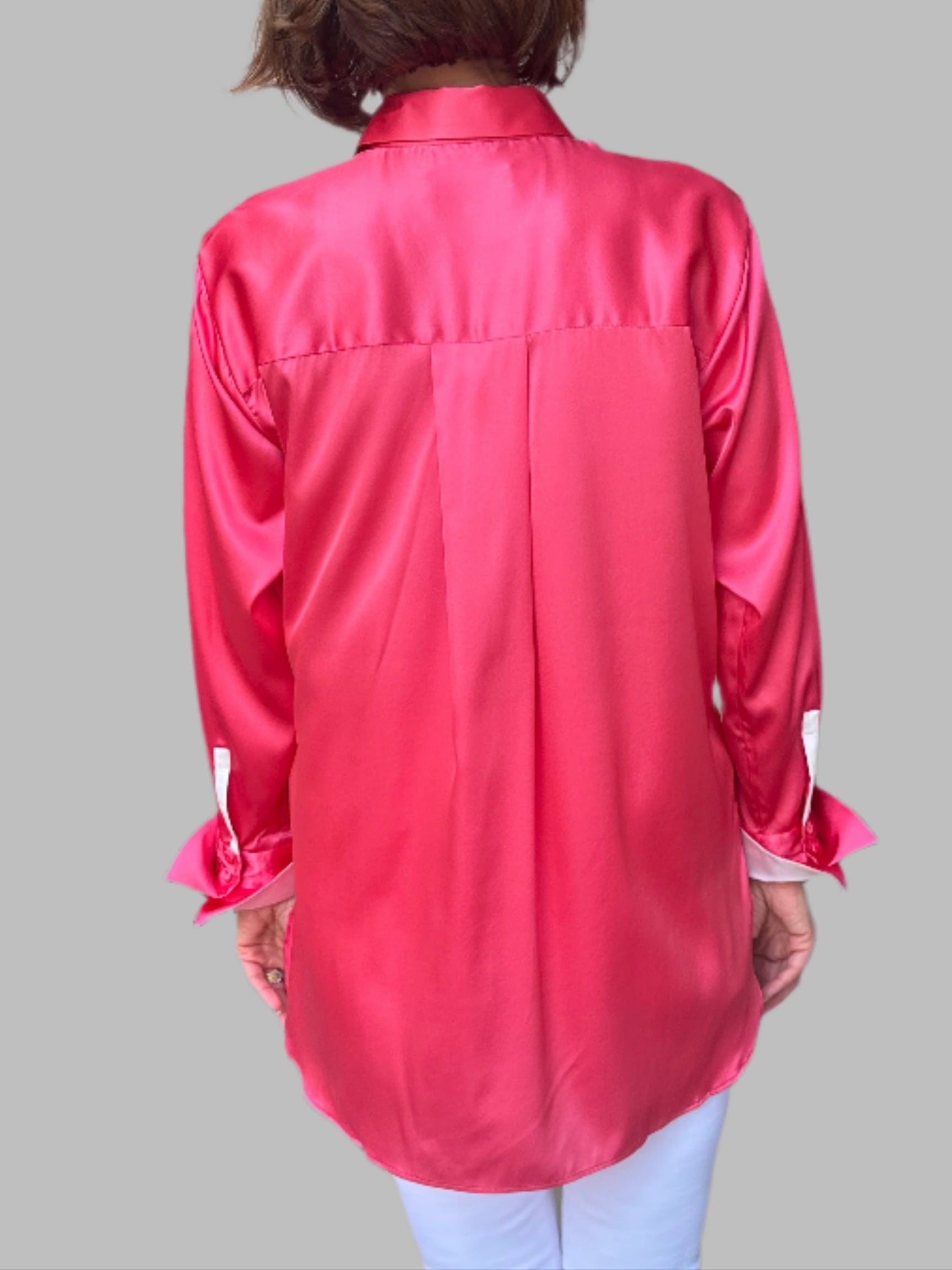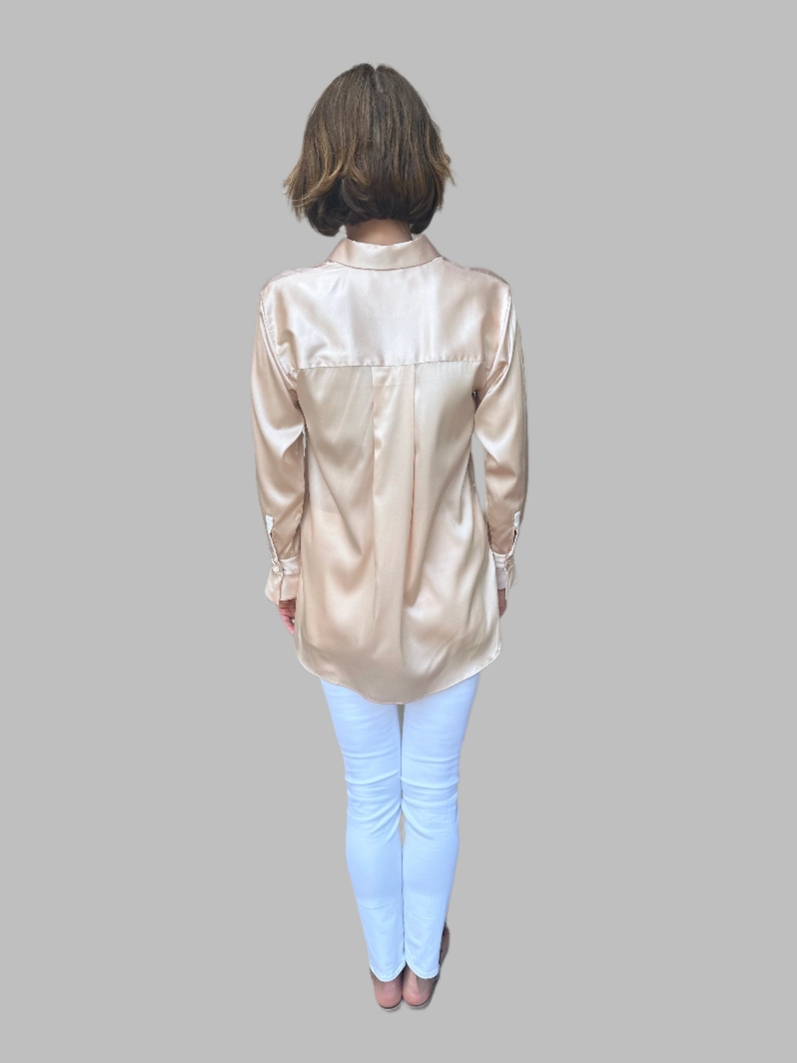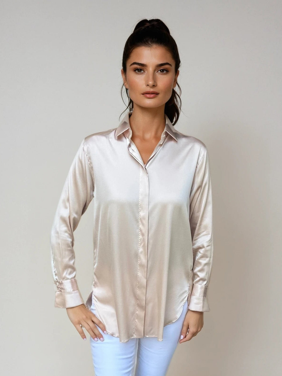 This elegant silk blouse features a smooth and luxurious texture, offering a timeless, sophisticated look