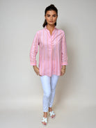 A lightweight pink blouse with vertical orange stripes, featuring a mandarin collar and a relaxed, tunic-style fit. Perfect for a chic, casual look