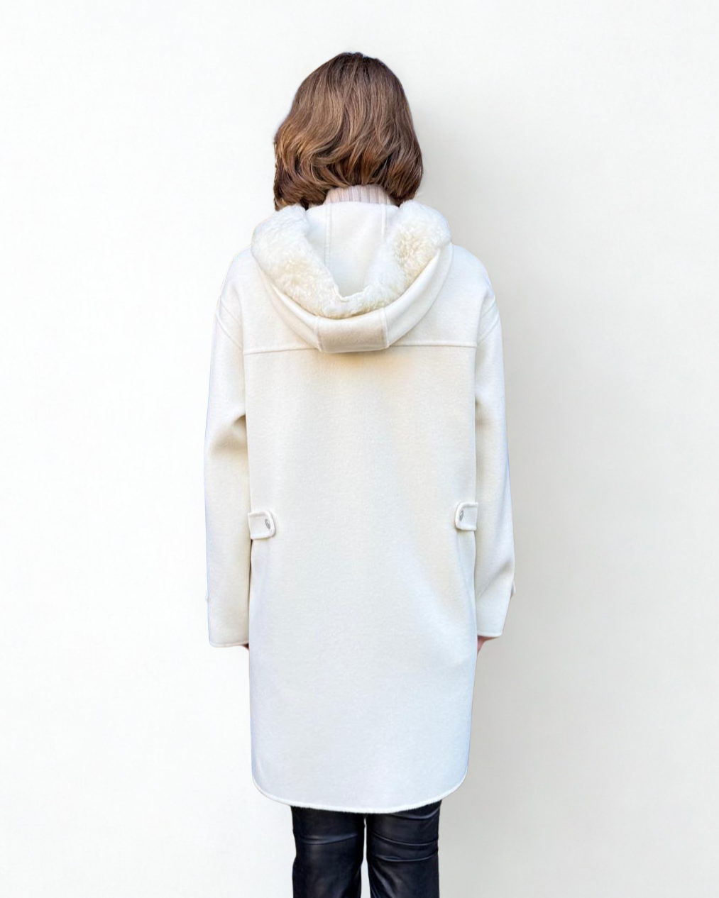 A chic cream wool coat with a cozy shearling-trimmed hood and matching pocket details. Designed in a straight silhouette with adjustable side tabs, it combines warmth, comfort, and timeless sophistication. Perfect from day to night.