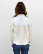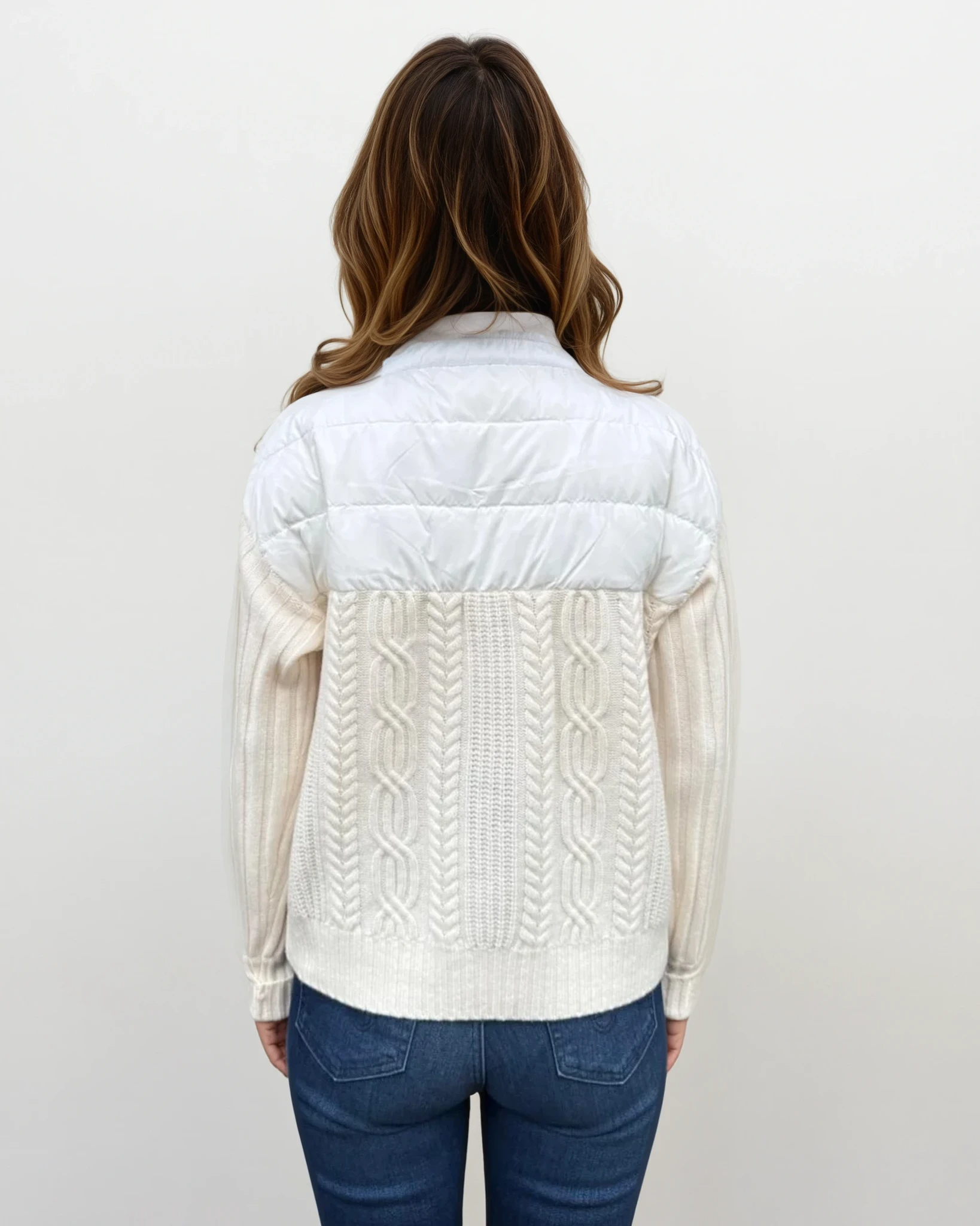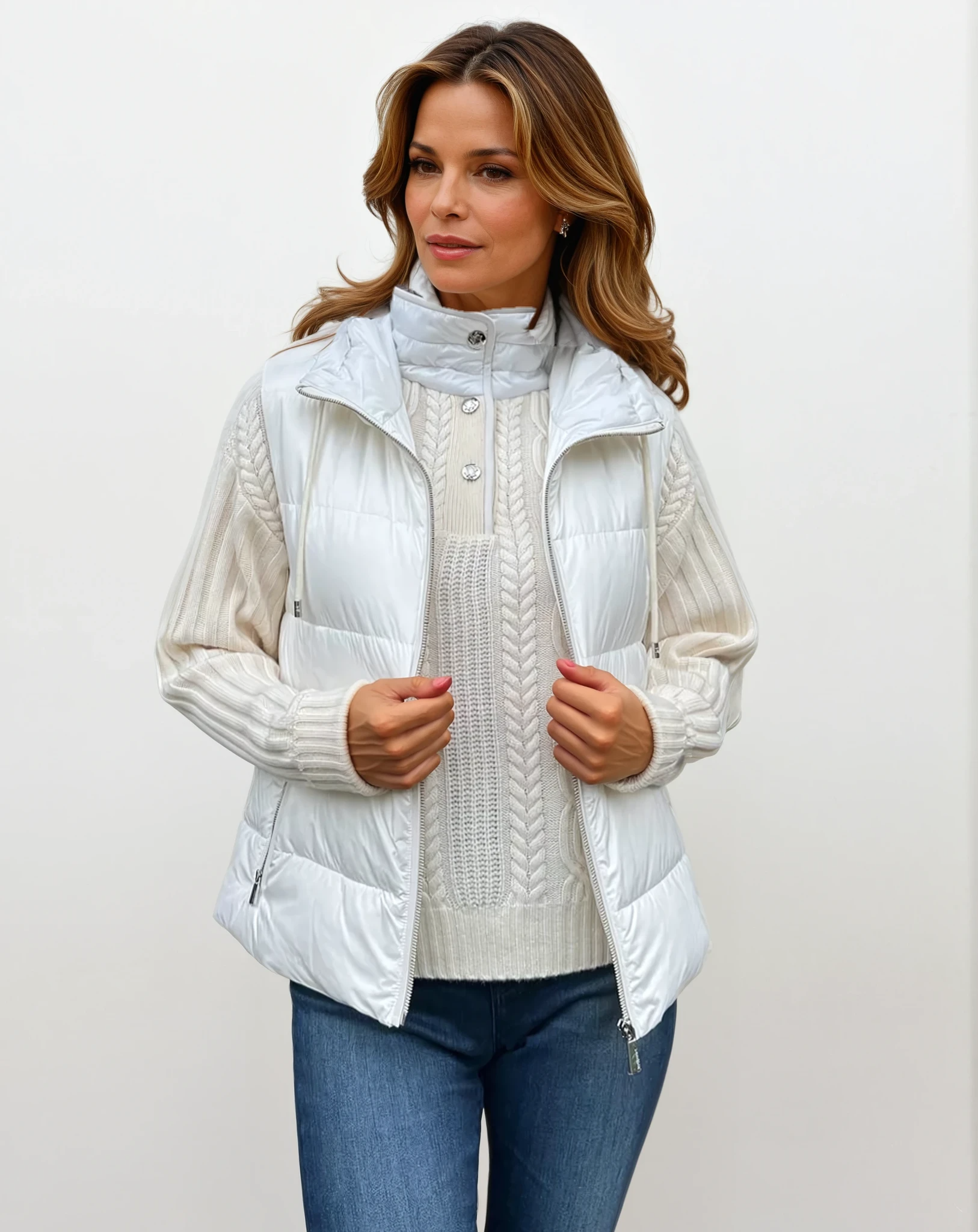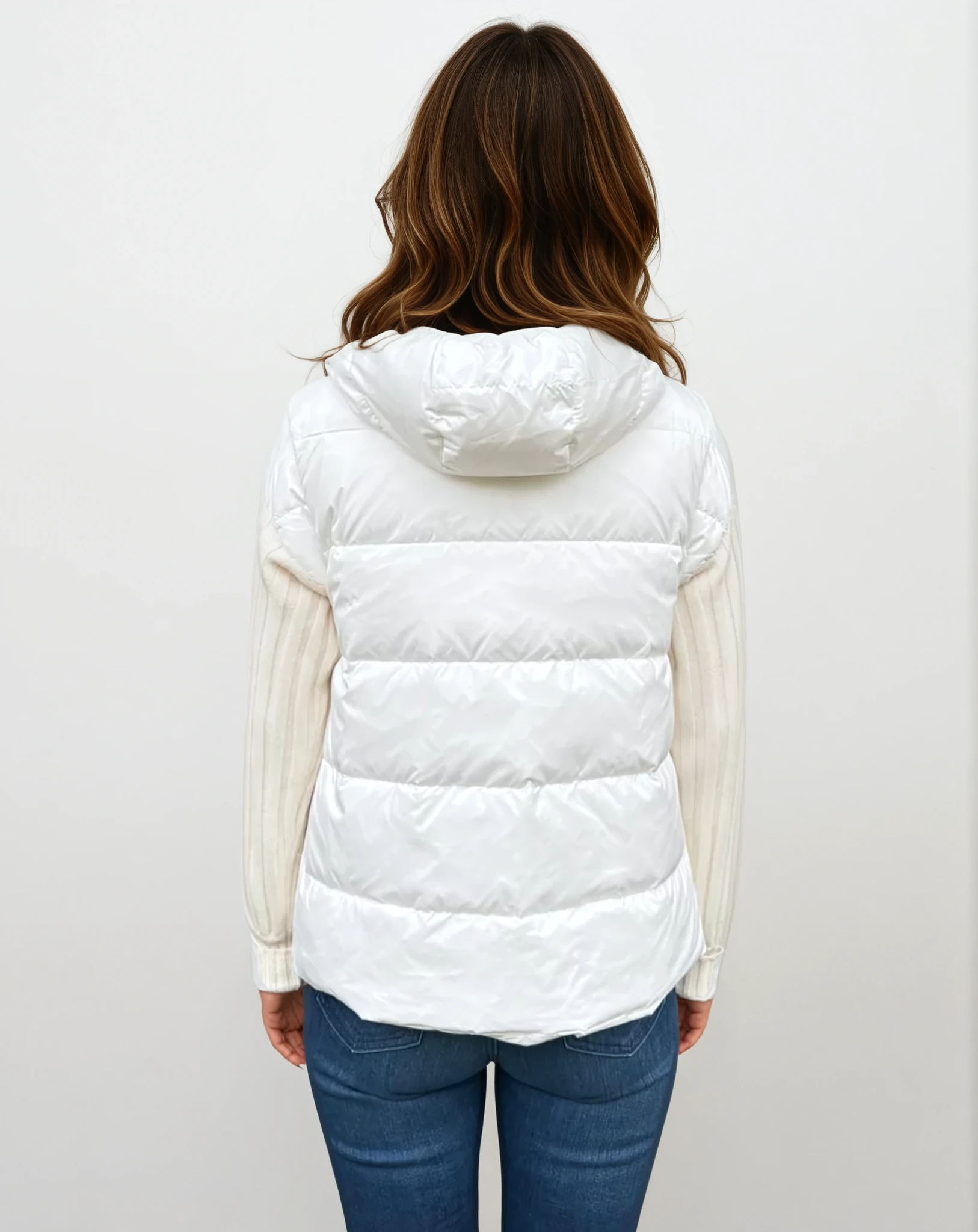 A showcase of modern luxury, this versatile two-in-one design combines a refined cable-knit sweater with quilted accents and a sleek down vest with detachable hood. Each piece can be worn separately or layered together, offering endless styling possibilities. Chic, functional, and cocooning, it’s the perfect piece to move effortlessly from city days to weekend escapes.