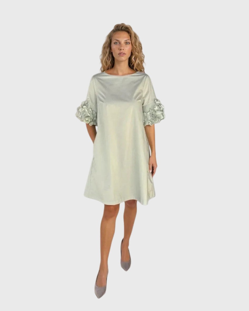 Effortlessly elegant, this Italian cotton dress features a relaxed A-line silhouette designed for comfort and timeless style. Delicate dimensional floral appliqués adorn the sleeves, adding a feminine touch to the clean, modern design. A soft pleat in the back provides beautiful movement and an easy, flattering fit. Perfect for warm days, luncheons, or summer evenings.