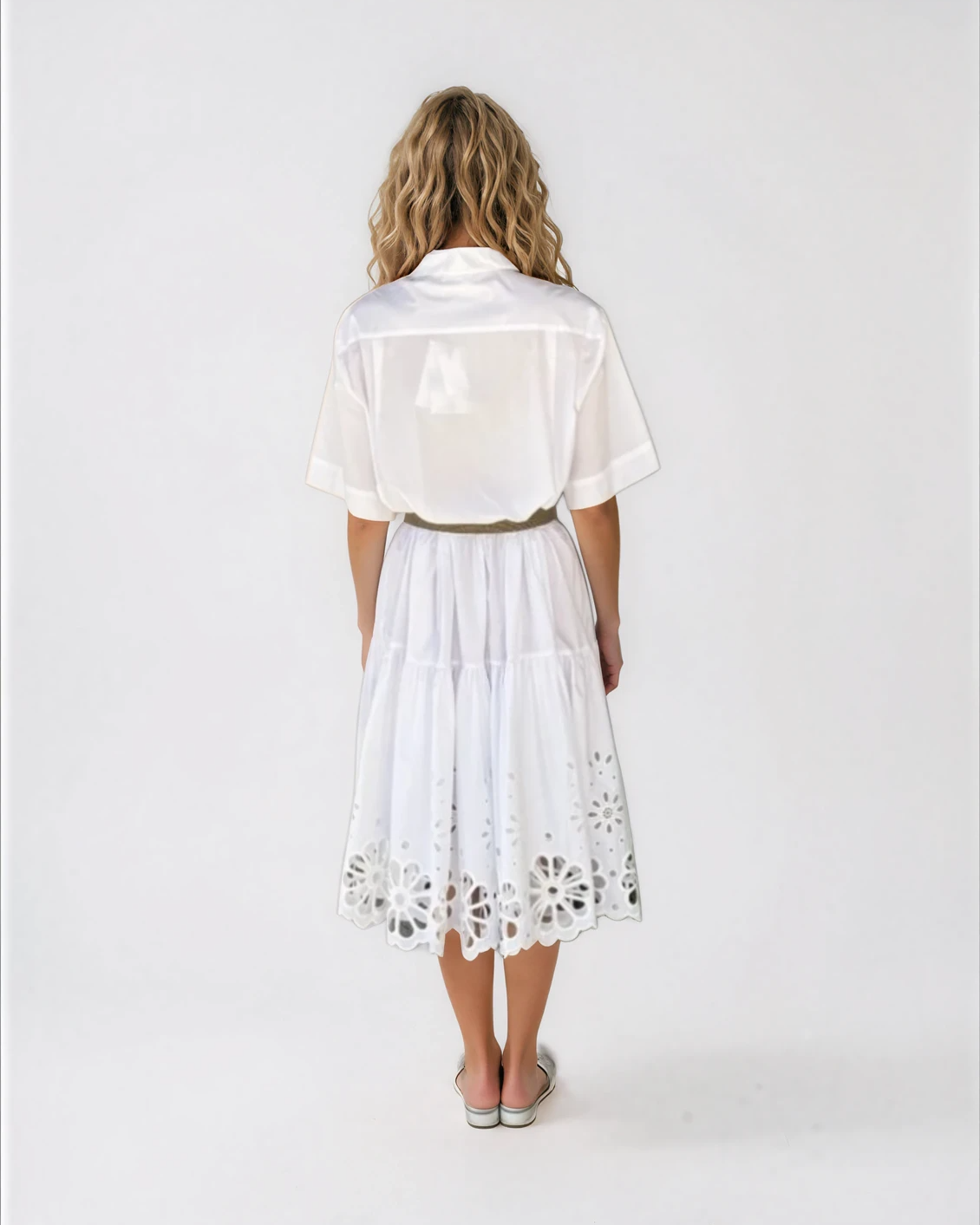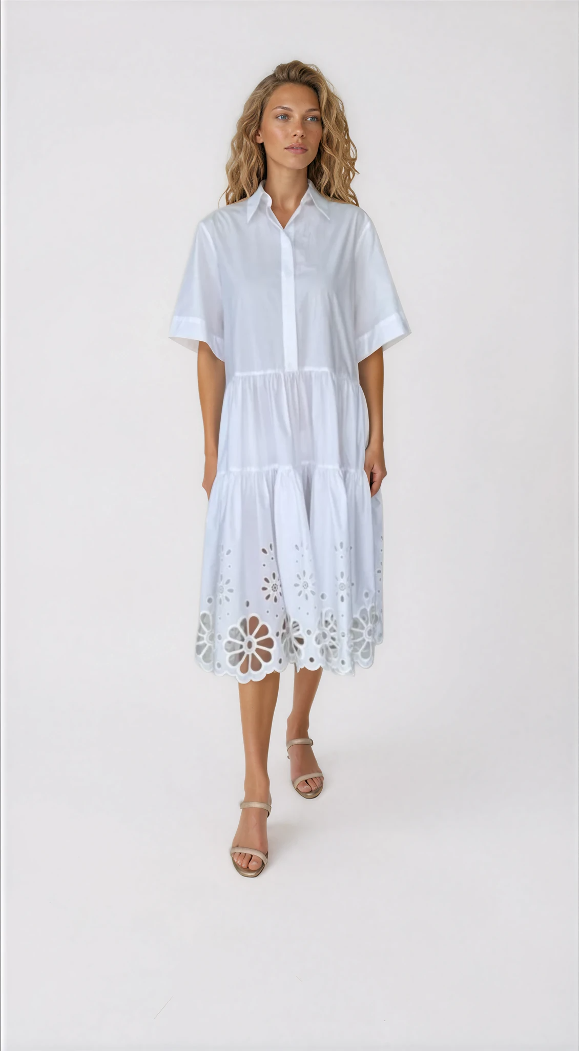 Effortlessly elegant and perfect for warm-weather days, this crisp, white cotton midi dress features a relaxed shirt silhouette with a softly tiered skirt that creates beautiful movement and volume. The hem is finished with intricate floral eyelet embroidery, adding a feminine and artisanal touch.