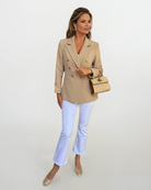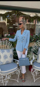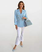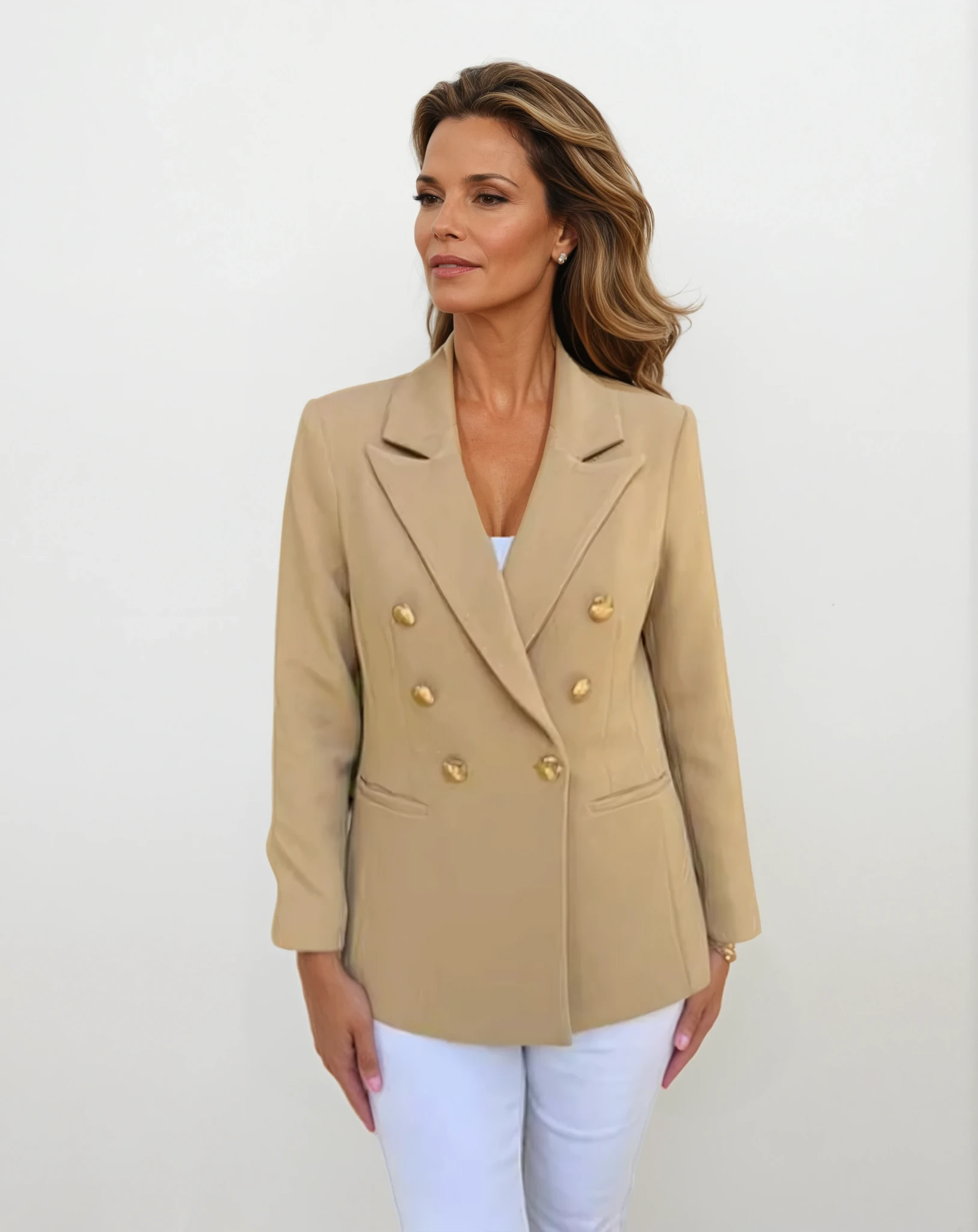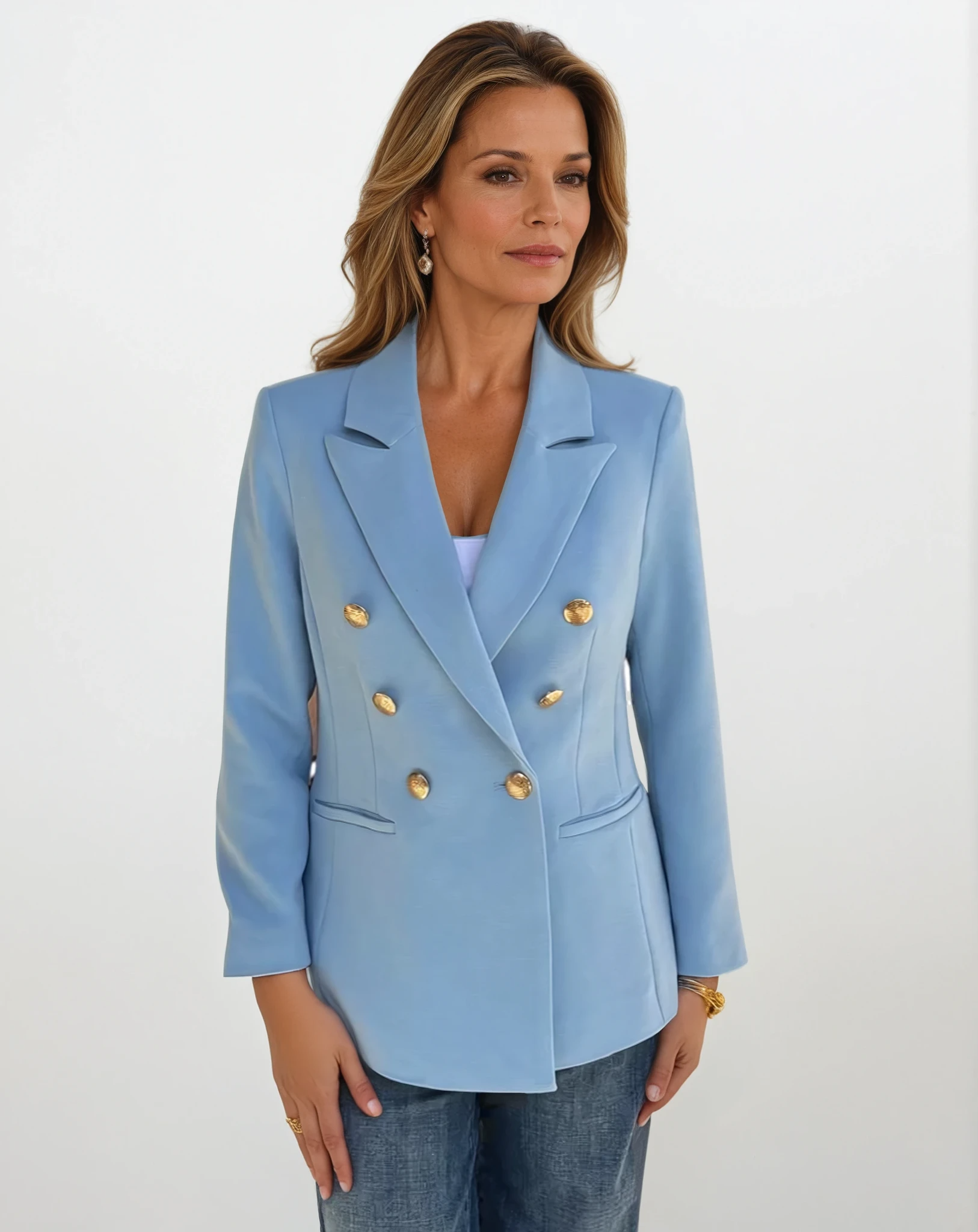 Elegant double-breasted blazer with structured tailoring and gold-tone buttons for a polished look. Features a vibrant color and contrasting cuff details, adding a pop of personality to classic sophistication. Perfect for both business and casual styling.