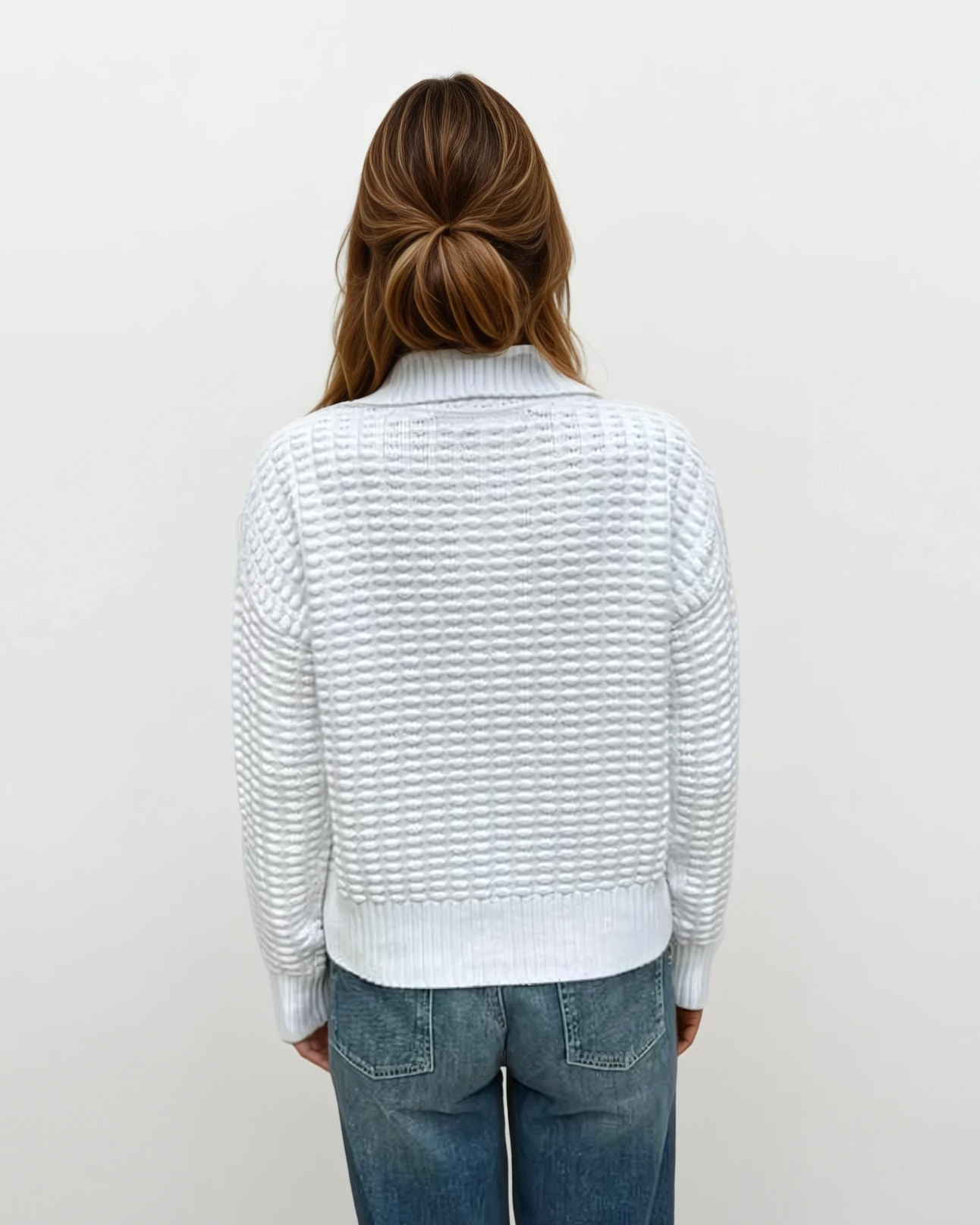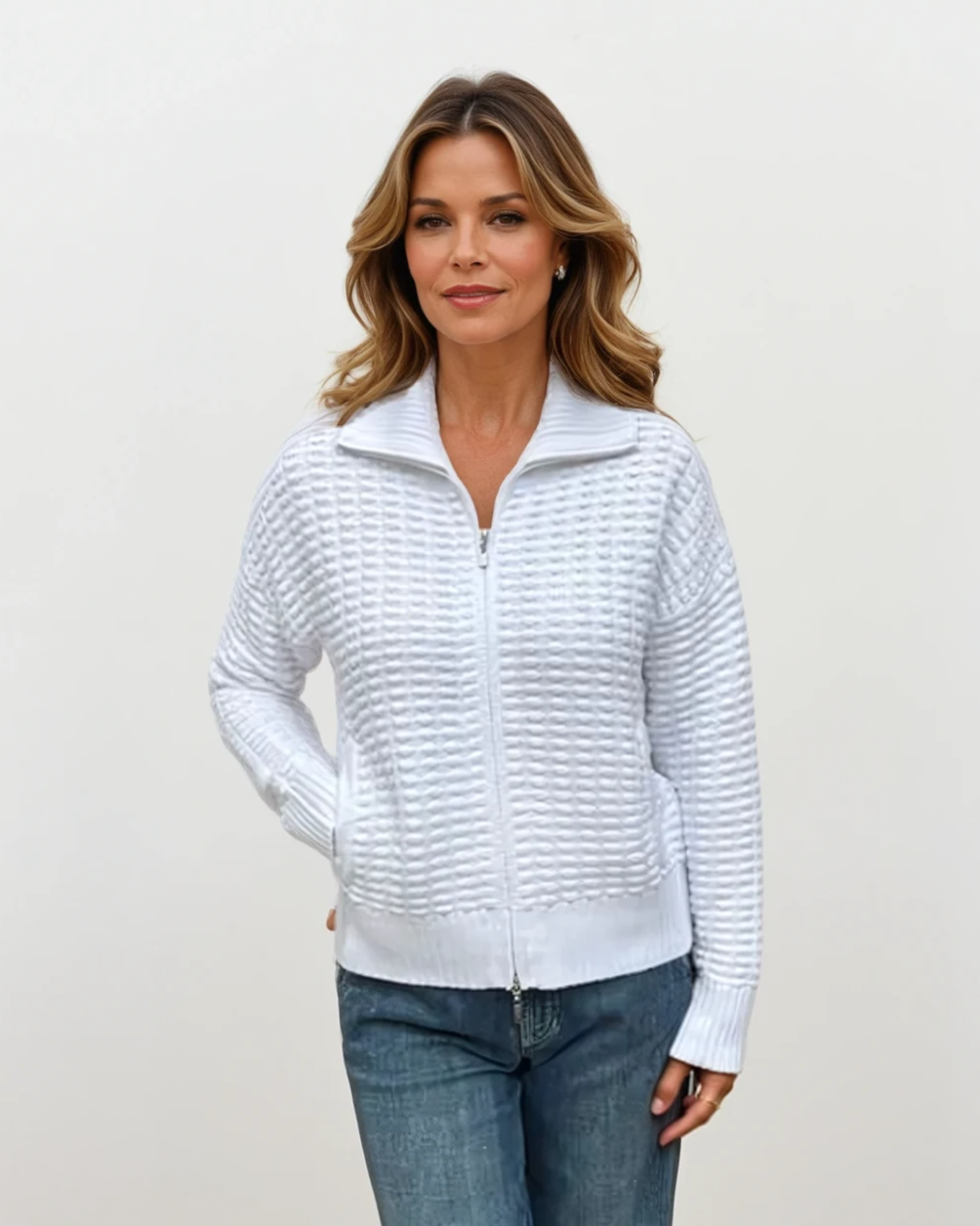 This refined zip-front knit cardigan is designed for effortless everyday elegance. Crafted from 100% cotton with a rich textured weave, it offers a perfect balance between comfort and polished style. The structured collar and clean silhouette create a timeless look that transitions seamlessly from casual daytime wear to elevated evening layering. Soft to the touch yet structured enough to hold its shape, this piece is ideal for creating understated, sophisticated outfits. A modern essential for a relaxed luxury wardrobe.