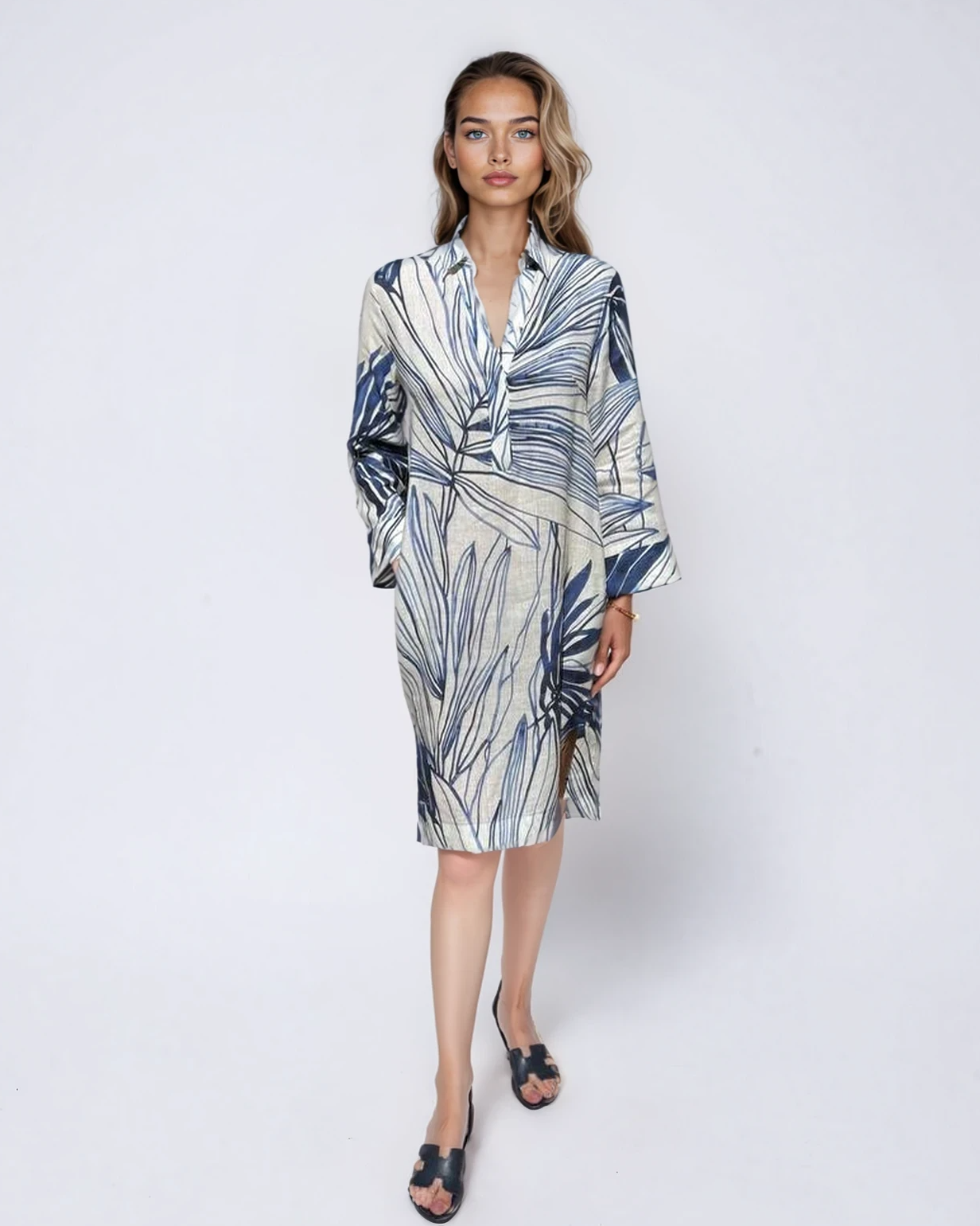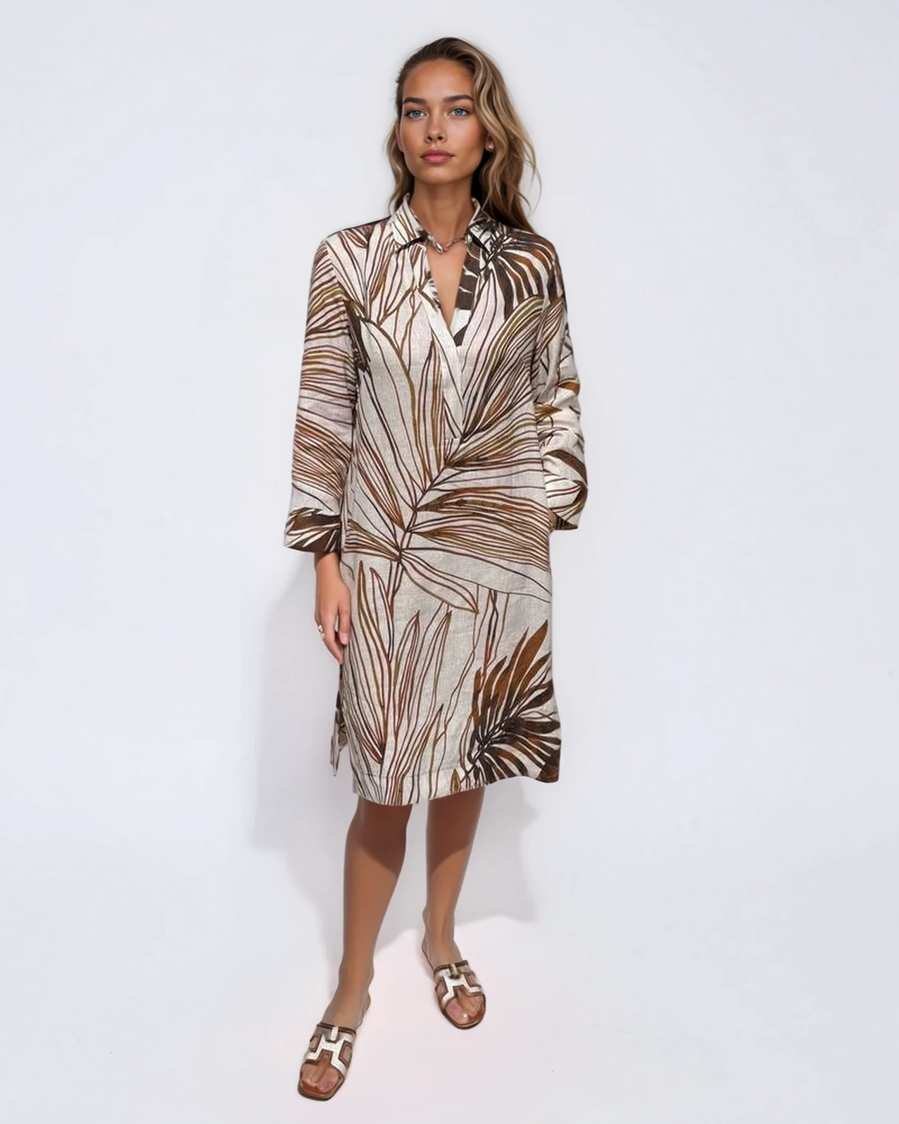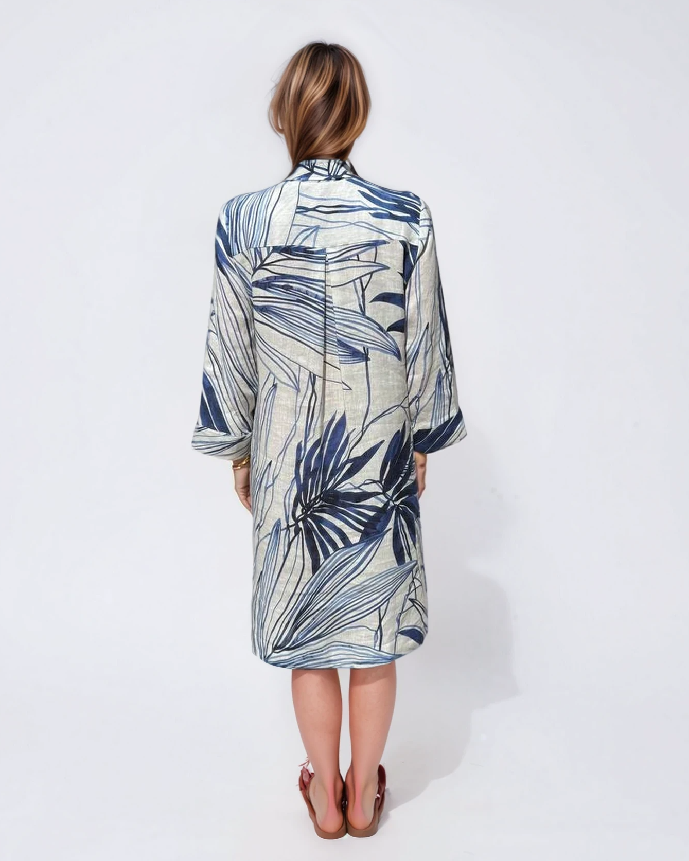 An effortless midi dress crafted from breathable natural linen. The relaxed silhouette, soft collar neckline, and botanical print create a refined yet easy look — perfect for warm days, travel, and everyday elegance.