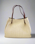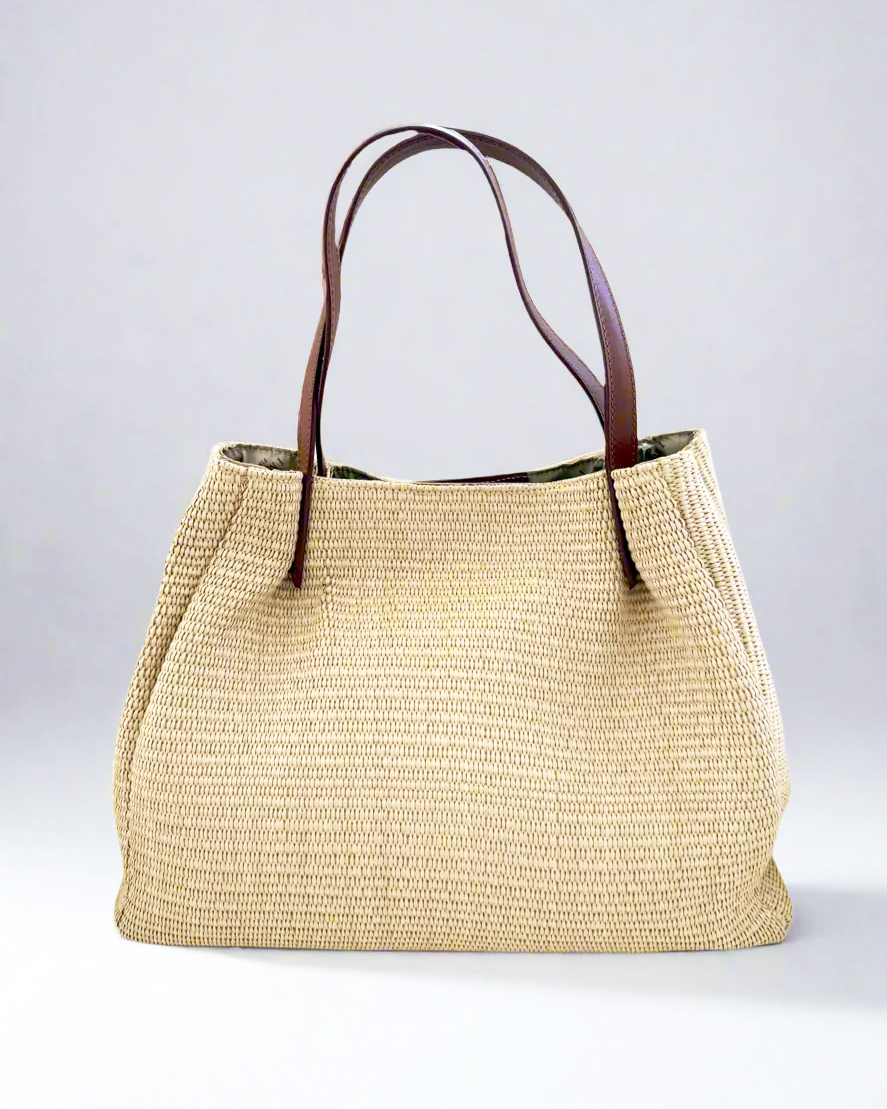 Effortlessly stylish and perfect for everyday use, this woven raffia tote blends natural texture with a spacious silhouette. Accented with slim leather shoulder straps and a soft, collapsible structure, it’s ideal for carrying your essentials in warm-weather style — whether you’re headed to the market, the beach, or the city.