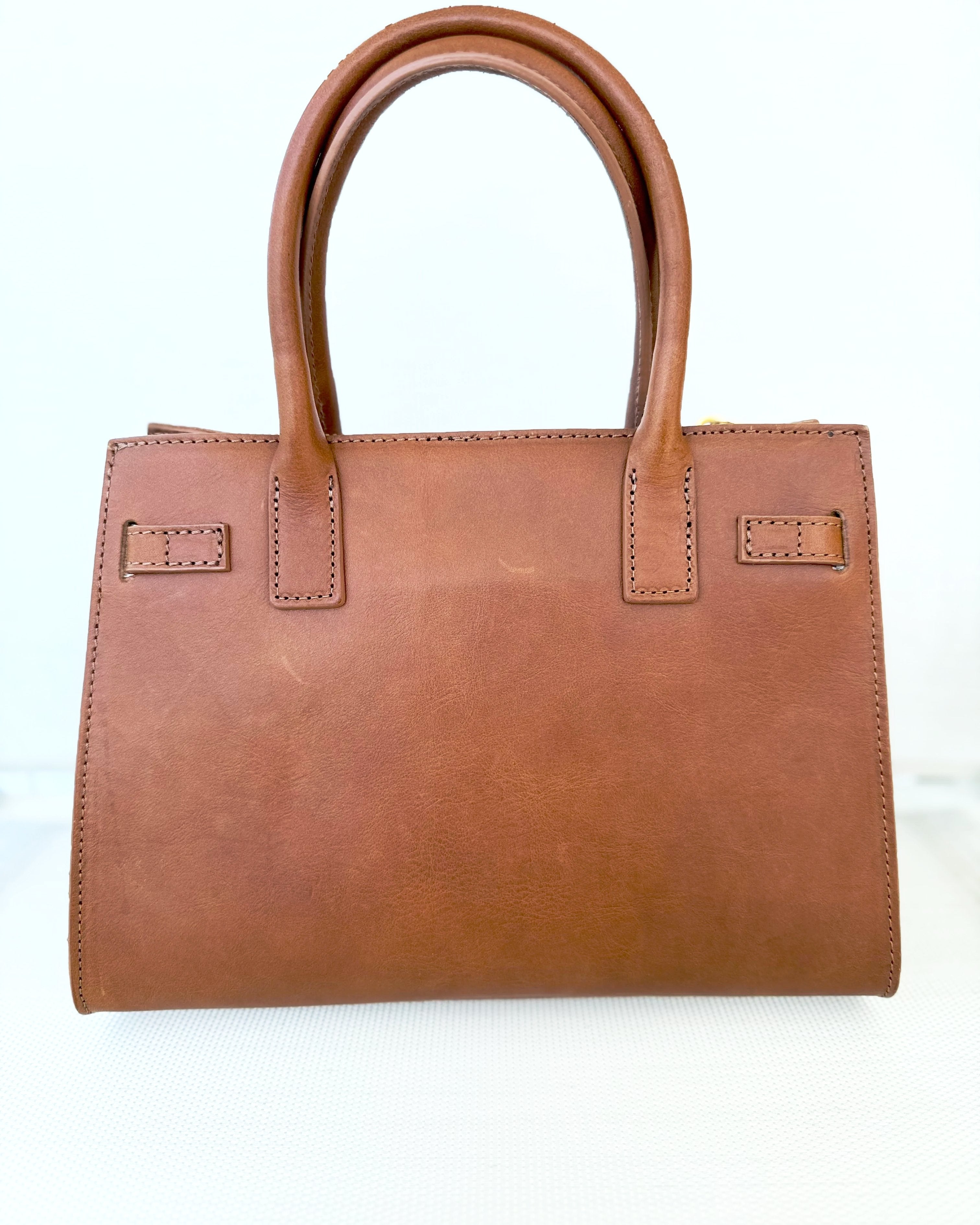 - Front strap with gold-tone turn-lock detail (non-functional)