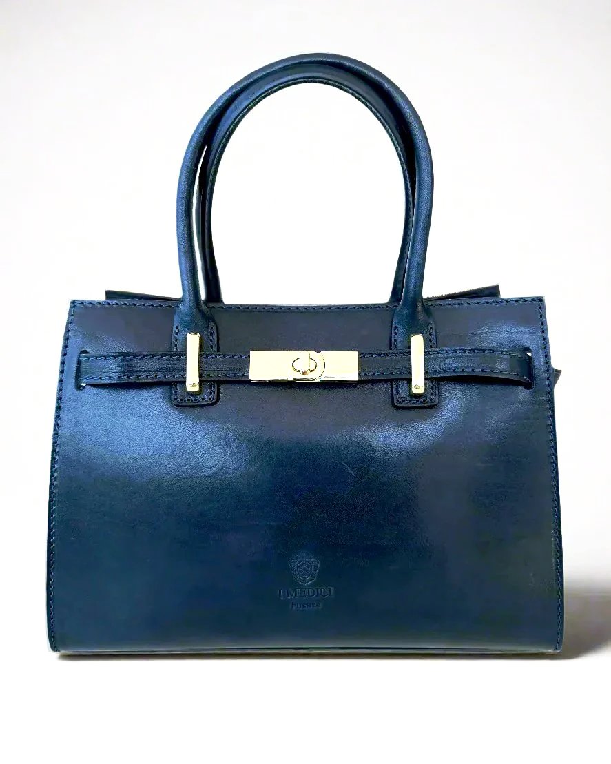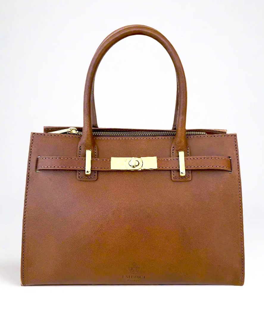 Timeless and sophisticated, this structured leather handbag by Medici of Florence is crafted in smooth Italian leather with clean lines and polished gold-tone hardware. Featuring a top zip closure and a sleek front strap detail with a gold turn-lock accent, it’s the perfect everyday bag that transitions effortlessly from work to weekend.