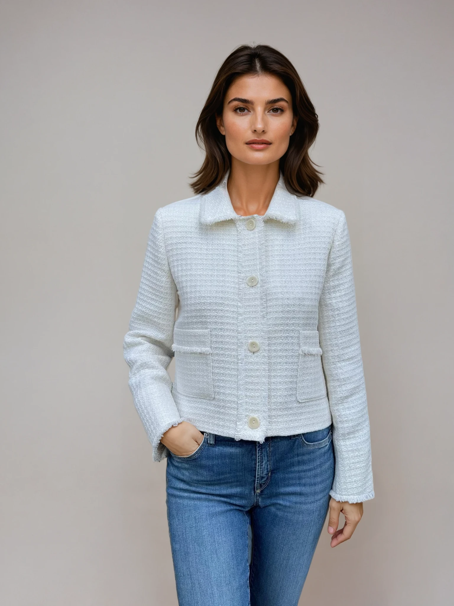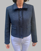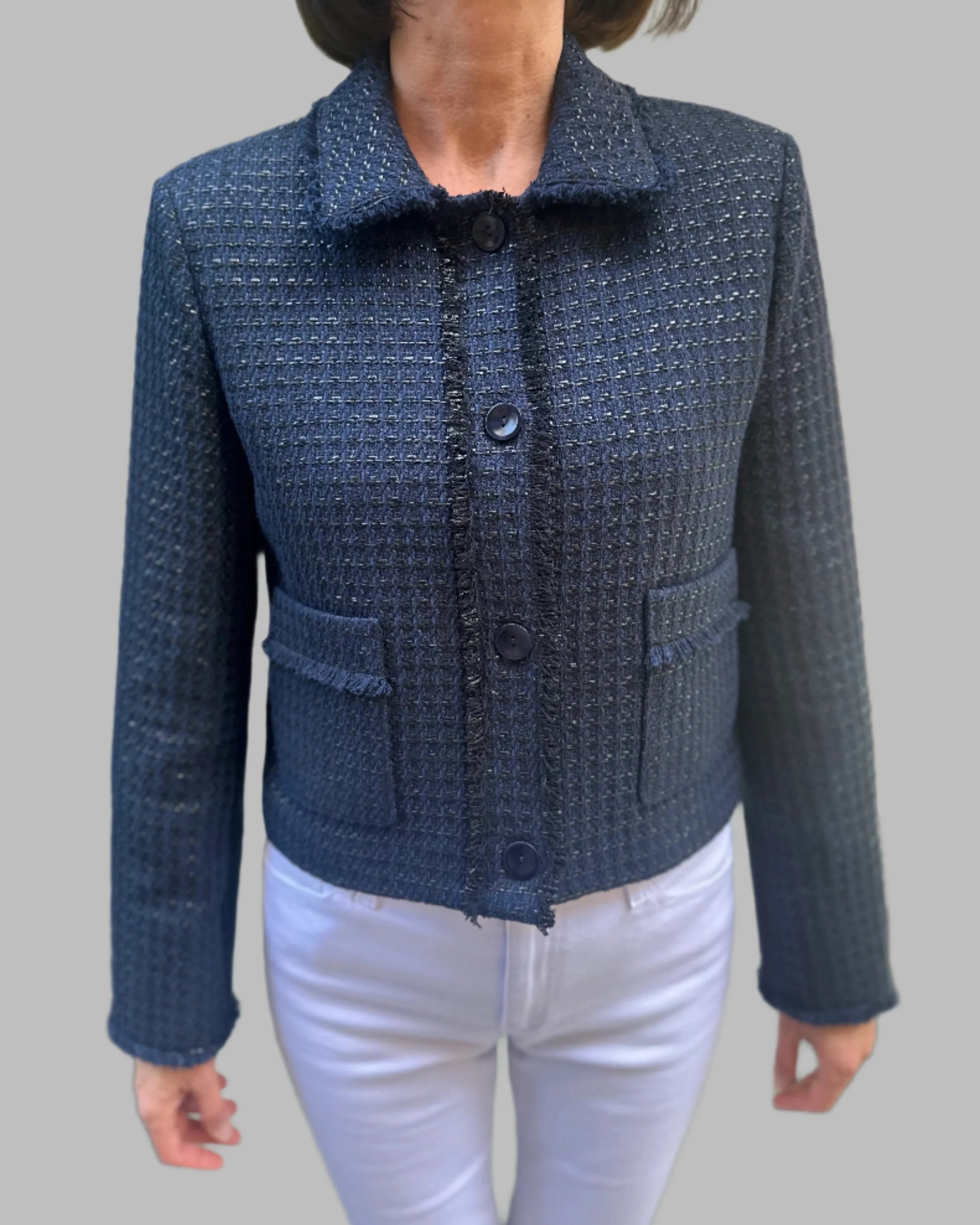 Chic and timeless, this cropped bouclé jacket features a soft, textured weave with subtle metallic threads for a touch of shimmer. Designed with a classic collar, front flap pockets, and tonal buttons, it’s finished with delicate fringe trim that adds just the right amount of edge. Perfect for dressing up denim or layering over a dress for effortless elegance.