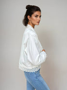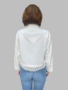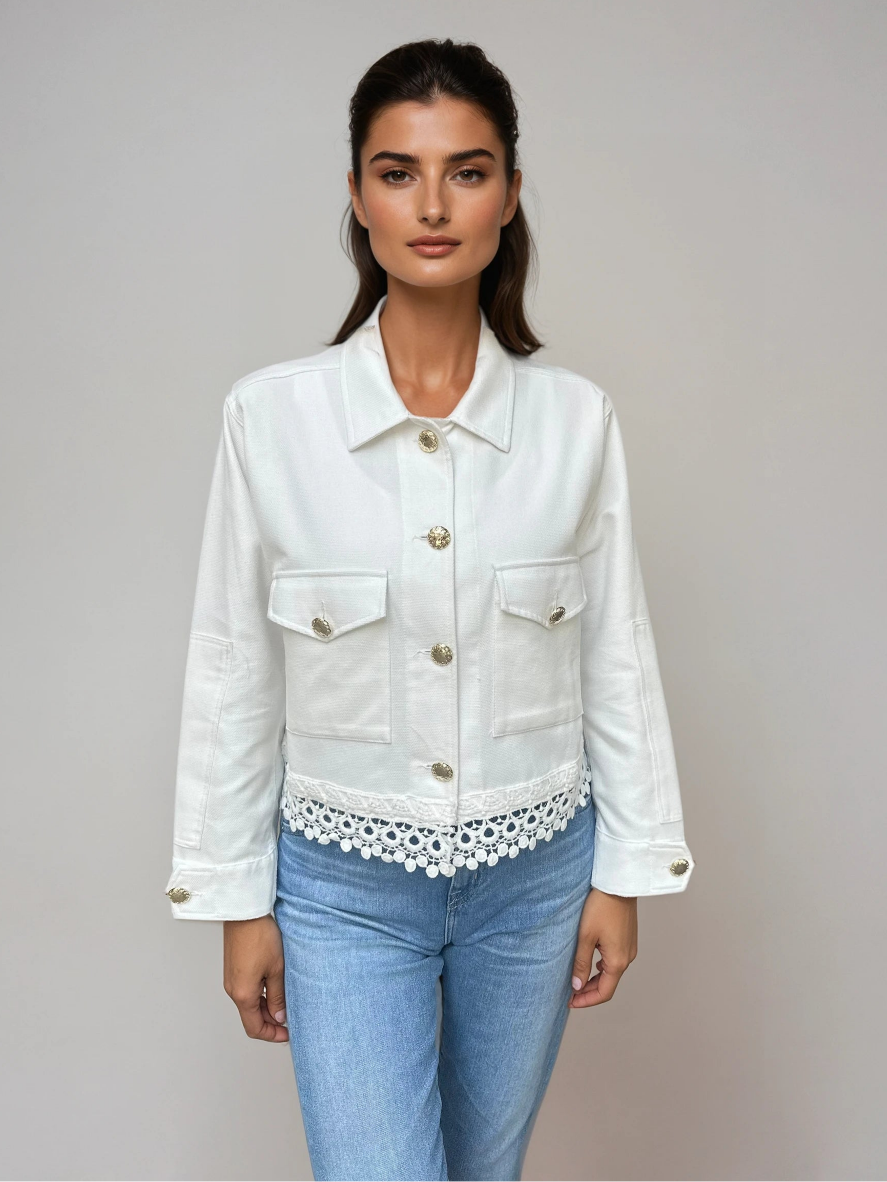 Chic white jacket with gold button accents and delicate lace trim. Features front pockets for a stylish yet functional touch, perfect for layering with casual or dressy outfits