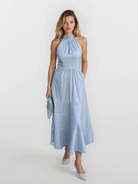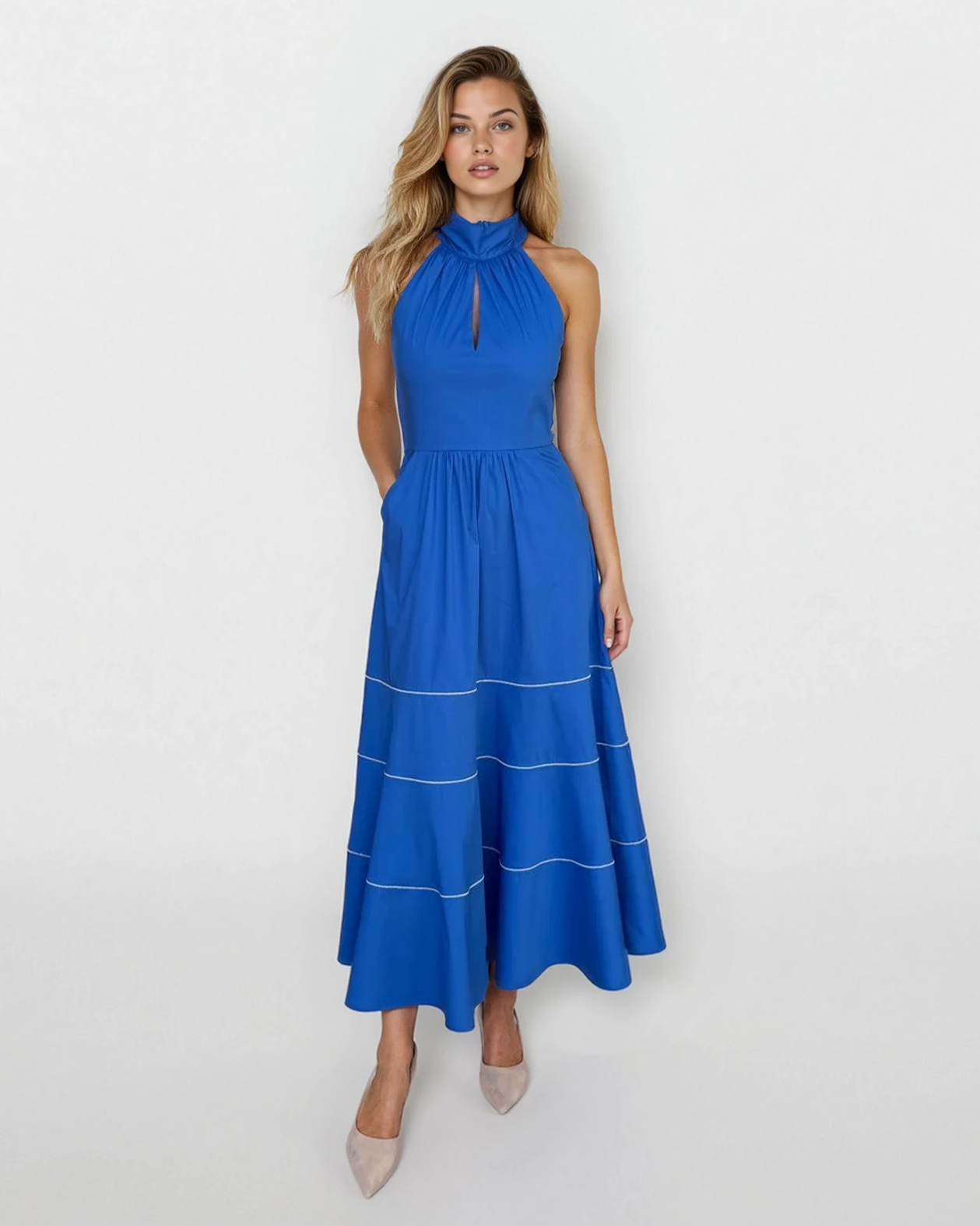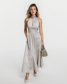 Elegant and timeless, this black maxi dress by Purotatto features a halter neckline and a tiered skirt with Monelli beaded detail. Lightweight and versatile, it’s perfect for special occasions.