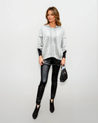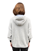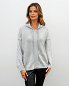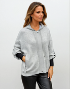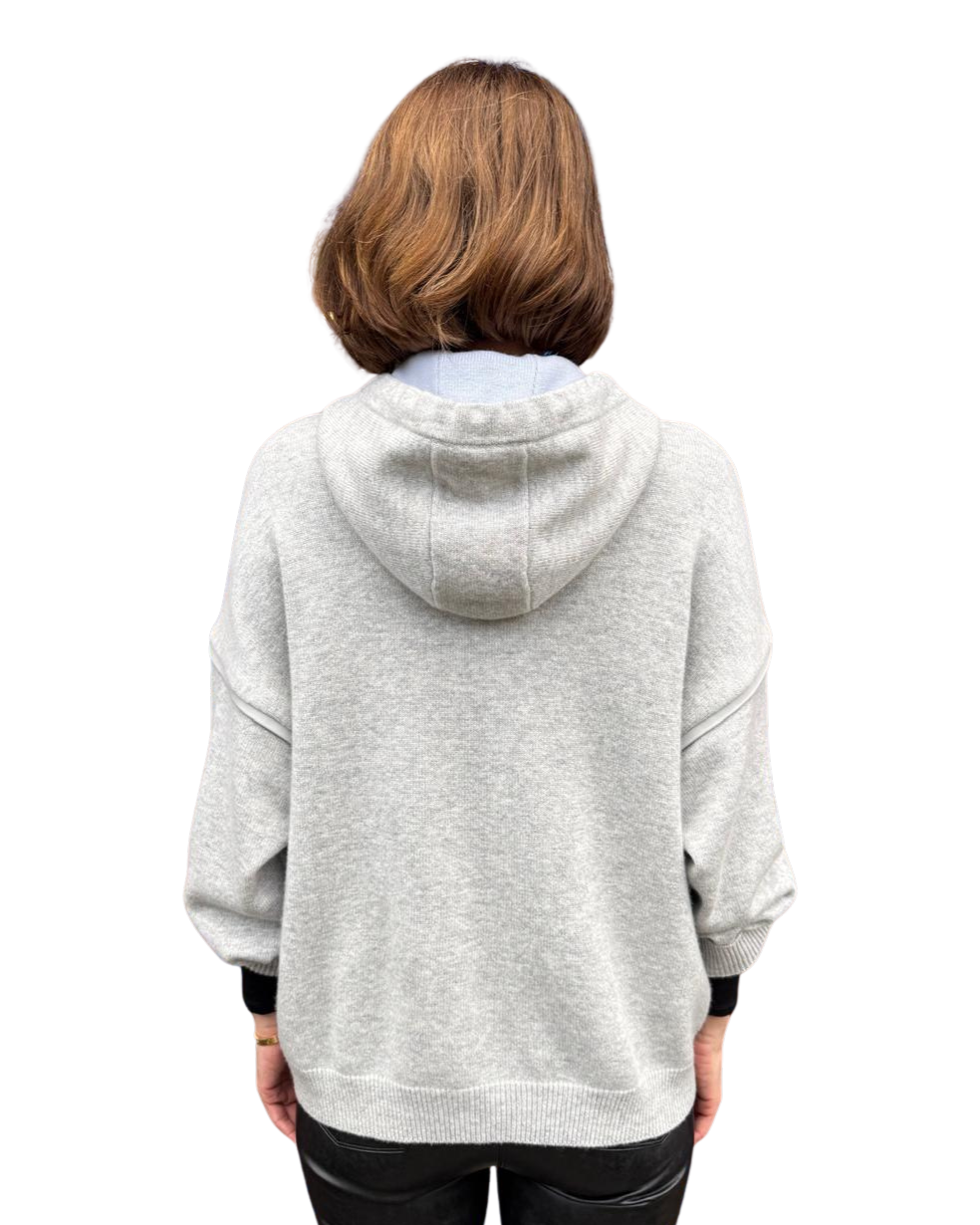 Effortlessly chic and luxuriously comfortable, this heather-grey zip hoodie elevates casual dressing with a modern edge. Crafted in a soft cashmere-blend knit with sleek leather-trimmed placket, it features ribbed cuffs, adjustable hood, and snap-zip details at the sleeves and pockets. The relaxed silhouette drapes beautifully, making it perfect with leather leggings or tailored trousers for polished off-duty style.