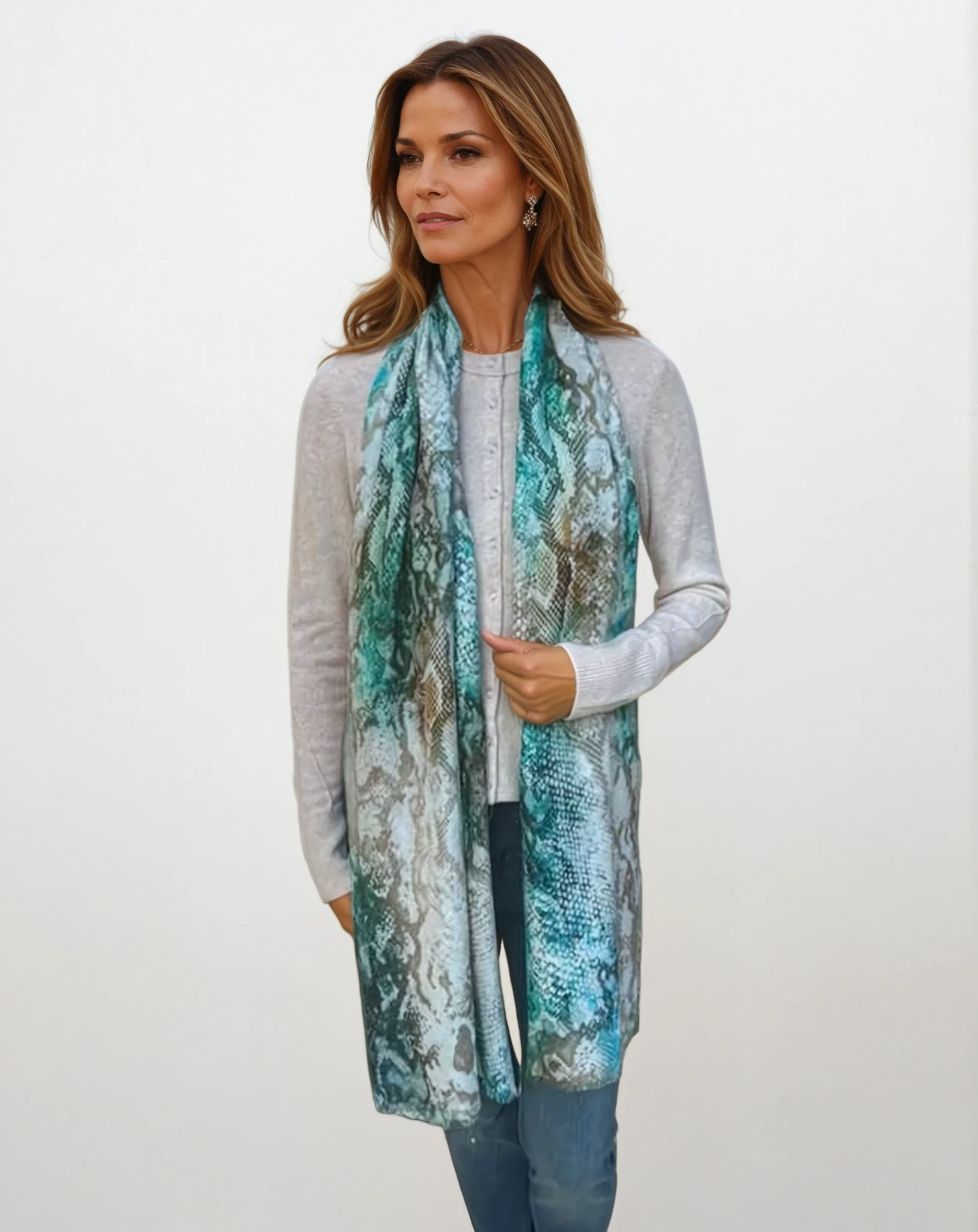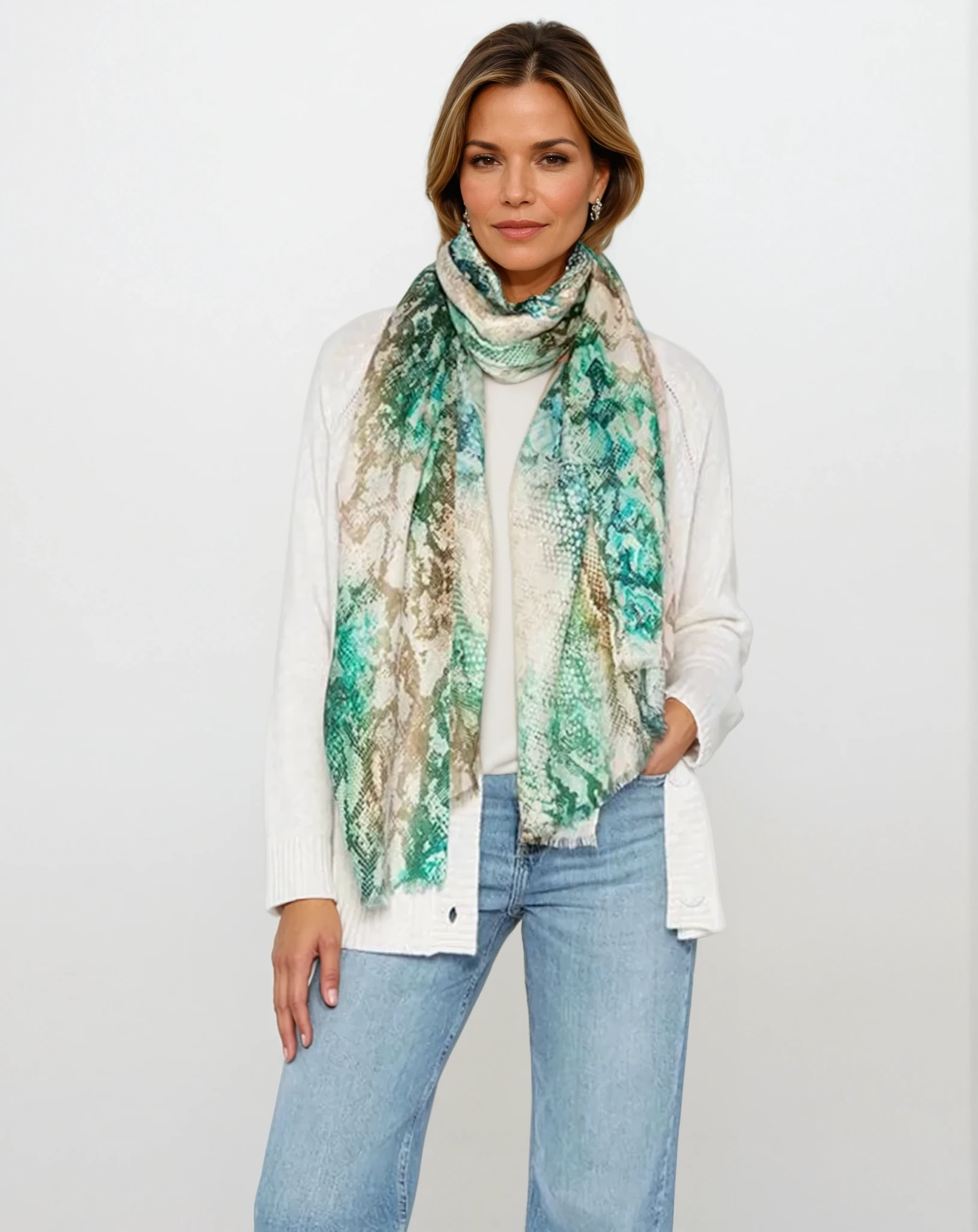 Elevate your luxury collection with the ISLAND SKIN PRINT SCARF, a versatile accessory crafted from an exquisite silk-cashmere-blend-woven of 50% Wool, 25% Silk, and 25% Cashmere. Experience the ultimate softness and enduring elegance as this one-size scarf effortlessly complements any look, adding a refined touch of beauty and sophistication. Drape it around your neck for daytime polish or let it cascade over your shoulders for evening glamour—a timeless piece designed for the discerning connoisseur of luxury accessories.