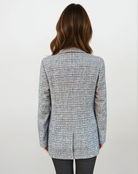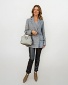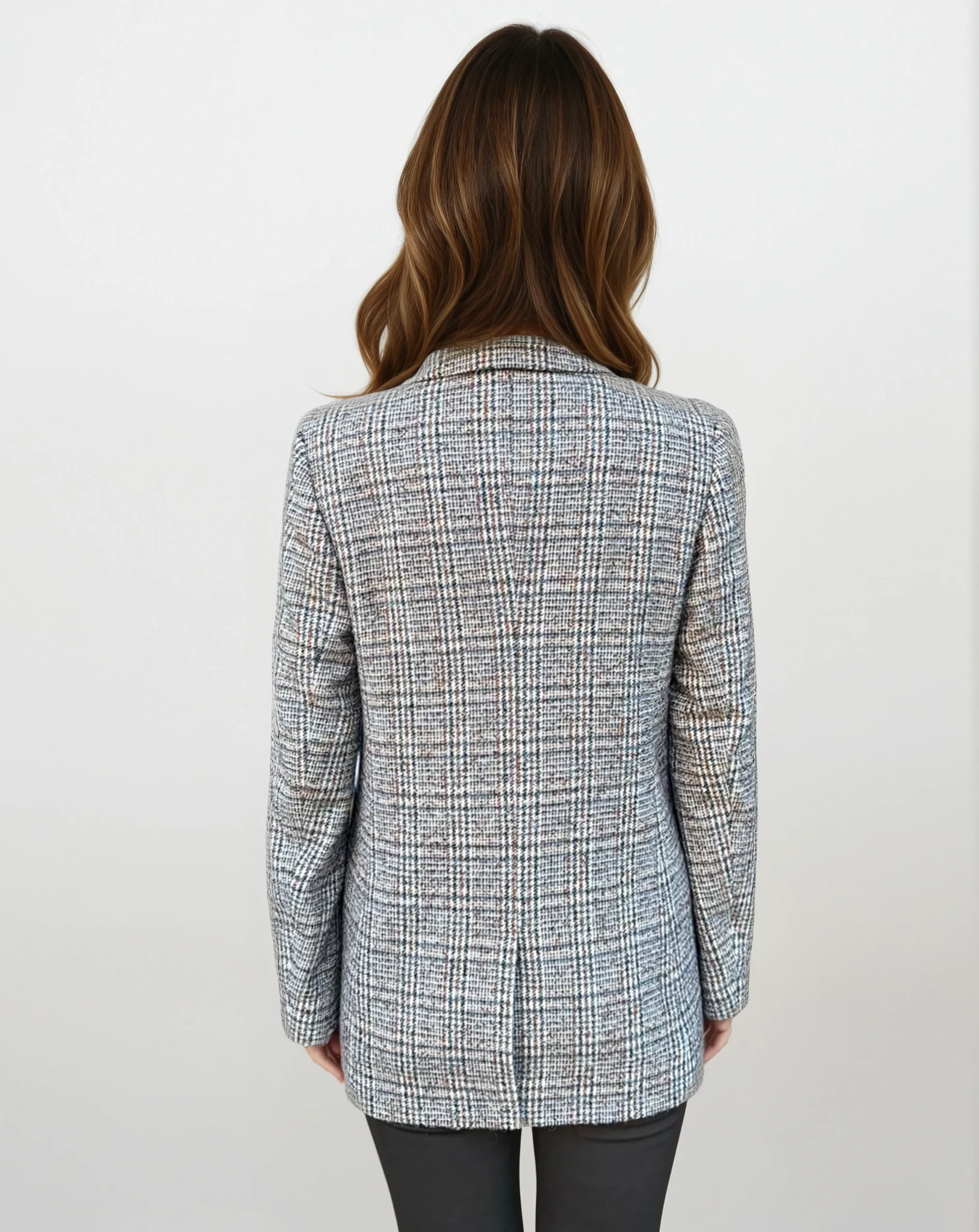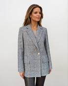 A timeless double-breasted blazer in a refined Glen plaid pattern, crafted in Italy by Purotatto. Blending virgin wool, cotton, and soft-touch fibers, it drapes beautifully while offering warmth and structure. The neutral palette of taupe, ivory, and subtle blue lends effortless sophistication—perfect from day to dinner. Finished with classic lapels, horn-style buttons, and a tailored silhouette that complements both denim and leather.