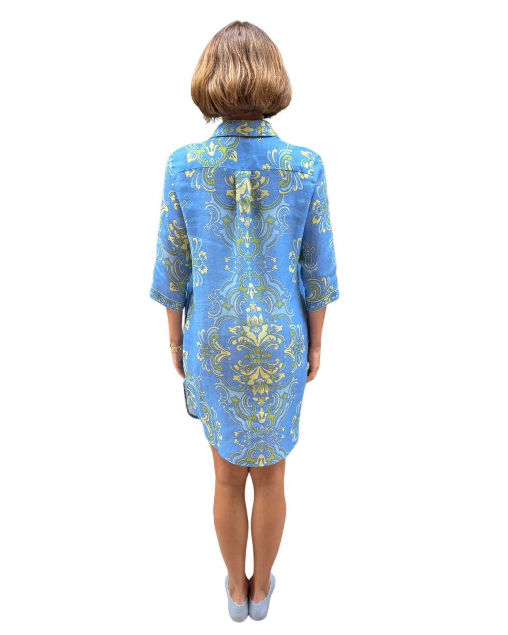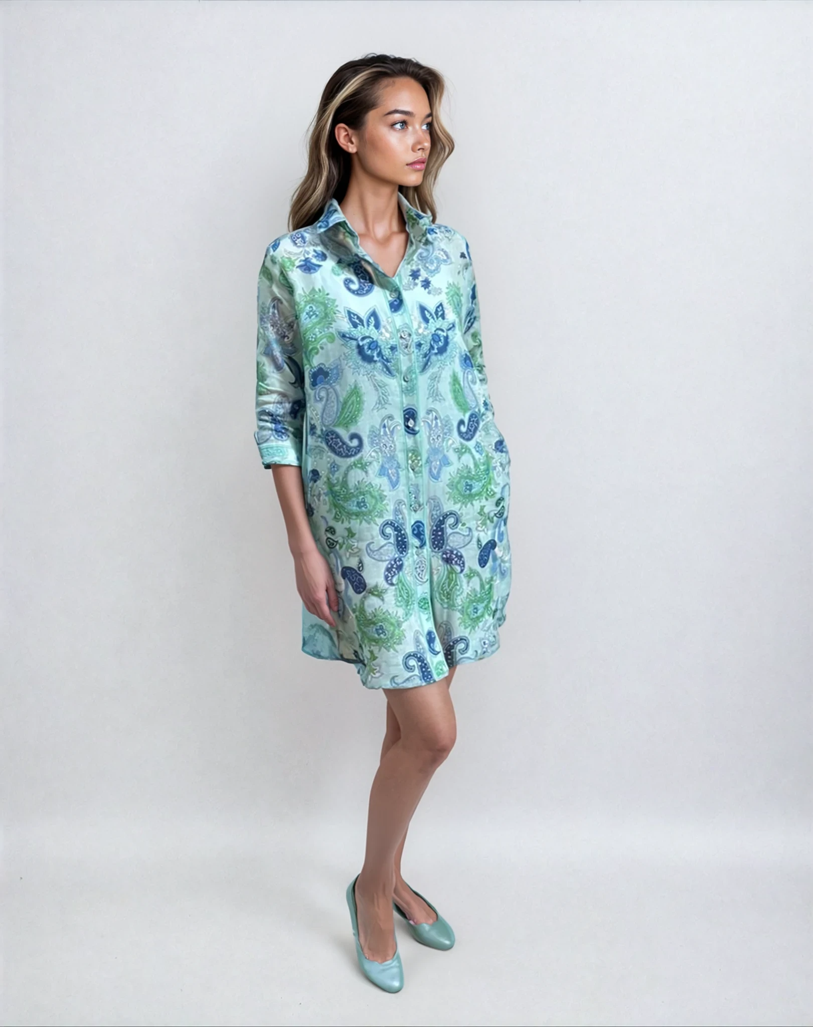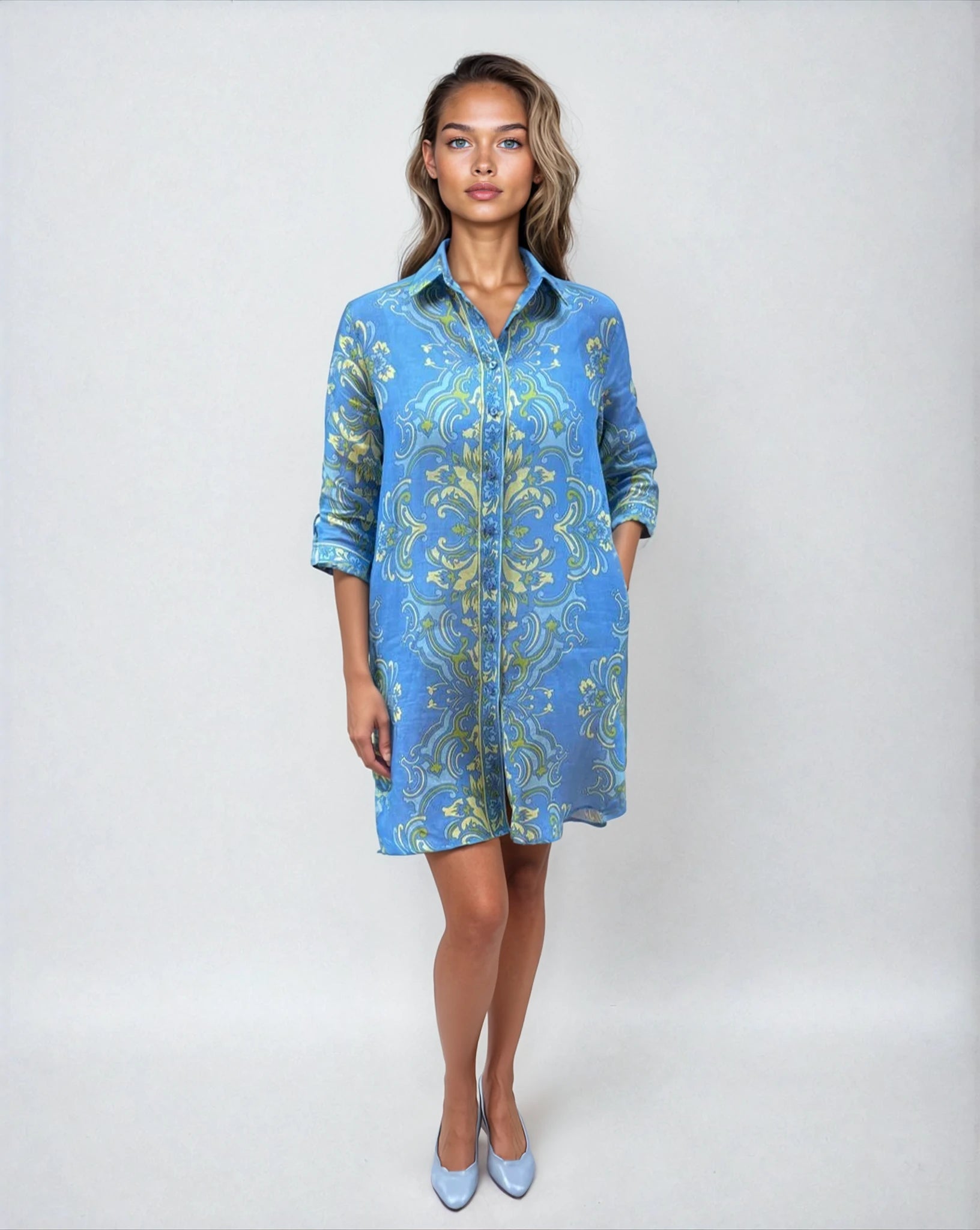 Effortlessly elegant and endlessly versatile, this Italian linen button-down dress is designed to move seamlessly from relaxed days to polished evenings. Featuring a refined collar, three-quarter sleeves, subtle side slits, and discreet hidden pockets, it offers both comfort and thoughtful tailoring. Wear it on its own as an easy, breezy dress, or style it open over slim pants with a belt for a more layered, modern look—perfect as a chic cover-up, a casual daytime piece, or a dressed-up option for dinners, cruises, and vacations.