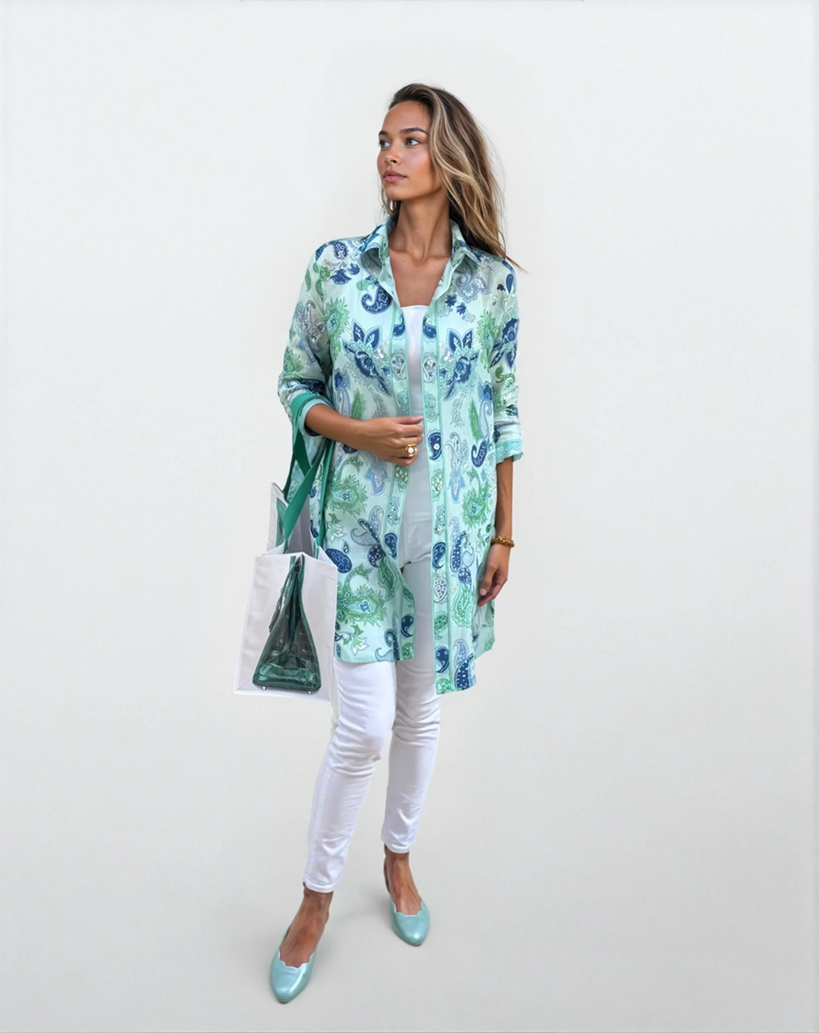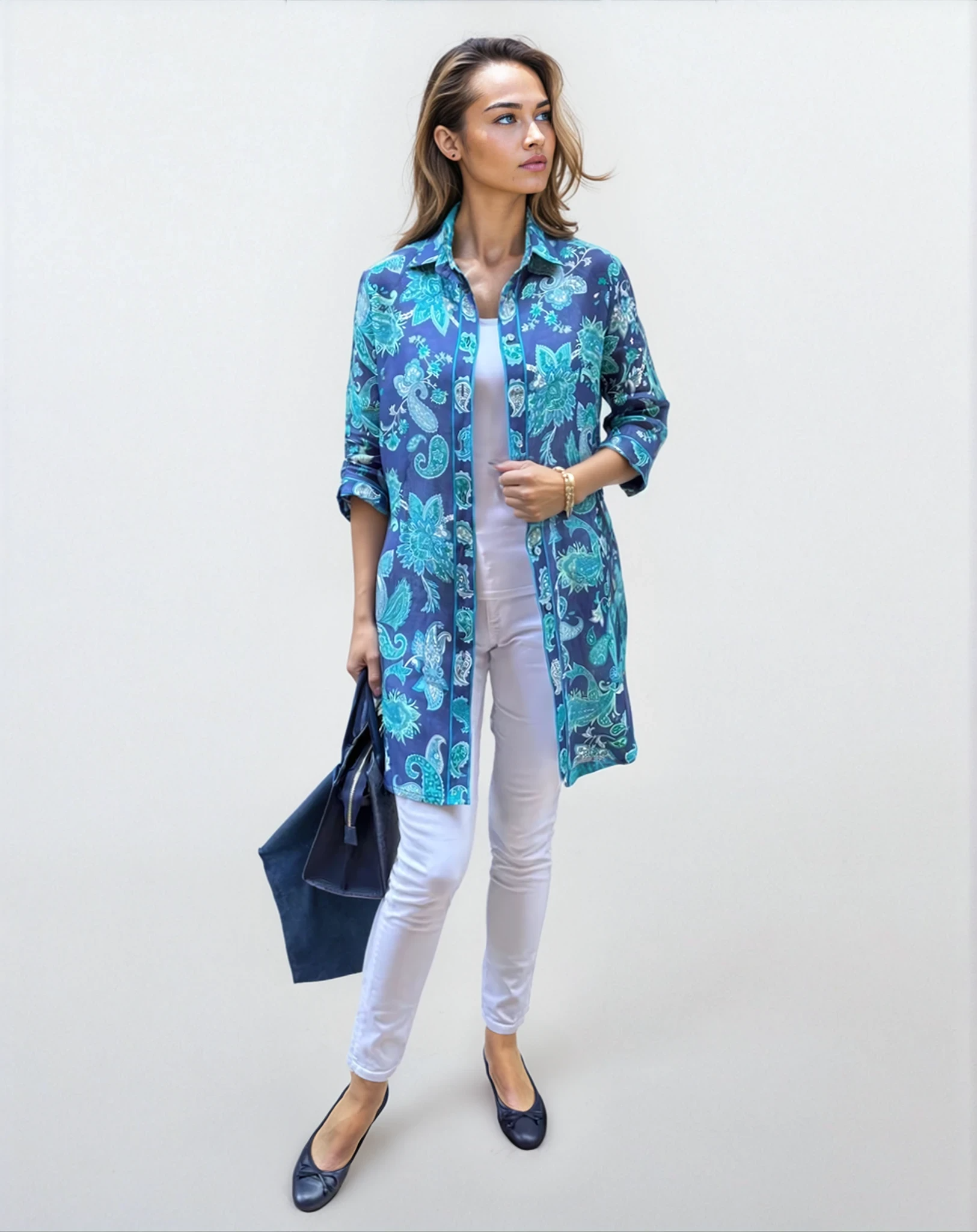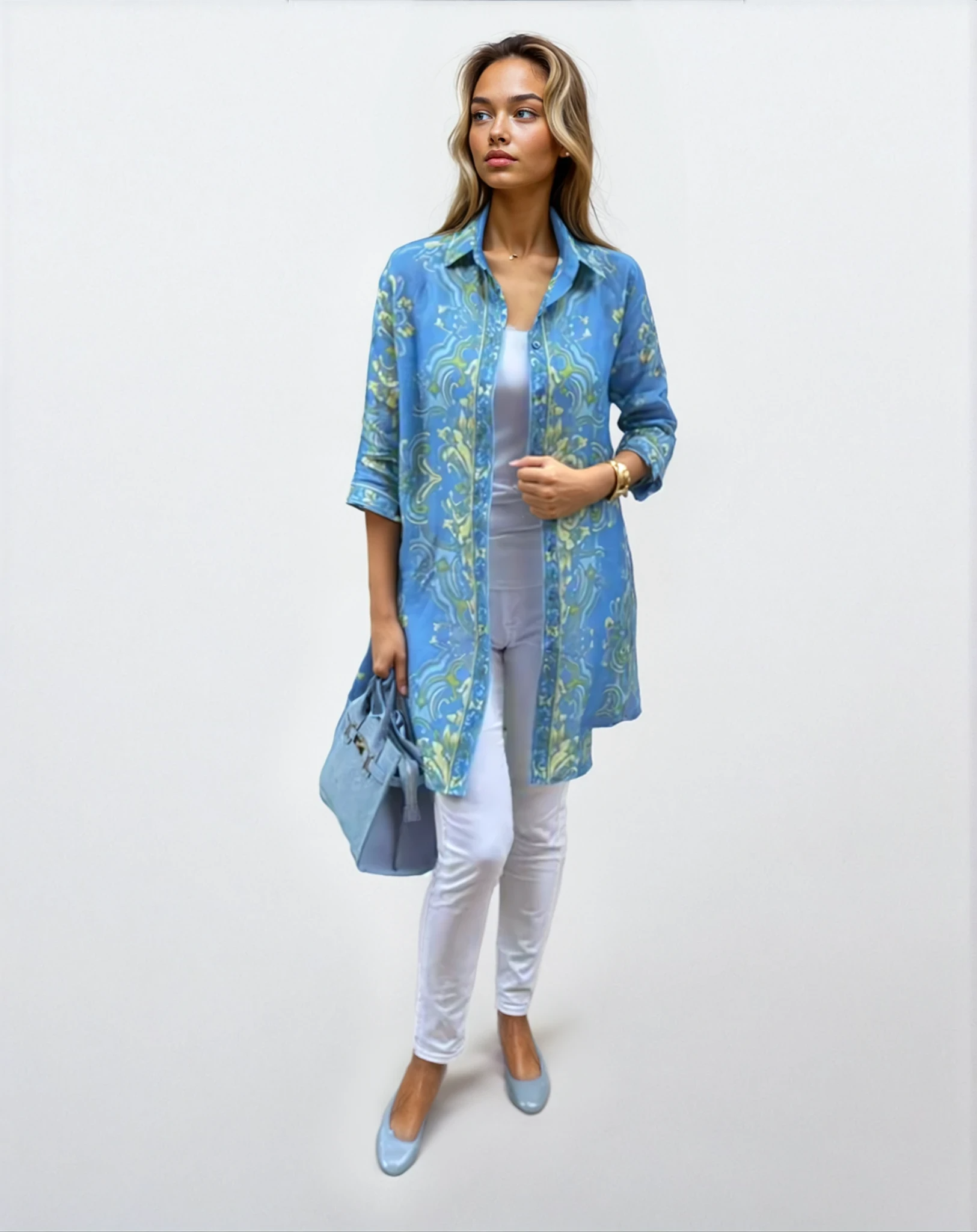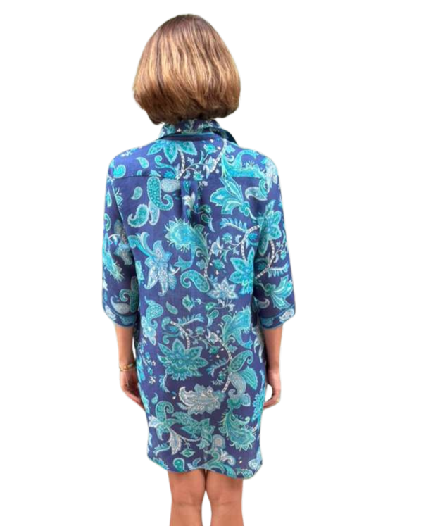 Effortlessly elegant and endlessly versatile, this Italian linen button-down dress is designed to move seamlessly from relaxed days to polished evenings. Featuring a refined collar, three-quarter sleeves, subtle side slits, and discreet hidden pockets, it offers both comfort and thoughtful tailoring. Wear it on its own as an easy, breezy dress, or style it open over slim pants with a belt for a more layered, modern look—perfect as a chic cover-up, a casual daytime piece, or a dressed-up option for dinners, cruises, and vacations.