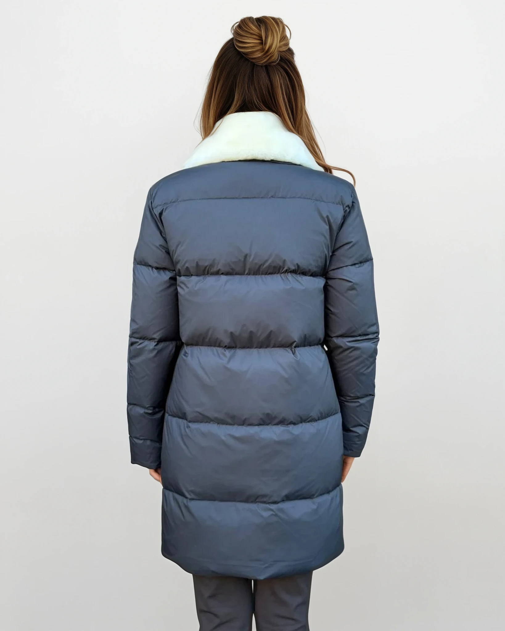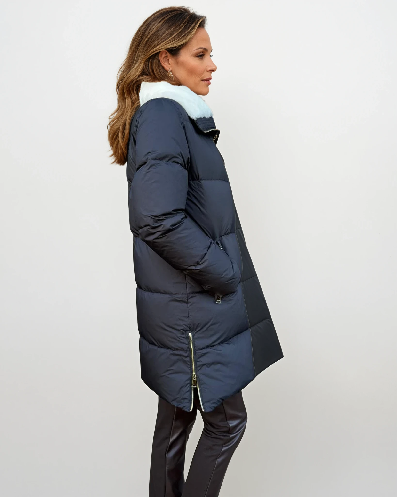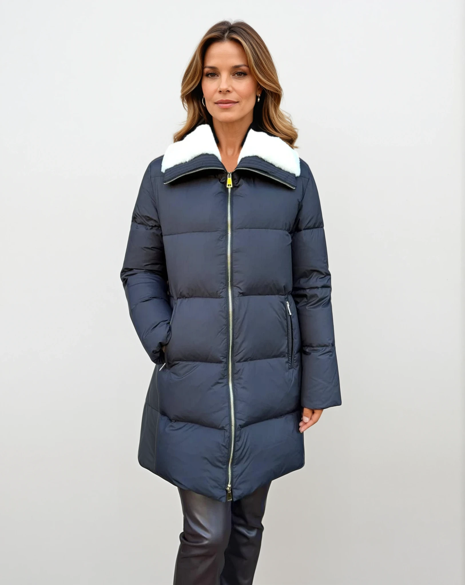 A modern essential for cold-weather dressing, this down-filled jacket combines luxurious warmth with sleek sophistication. The plush shearling collar lends a refined touch while the quilted silhouette ensures lightweight comfort and insulation. Designed with a full front zipper, practical side zip pockets, and side hem zippers for ease of movement, it’s the perfect blend of style and function—whether in the city or on a winter escape.