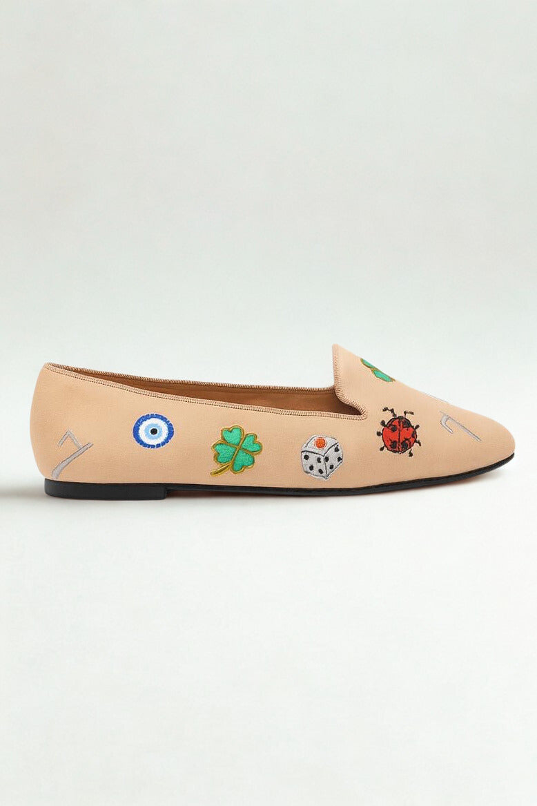 From the exclusive Nicky Hilton x French Sole Collection, this charming loafer is crafted from soft suede and adorned with hand-picked lucky symbols — embroidered four-leaf clovers, ladybugs, evil eyes, and the number seven — blending playful charm with effortless sophistication. Handcrafted in Spain with a cushioned leather footbed, this limited-edition design offers timeless style and all-day comfort from brunch to city strolls.