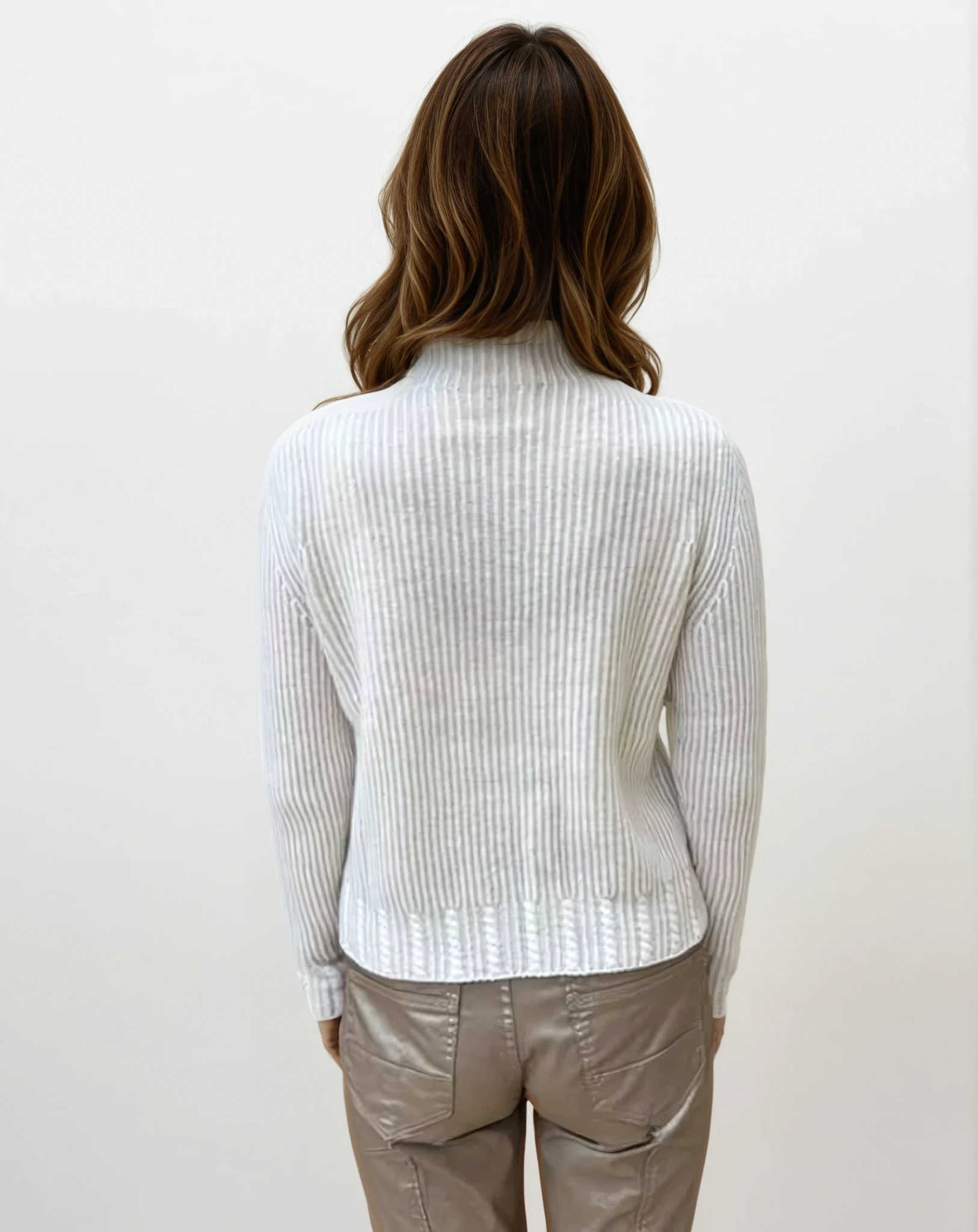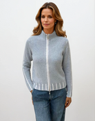 Effortlessly refined and endlessly versatile, this ribbed zip-up knit jacket is a modern essential for elevated everyday dressing. Crafted from 100% cashmere  in a soft,thicker ribbed knit with a structured silhouette, it features a sleek high neckline and a clean front zipper for a polished yet relaxed look.  The tailored fit subtly enhances the waist while maintaining comfort and ease of movement. Perfect for layering through seasons, this piece transitions seamlessly from casual mornings to refined city strolls.  Style it with tailored trousers, leather pants, or denim for a timeless, confident look.