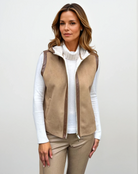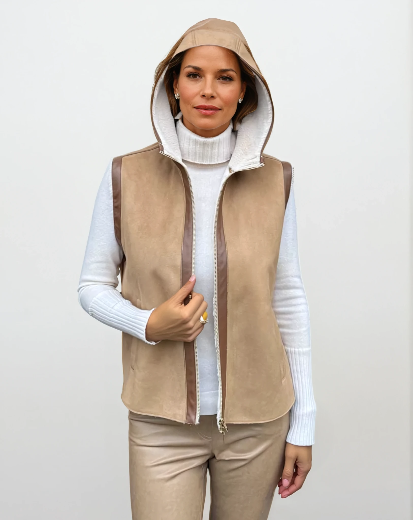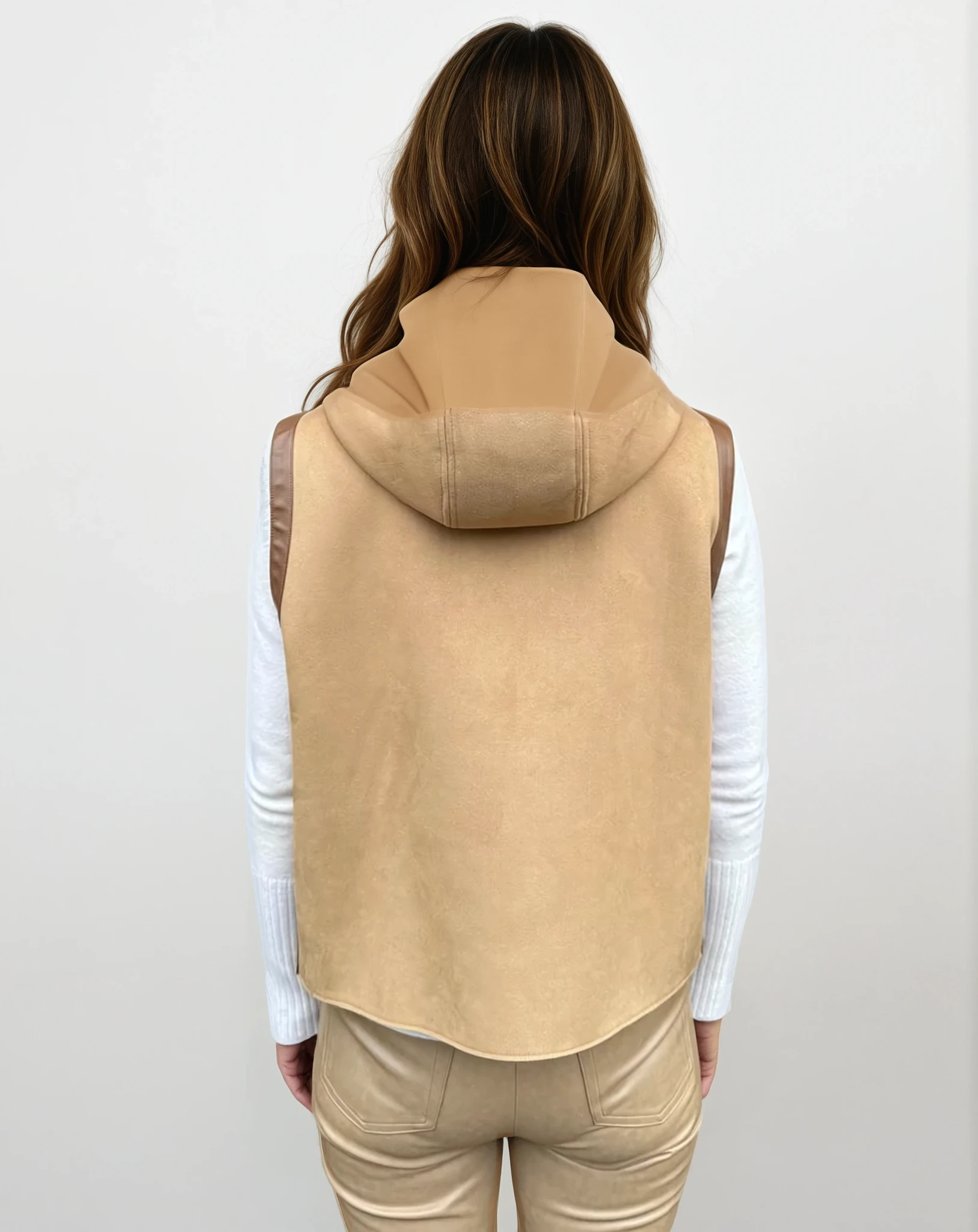 Cozy up in this luxuriously soft vegan suede vest, trimmed with smooth vegan leather and lined in plush sherpa for extra warmth. The attached hood and two-way zip make it a practical yet polished layering piece—perfect from city strolls to weekend escapes.