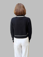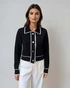 Elegant and timeless, this cropped black cardigan features contrasting ivory trim for a chic, structured look. A versatile layering piece for both casual and polished outfits.