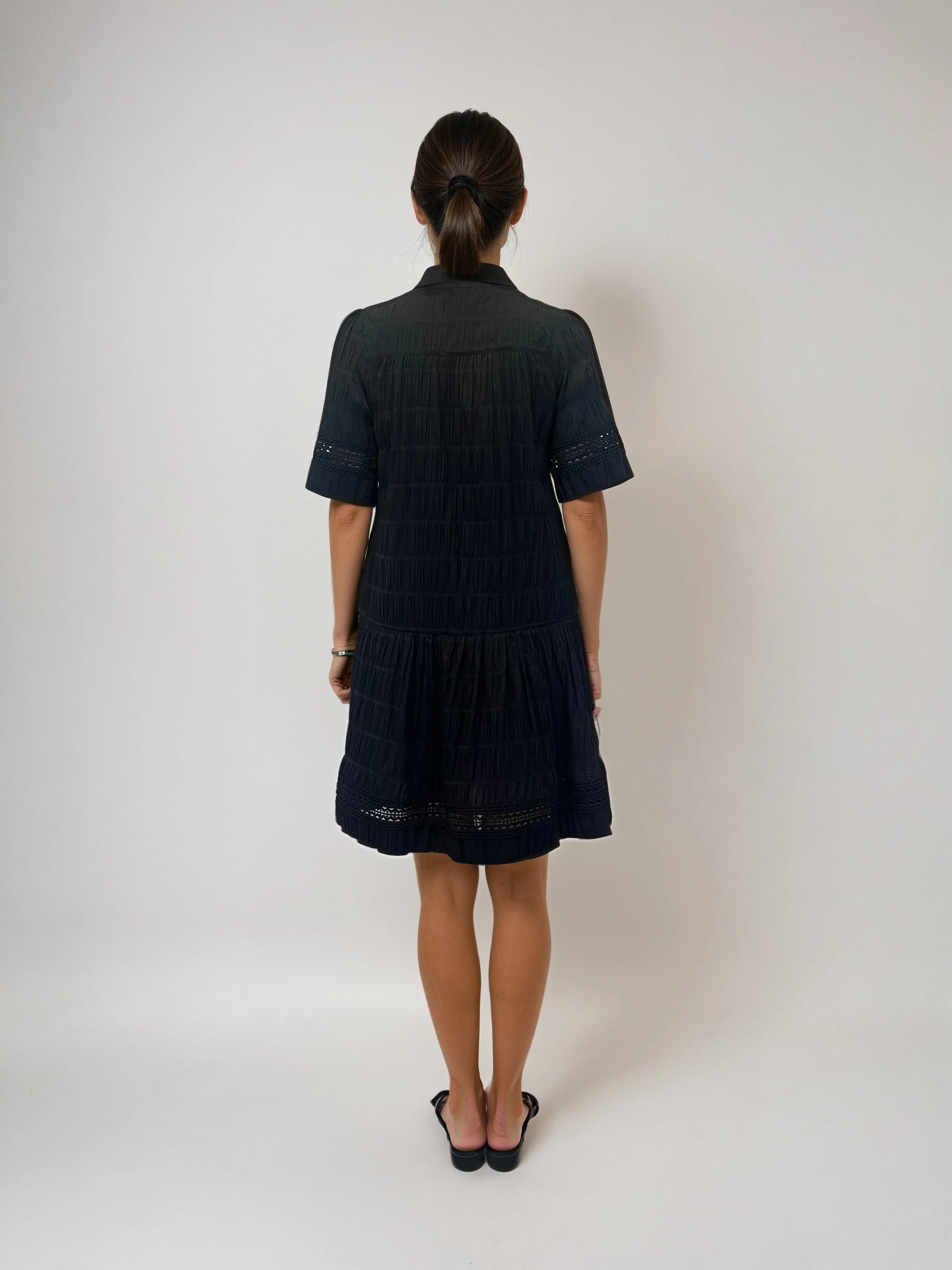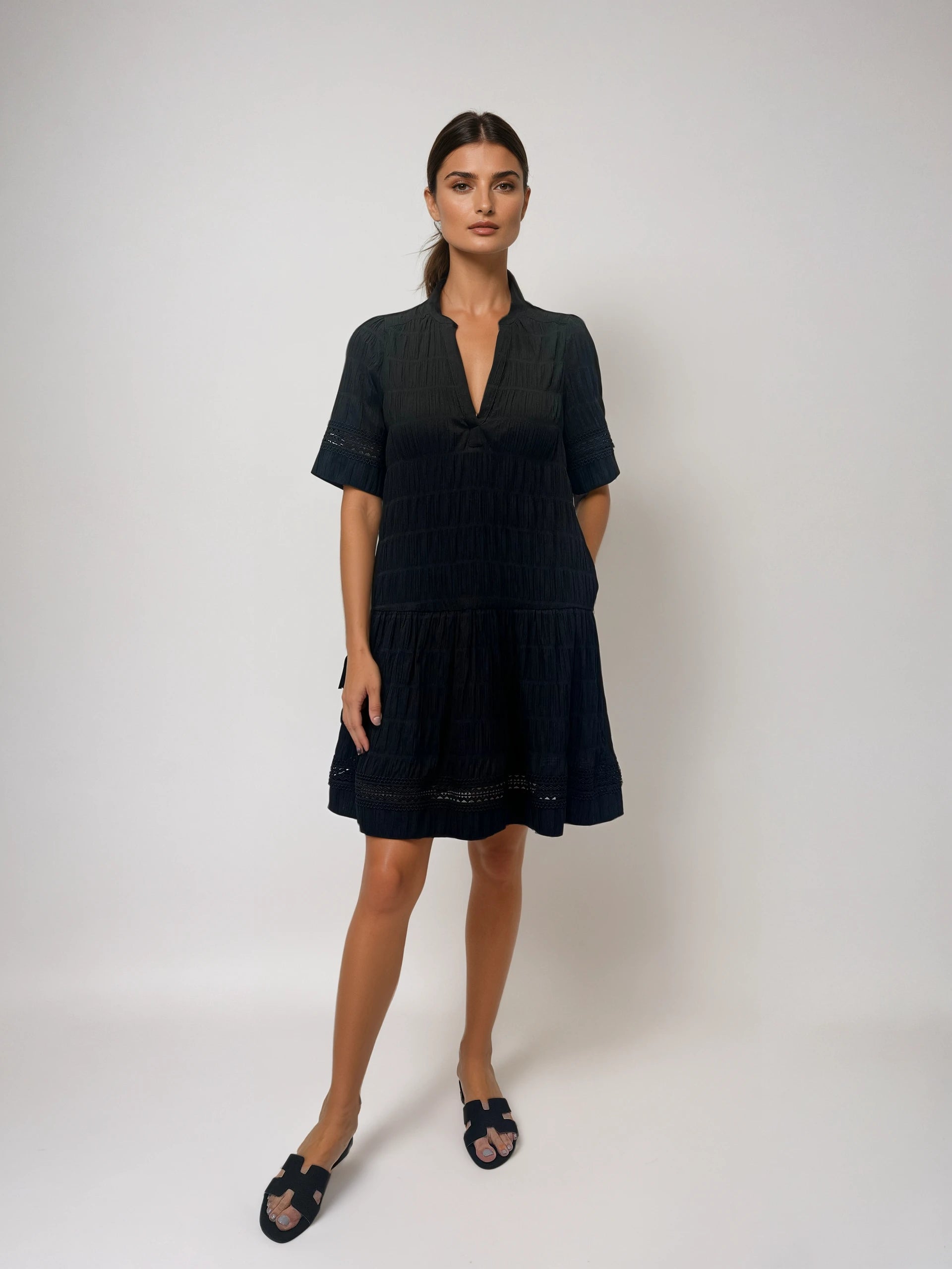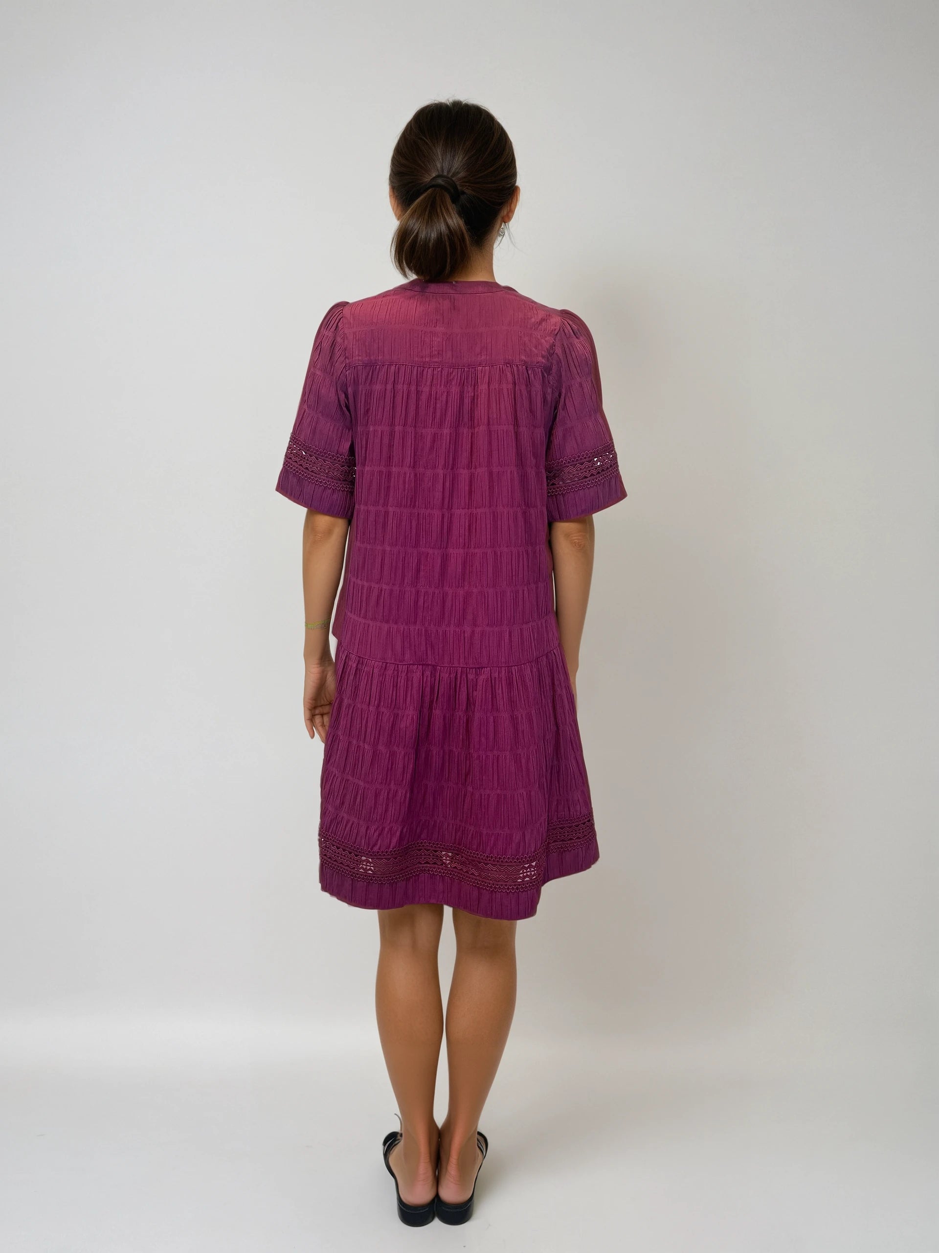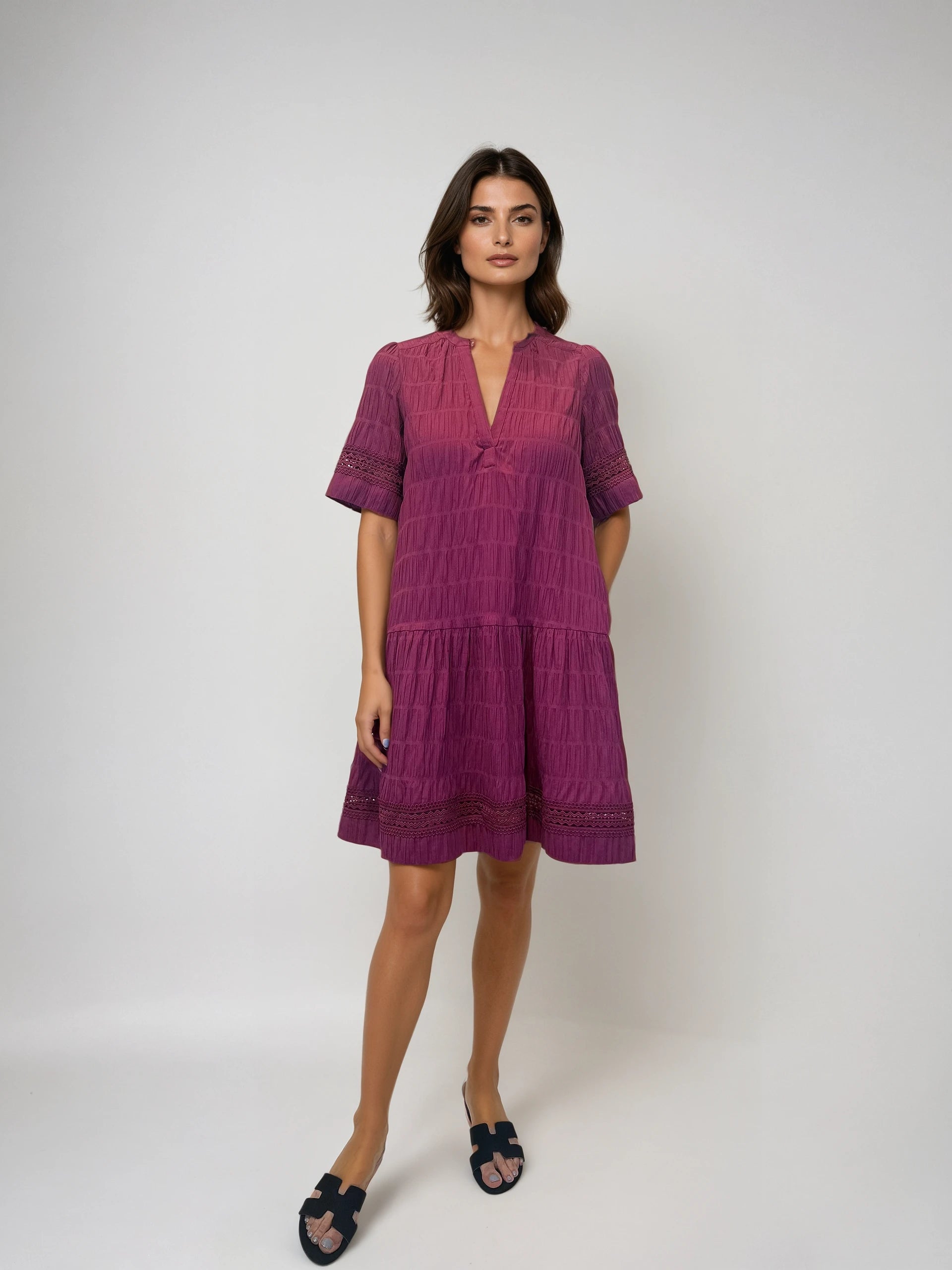 This cotton dress features a textured grid pattern, a relaxed V-neckline, and delicate lace trim on the sleeves and hem for a feminine finish.