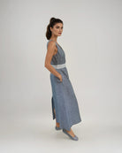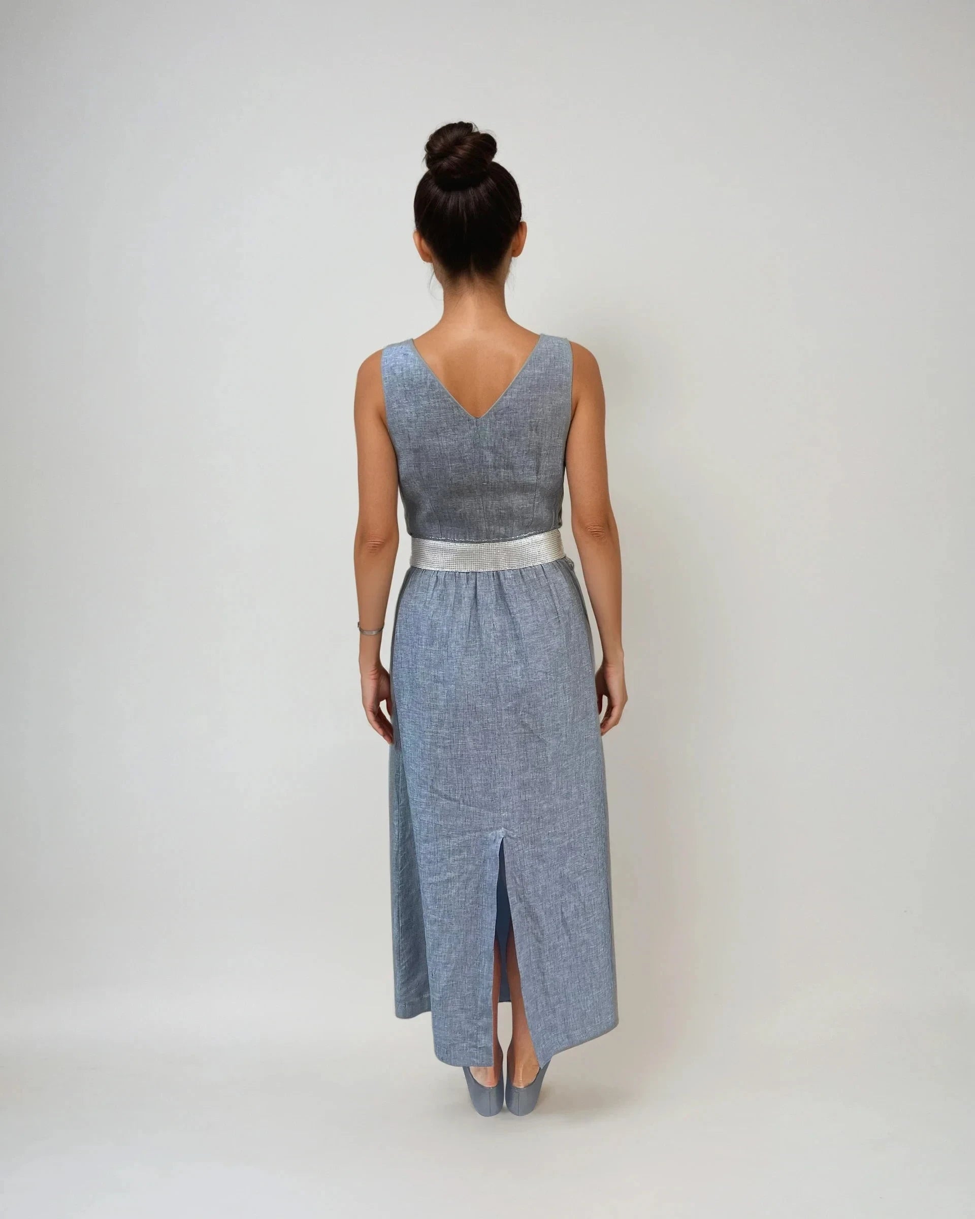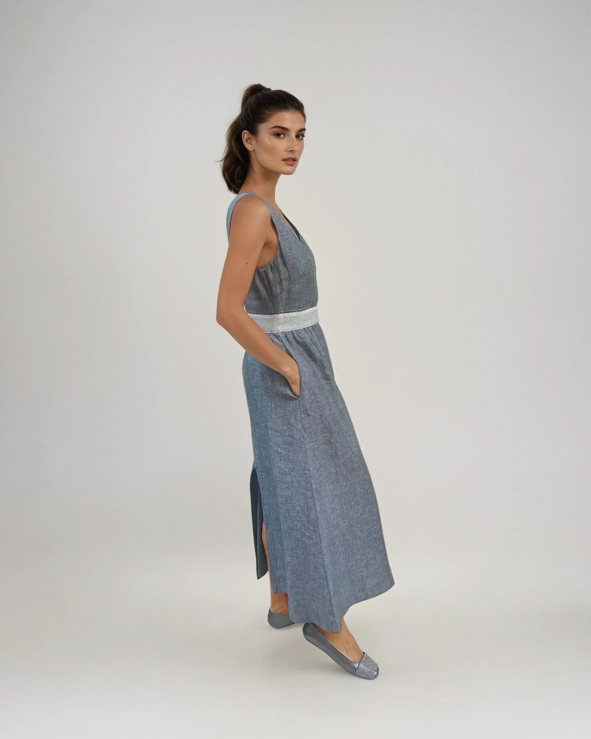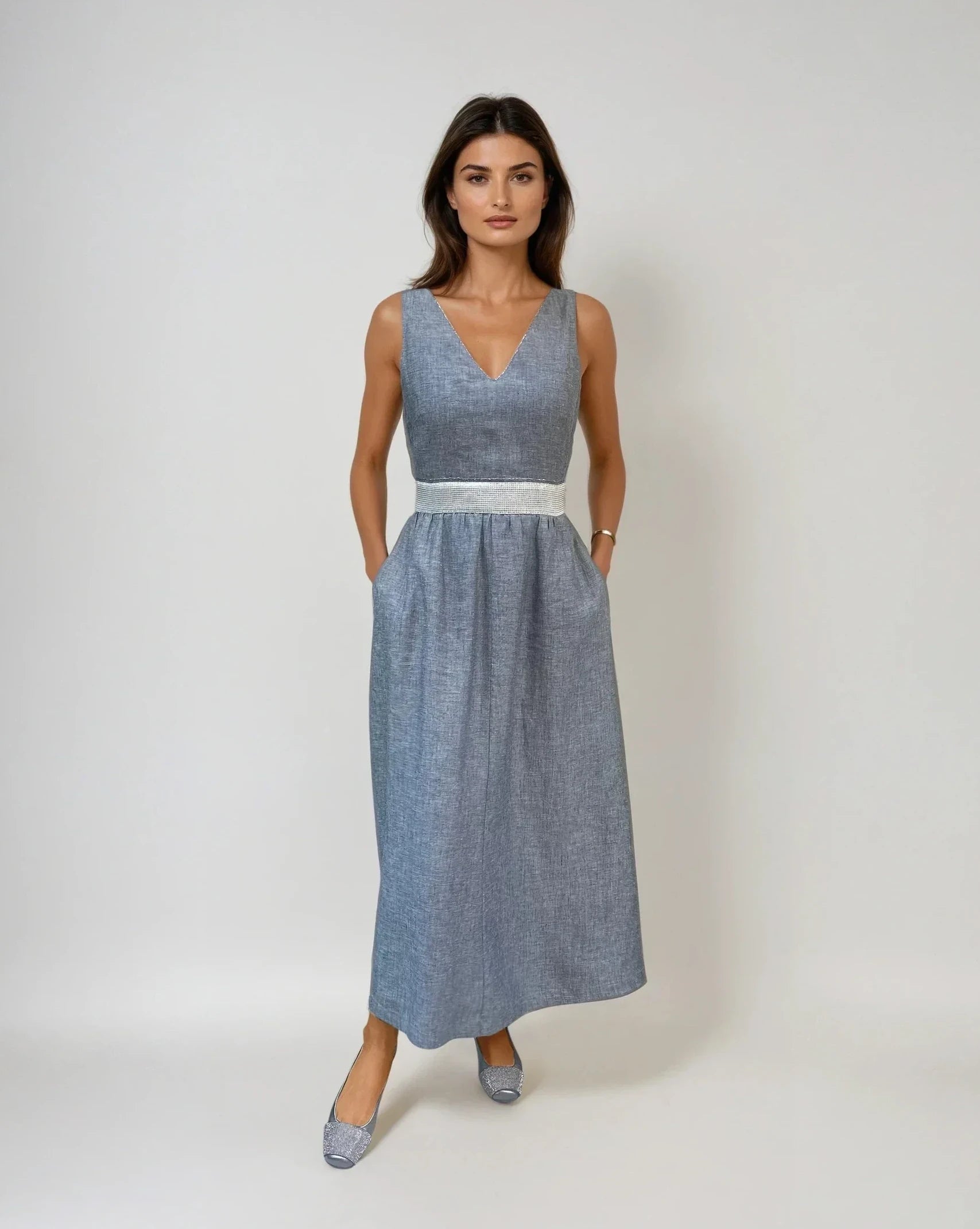 Effortlessly chic in a soft chambray fabric, this sleeveless dress features a flattering V-neckline and a gathered waist accentuated by a textured woven band. A perfect blend of casual comfort and refined detail—ideal for sunny days or relaxed evenings.
