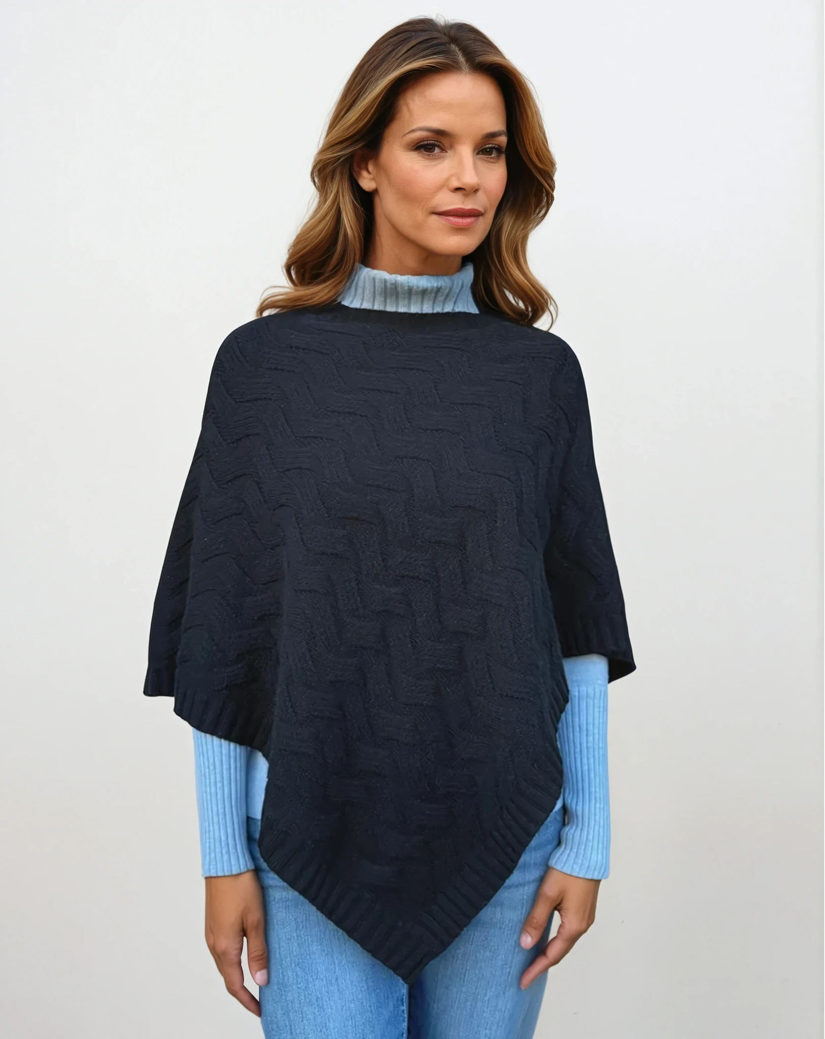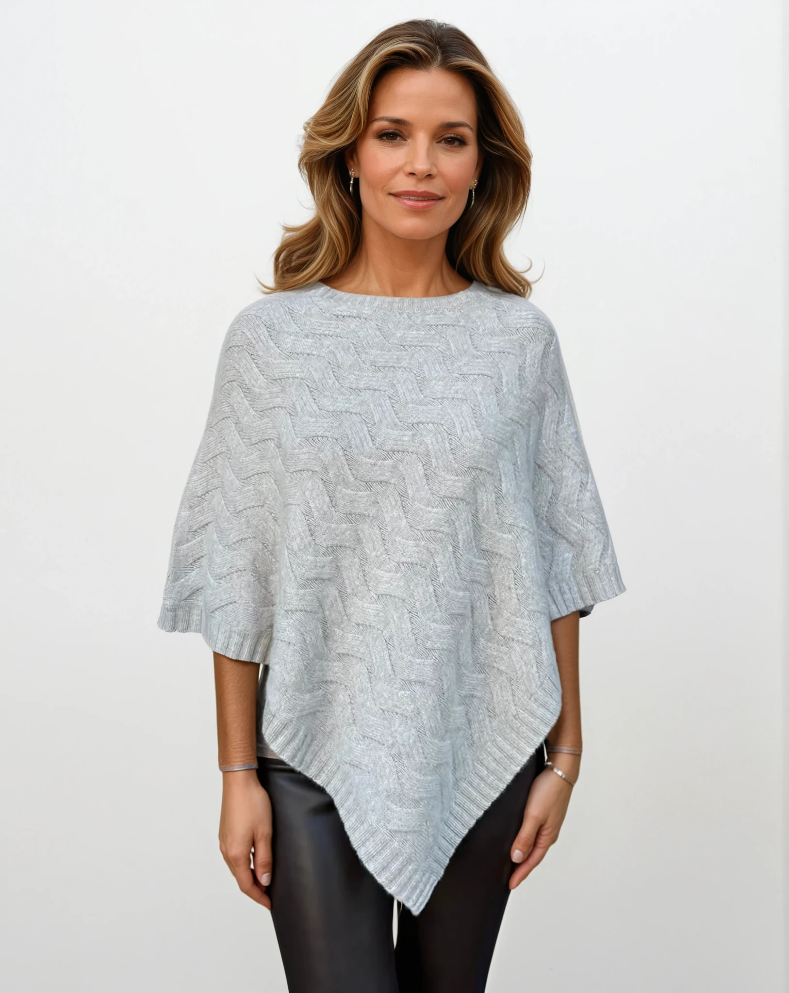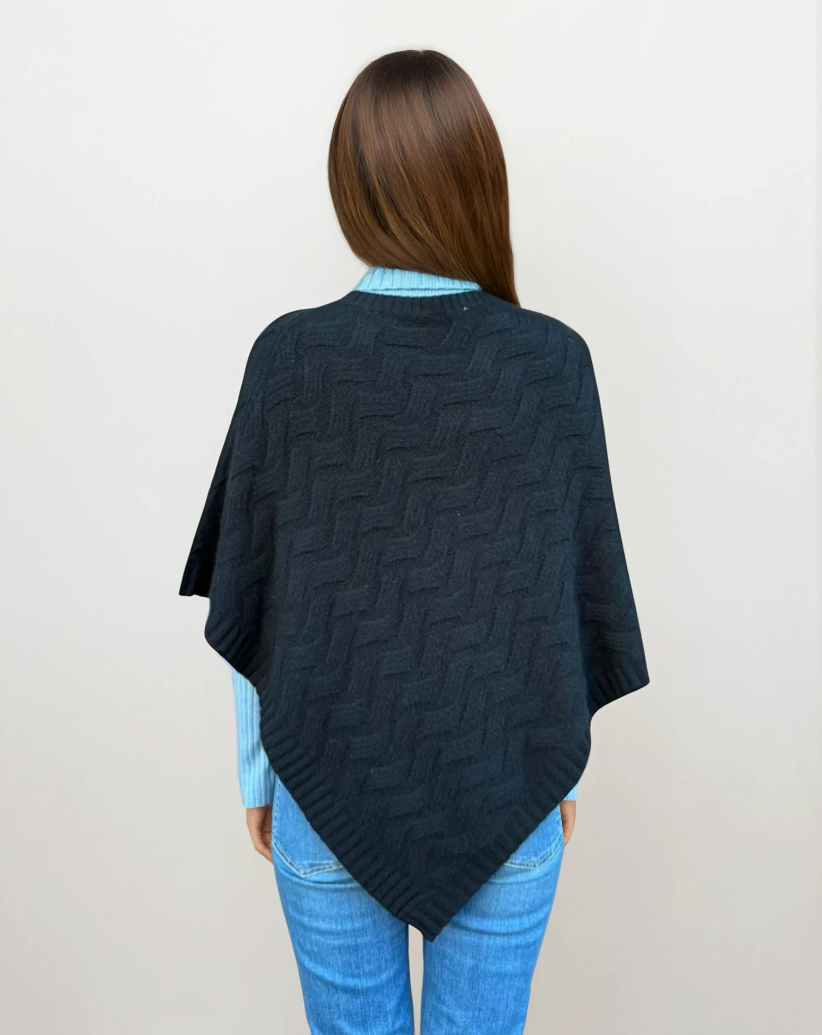 This pure cashmere poncho is a timeless layering piece, crafted in a beautifully textured chevron knit. Its flowing asymmetric silhouette drapes effortlessly over the shoulders, adding warmth and refined elegance to any look. Lightweight yet luxuriously soft, it transitions perfectly from casual days to cozy evenings.