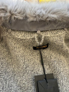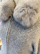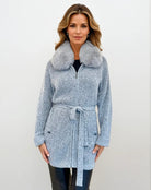 Elevate your winter wardrobe with this luxurious Max & Moi longline cardigan, crafted in a soft light grey cashmere blend. Designed with understated elegance, it features a sumptuous detachable fox fur collar, adding both warmth and sophistication. The belted waist creates a flattering silhouette, while front pockets and a full zip closure combine practicality with modern style. Finished with subtle tonal sequins woven into the knit, this piece offers just the right touch of shimmer for day-to-night versatility. A timeless investment, perfect for layering over leather leggings, denim, or tailored trousers.